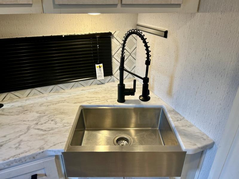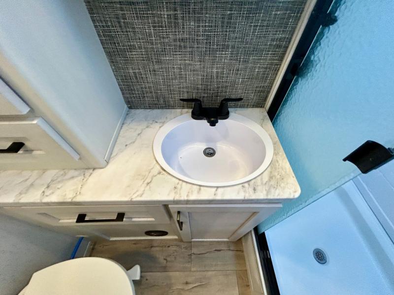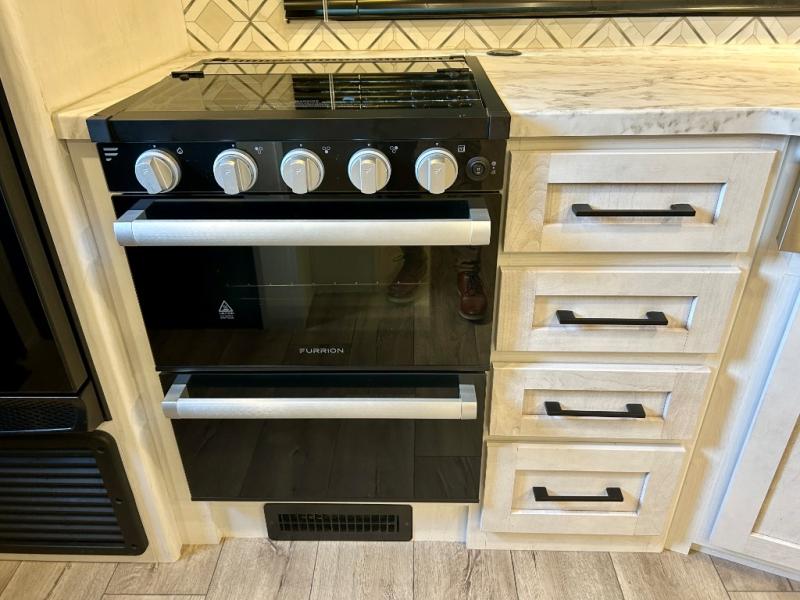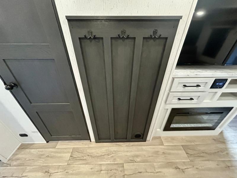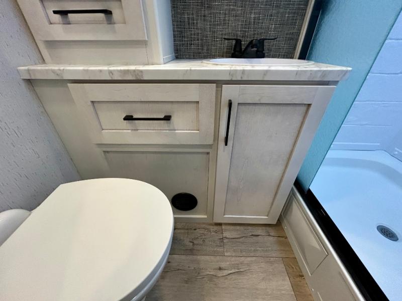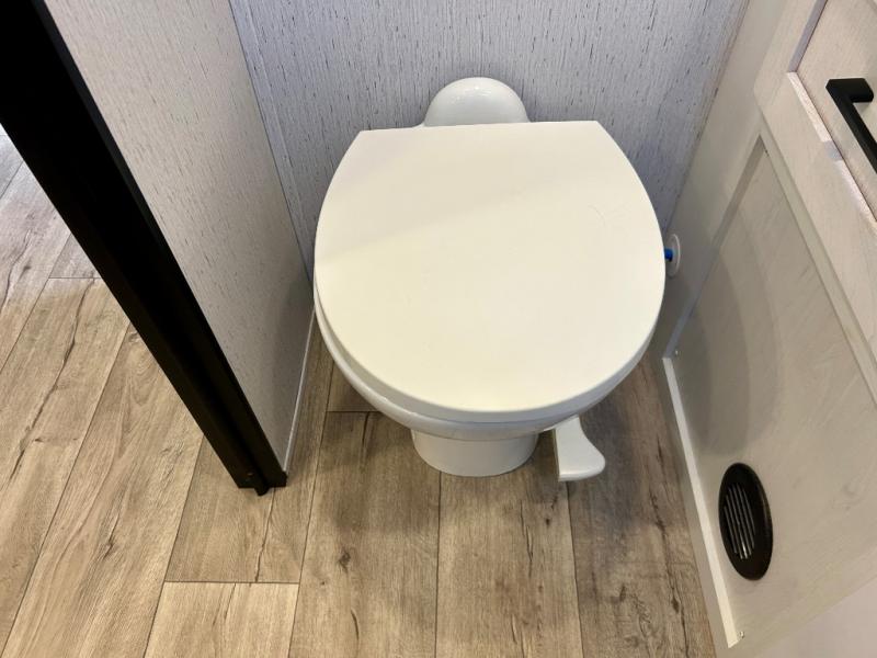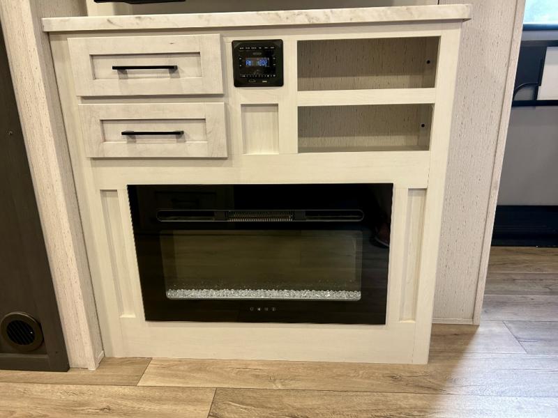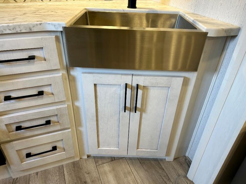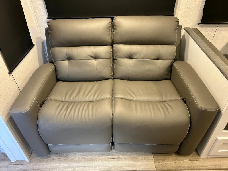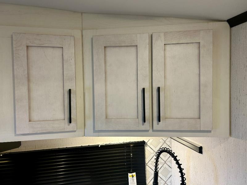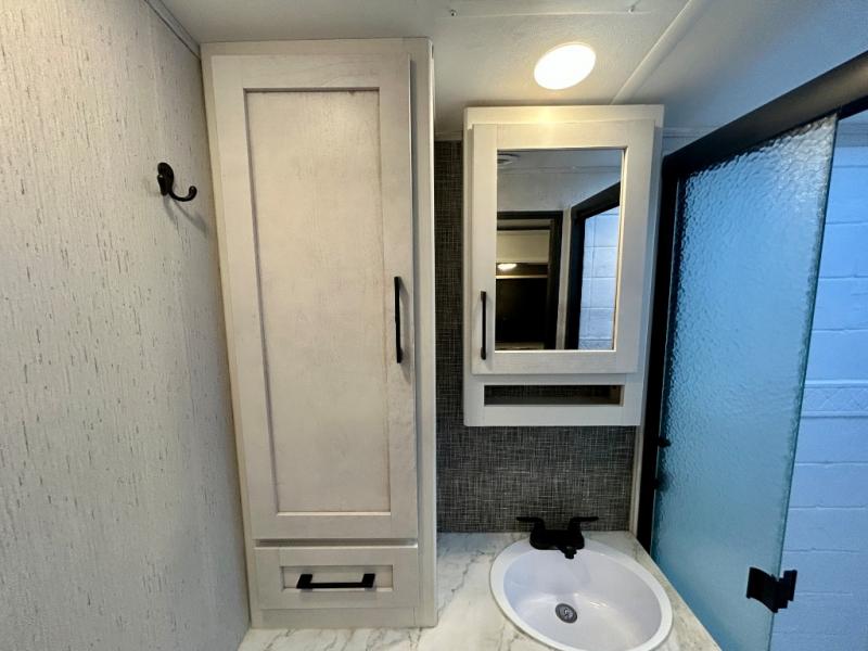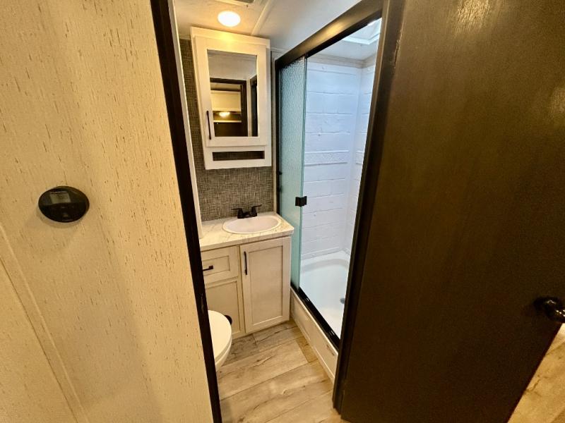 Step right in to this spacious rear kitchen travel trailer for unforgettable camping trips! The rear kitchen includes a three burner cooktop with an oven and glass cover, a microwave oven, and a 10 cu. ft. 12V refrigerator for perishables. Within the large slide out, you can dine at the booth dinette and relax on the theater seats after dinner. There is also an HD LED TV across from the sofa for easy viewing. The second slide out is found in the front bedroom, along with a king bed, storage space, and a front seating space. You'll also find plenty of storage throughout, including exterior storage and an entry closet to keep jackets, food, and more!