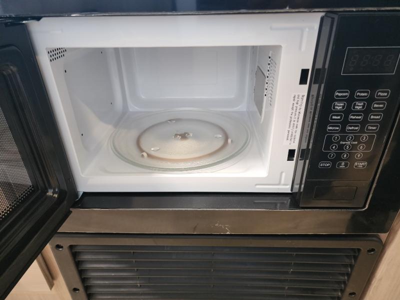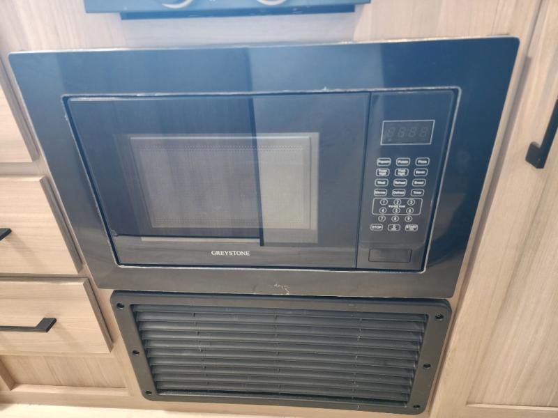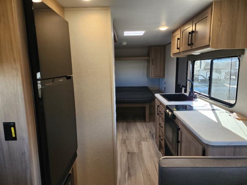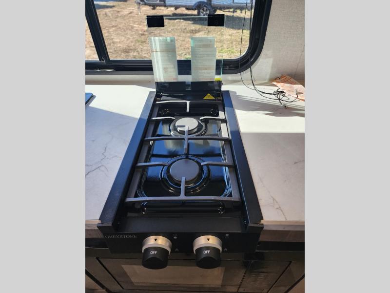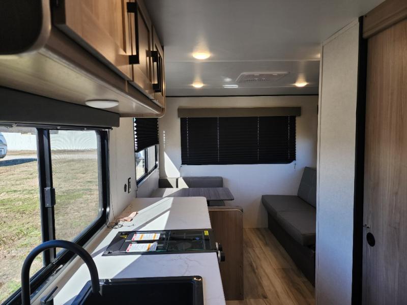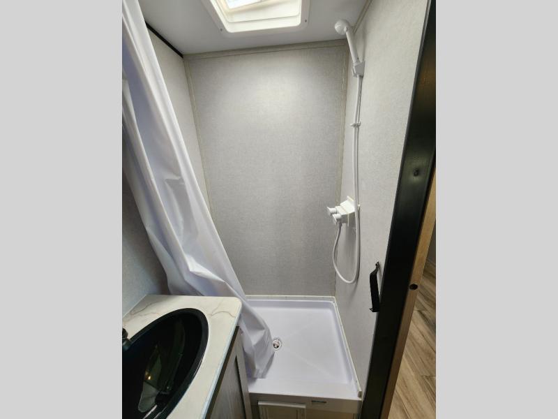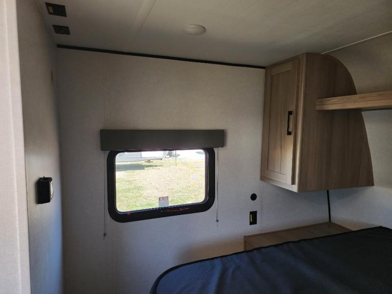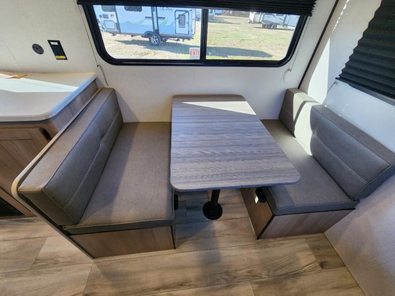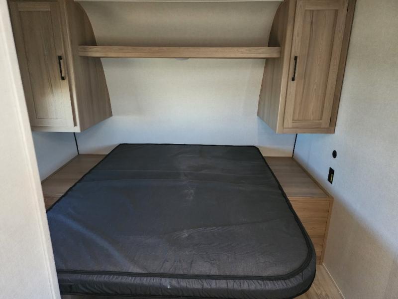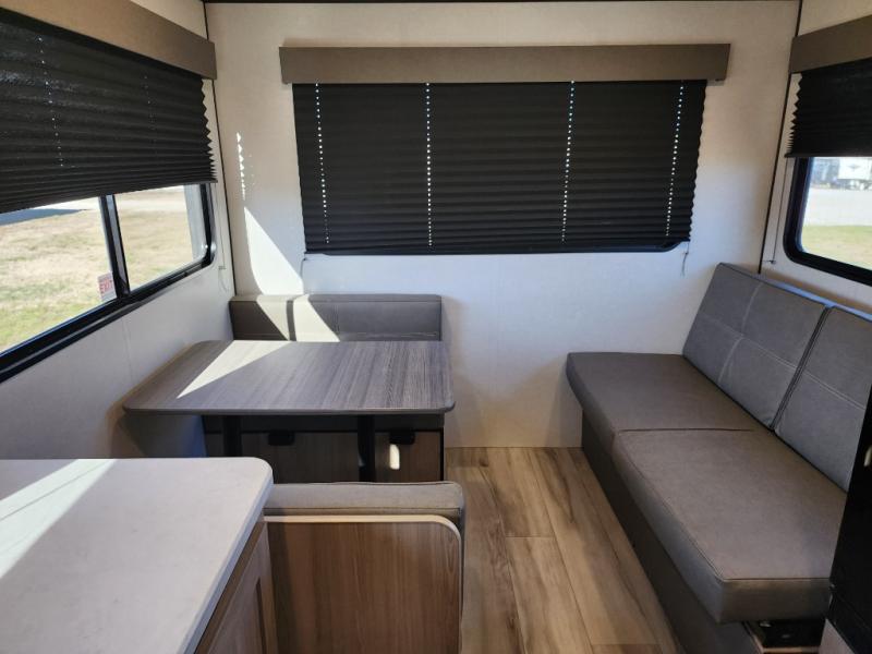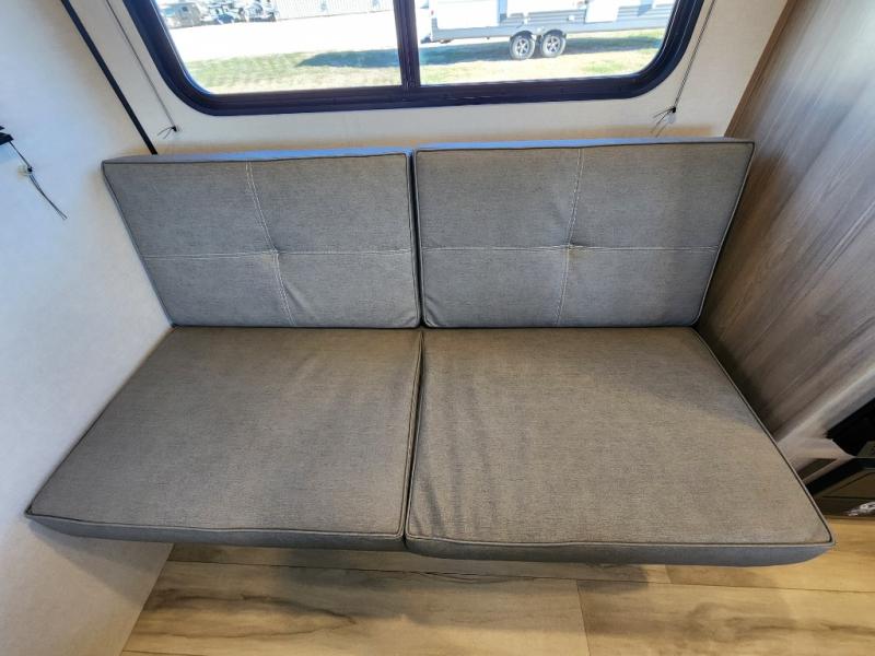 After making dinner on the two burner cooktop or microwave, you can dine at the booth dinette or outside under the power awning if you brought along your camping chairs. Either way you will be comfortable and the dinette can even be converted to sleep one person if needed. After playing outdoors all day, everyone can return to get cleaned up in the full rear bath including a walk-in shower. There is even a linen closet and space for some clothes that hang. You will get a great night's rest on the front queen bed, and the booth dinette can double as sleeping space for an extra guest or two!
