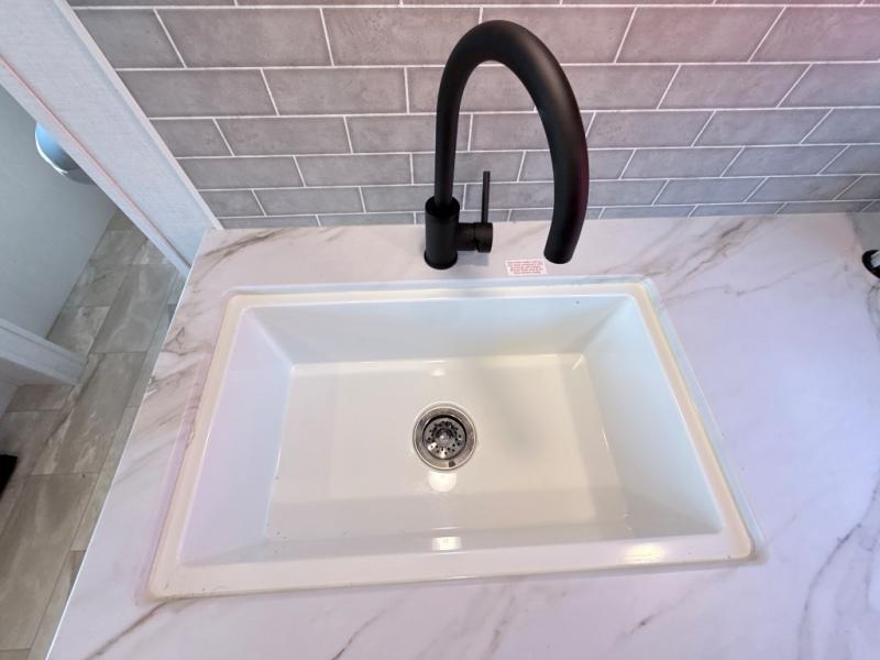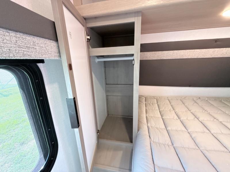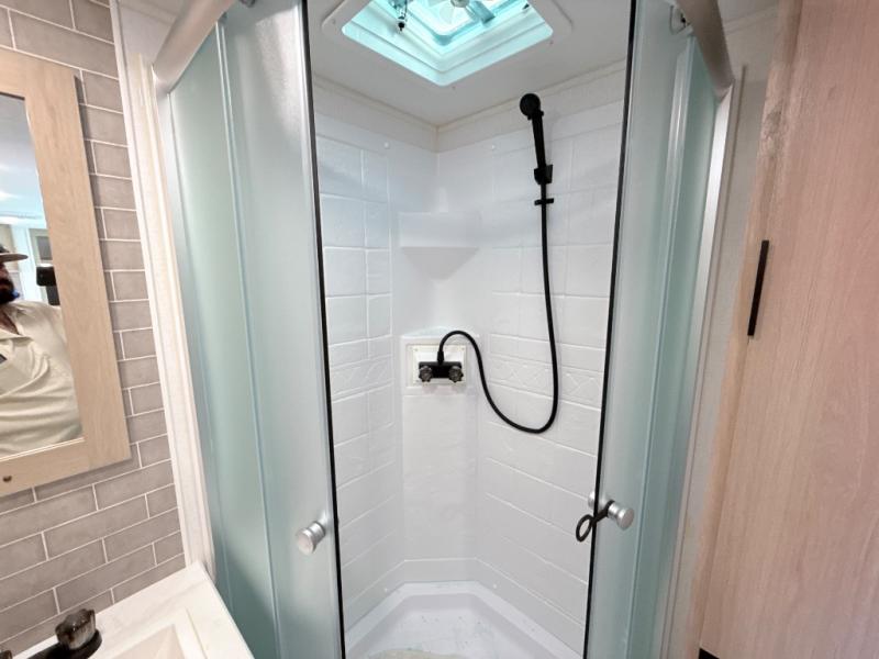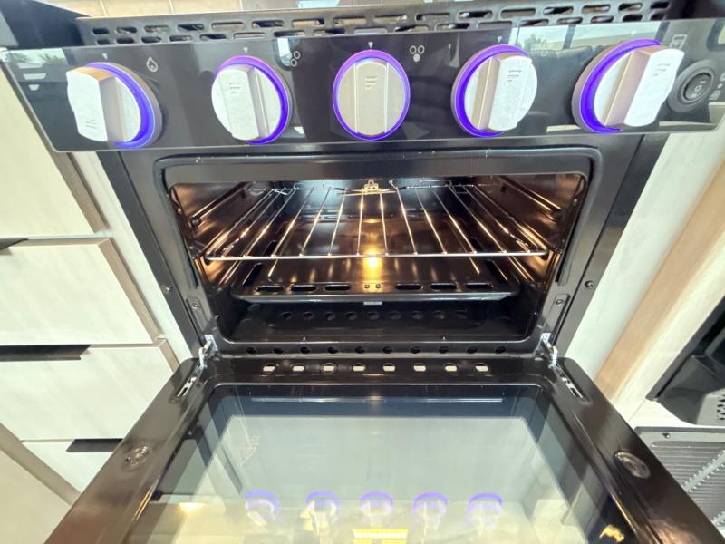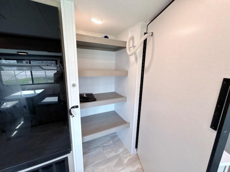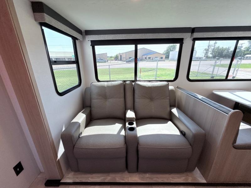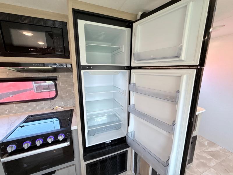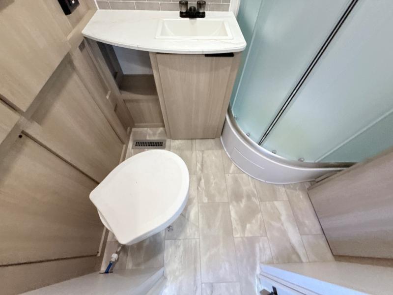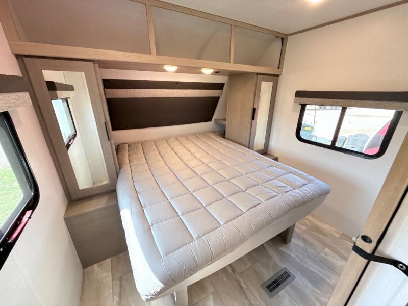 A full rear bath on board this cozy travel trailer will add privacy and convenience you won't want to camp without. The large slide out in the main living area will provide plenty of space to let the chef whip up breakfast on the cooktop, and your crew can get comfy on the theater seats. The 10 cu. ft. 12V refrigerator will allow you to pack your favorite cold ingredients, plus there is a hidden pantry behind the hinged entertainment center for smart storage spaces. This model also includes a front private bedroom with a queen bed, just like at home!