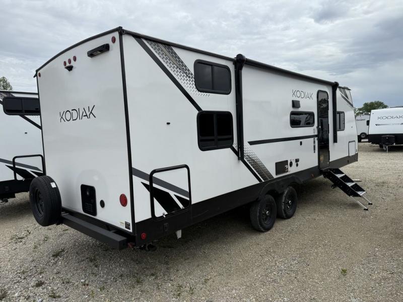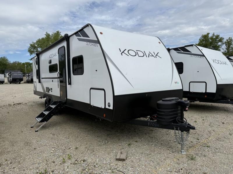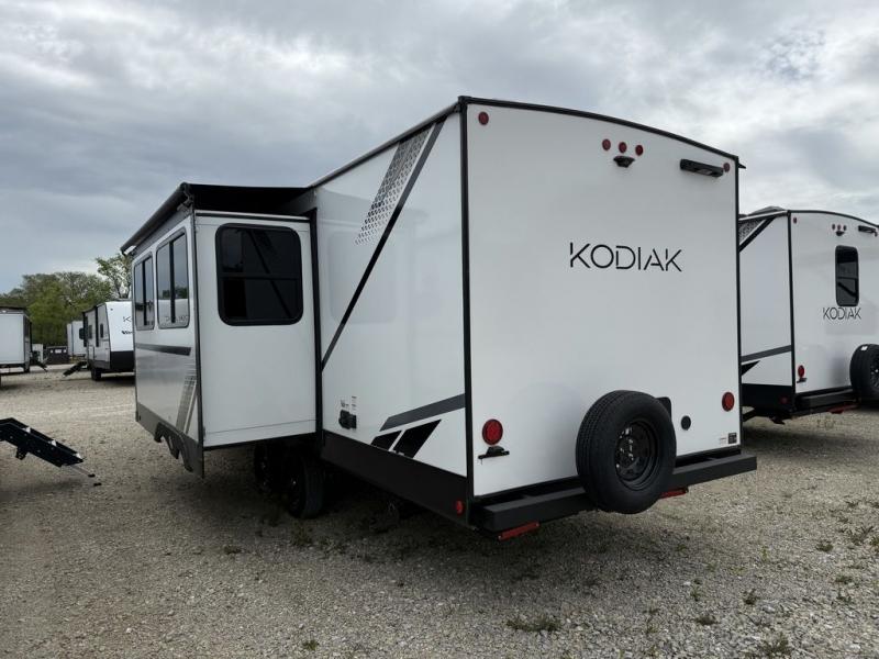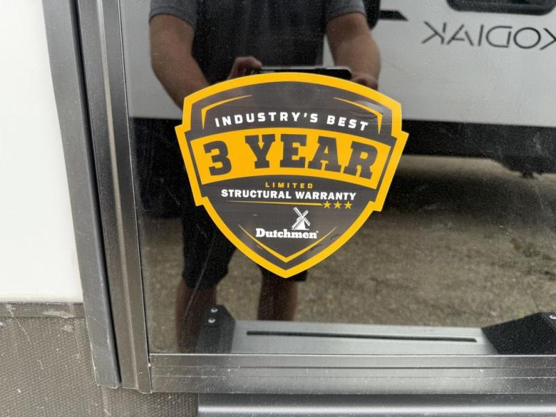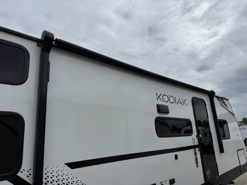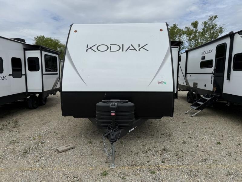 Each Kodiak travel trailer by Dutchmen includes a diamond front plate, easy lube axles, and a power tongue jack for hassle-free towing. The bear cave storage will allow you to bring along all the camp gear, and the power awning with an LED light will create an inviting outdoor space. Head inside to enjoy the designer valances, blackout roller shades, and seamless countertops. There is also HyperDeck flooring that will withstand your many adventures plus a 6' 8" interior height for more head room. A high output furnace and 13.5k BTU A/C will keep you comfortable, and the on-demand tankless water heater will provide instant hot water when you need it!