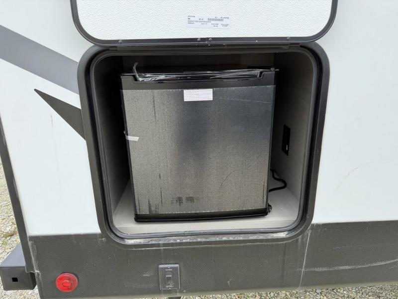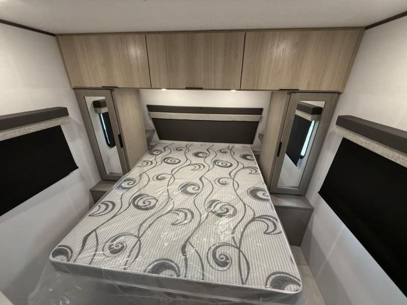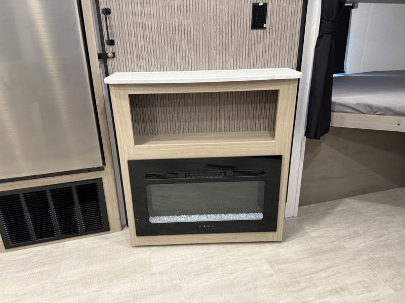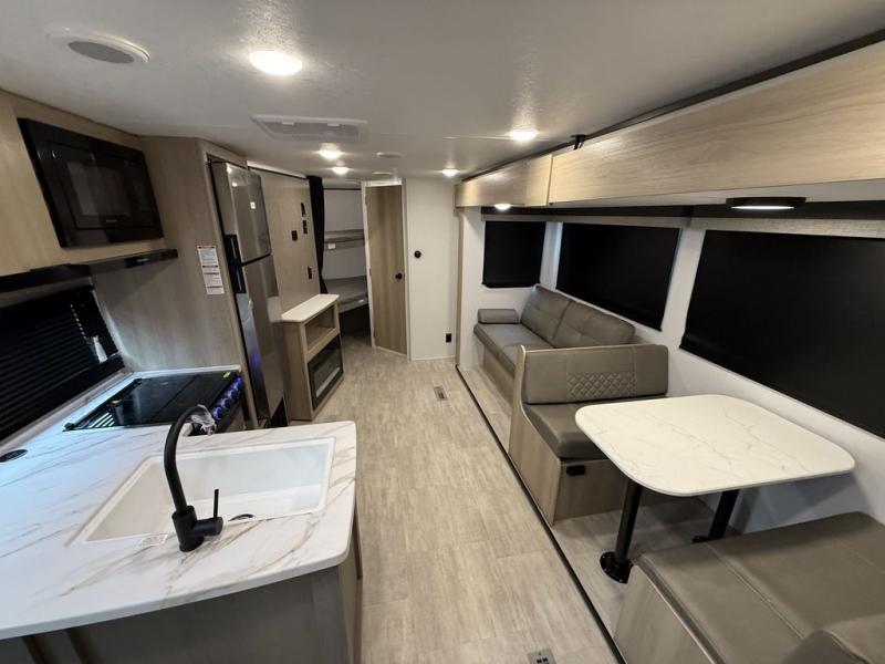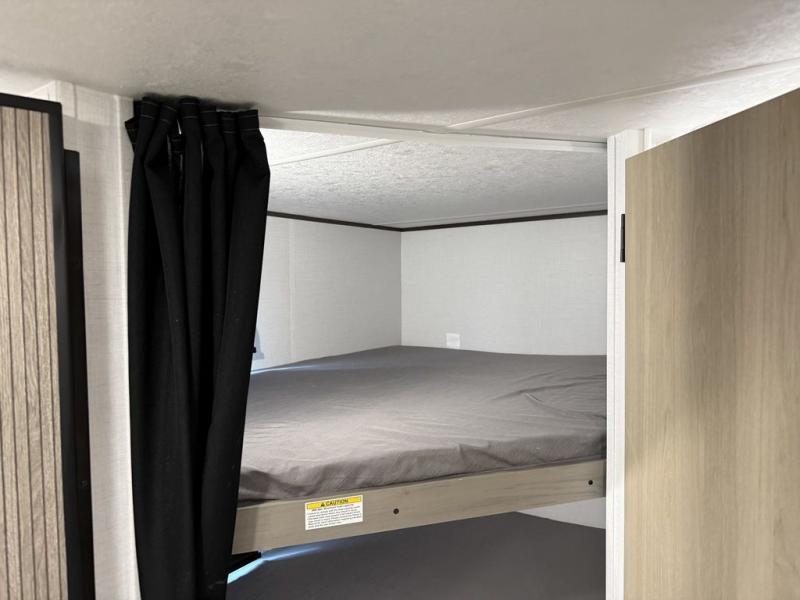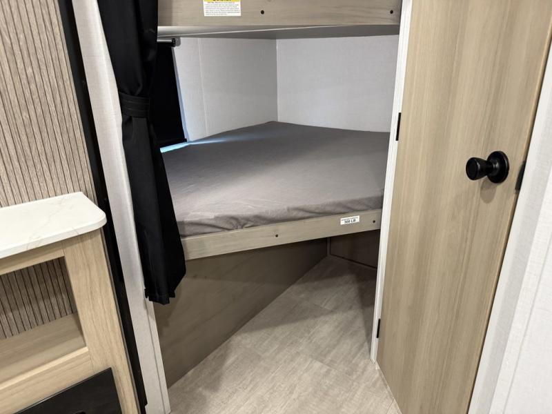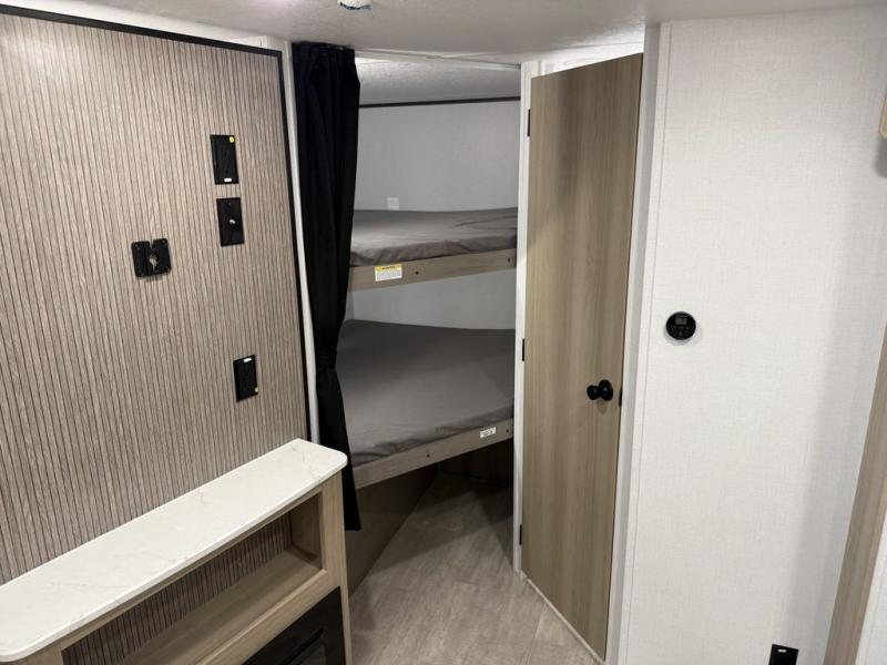 This bunkhouse model is perfect for weekend excursions or extended getaways at your favorite state park. You will have your own queen bed up front with storage space for your things, and the double-size bunks in the back will be perfect for guests. Prepare your meals on the cooktop or in the microwave oven, and you can dine together at the booth dinette. The dinette can also be used as additional sleeping space for one guest or two kids. Outside, a 14' power awning will provide some shade, and an outdoor refrigerator will keep cold drinks close by!