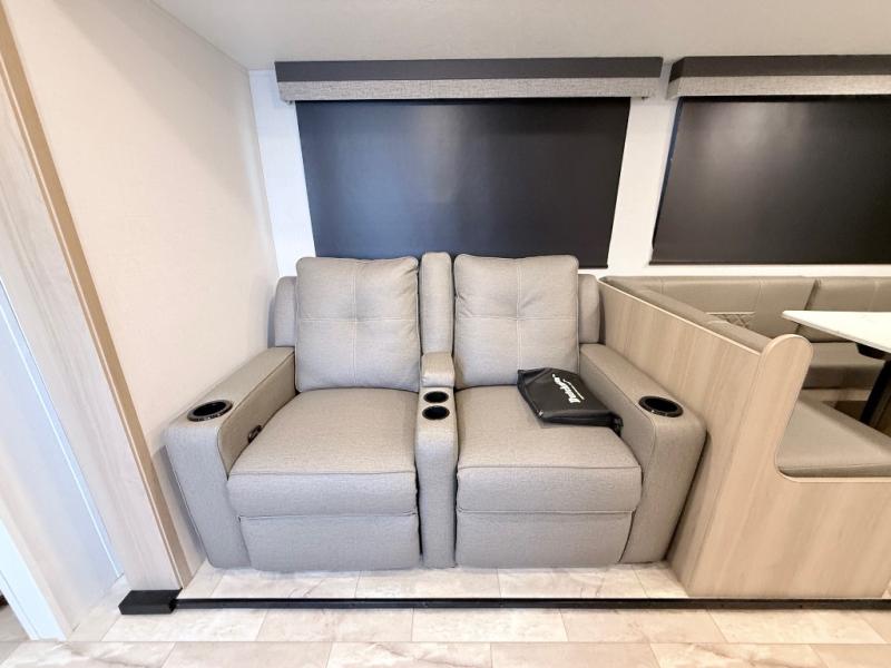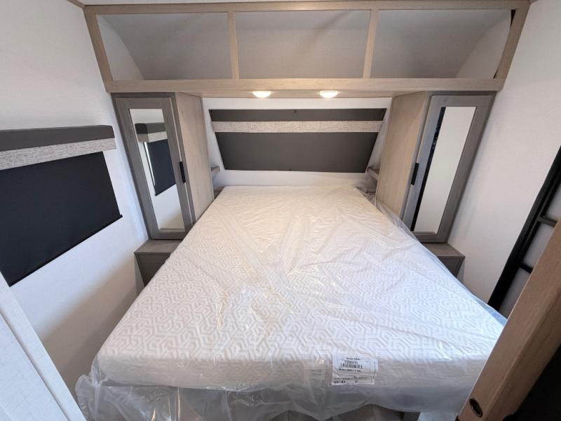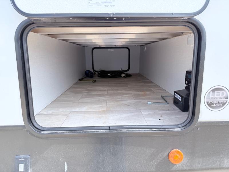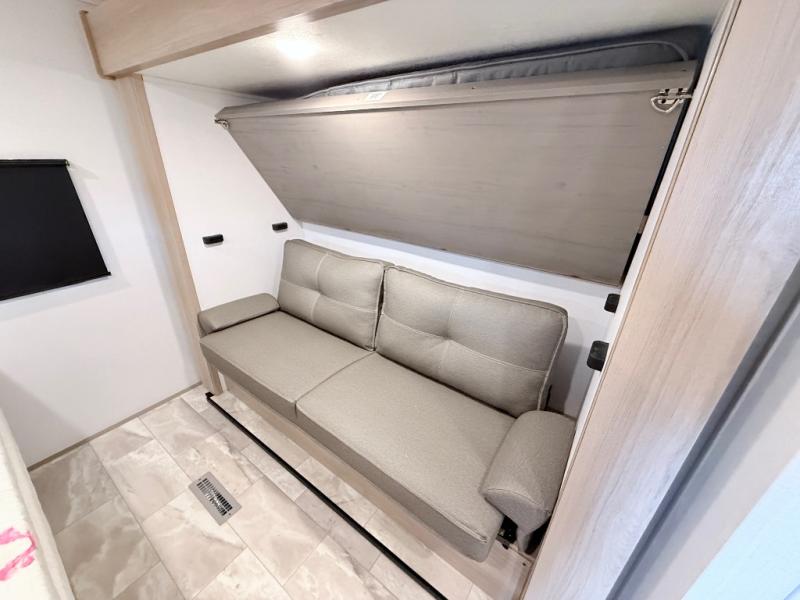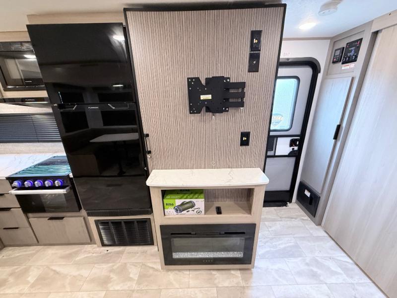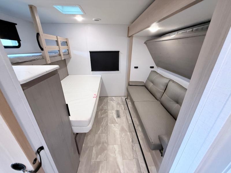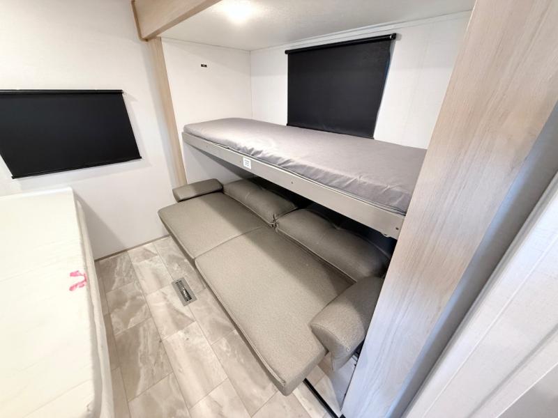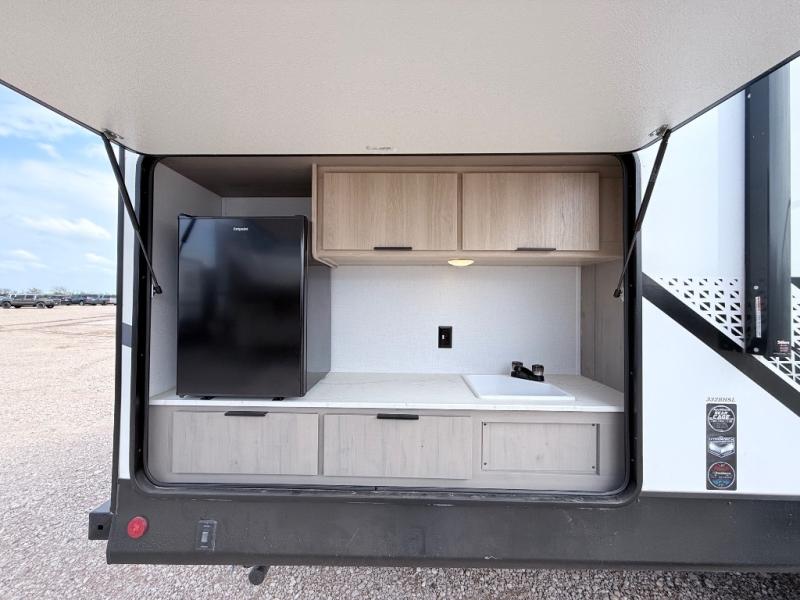 It will be so easy camping with friends in this spacious travel trailer with double slides and a rear private bunkhouse. Once you're set up at the campsite, prepare lunch on the outside kitchen and relax under the 18' power awning with LED lights. You may just decide to grab the fishing poles from the pass-through storage and head down to the river. Everyone can meet in the main living area around the U-shaped dinette or on the jack knife sofa with a foot rest, and the fireplace here will make it feel more like home.