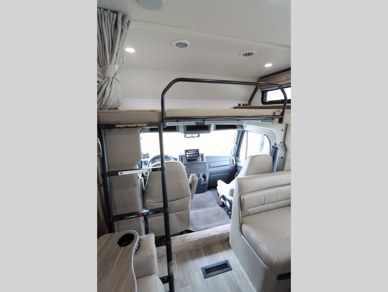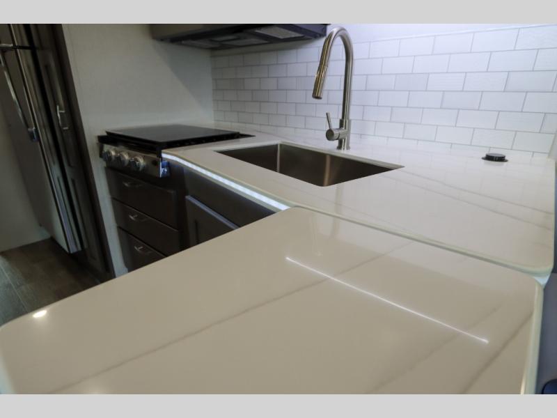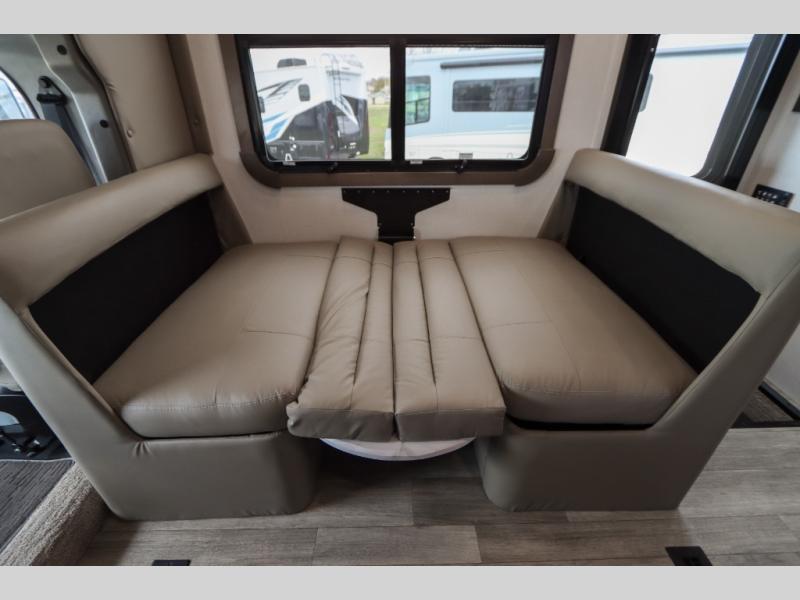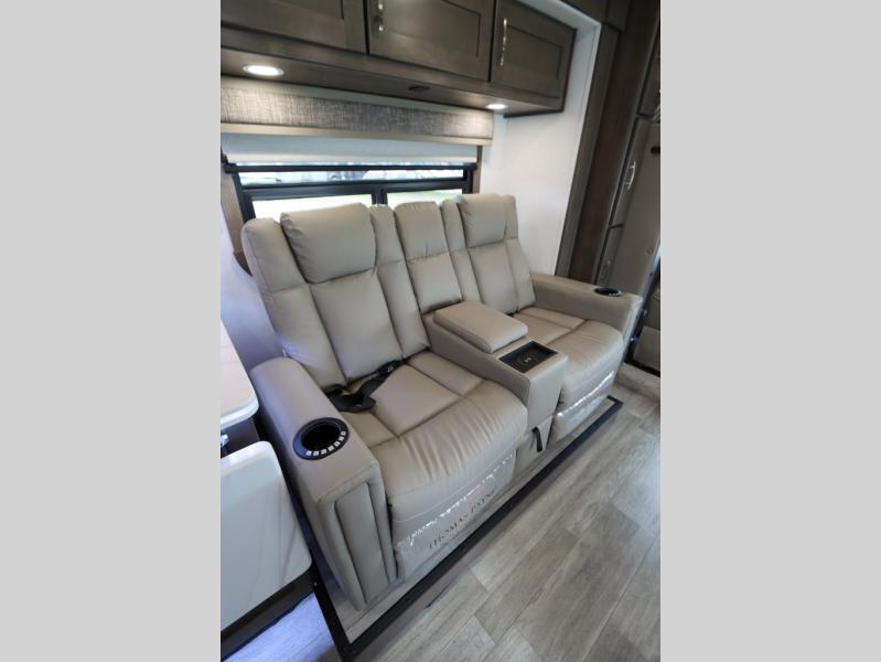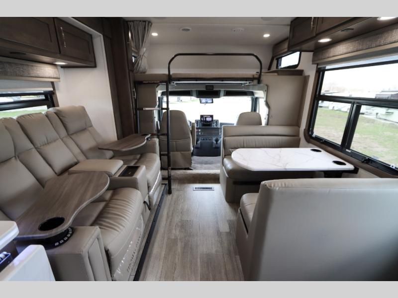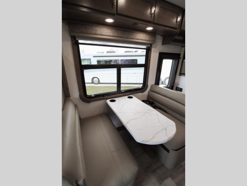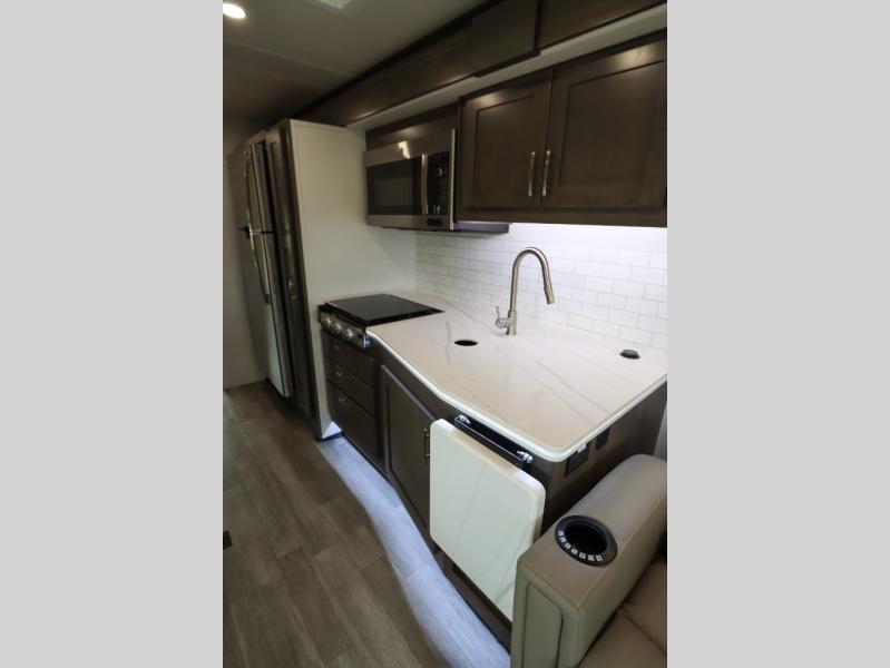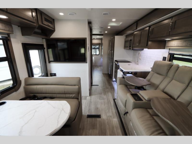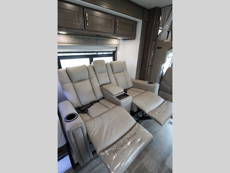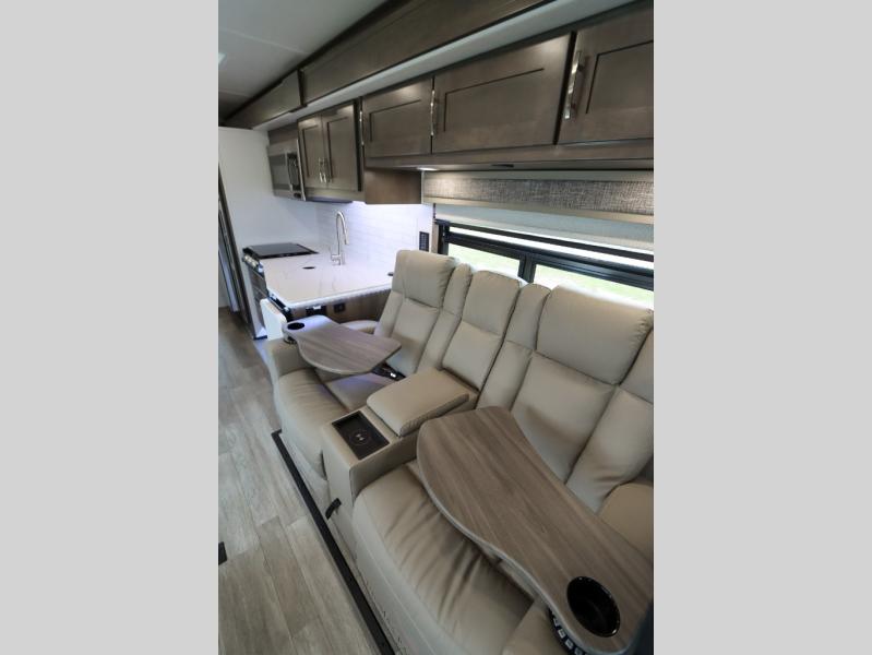 The Europa Super C diesel motorhome by Dynamax is coming to you with all the power, durability, and luxury you need for your adventurous lifestyle. You will love the solid surface countertop with LED edge lighting in the kitchen, the premium vinyl flooring throughout, and the clean, contemporary styling. The on-demand water heater is a luxury you won't want to travel without, and the multiplex wiring with a touch screen command center includes switch panels, and Bluetooth Smart Phone app control for ease of use. There are dual12V 8D AGM deep-cycle maintenance-free house batteries and a single 200-watt solar panel to go off-grid if you choose, and the 12,000 lb. trailer hitch will allow you to bring along the off-road toys. Some of the exterior features that make this coach great are the armless patio awning with LED lighting, the automatic four-point hydraulic leveling jacks, and the eye-catching custom full-body paint package!