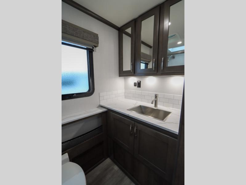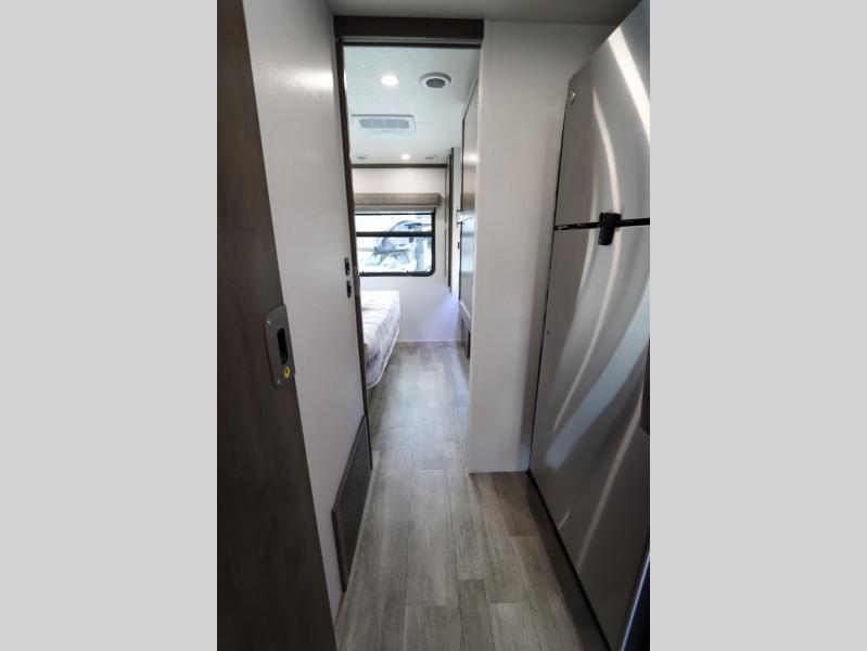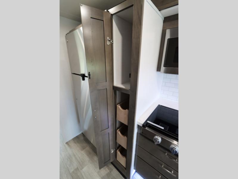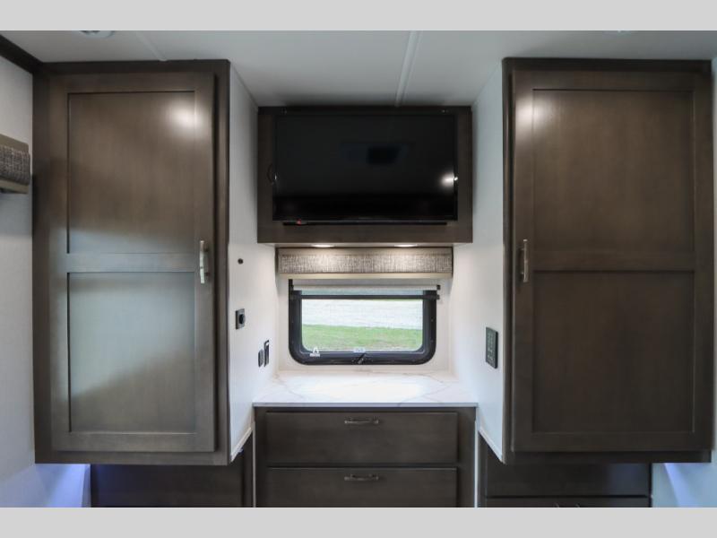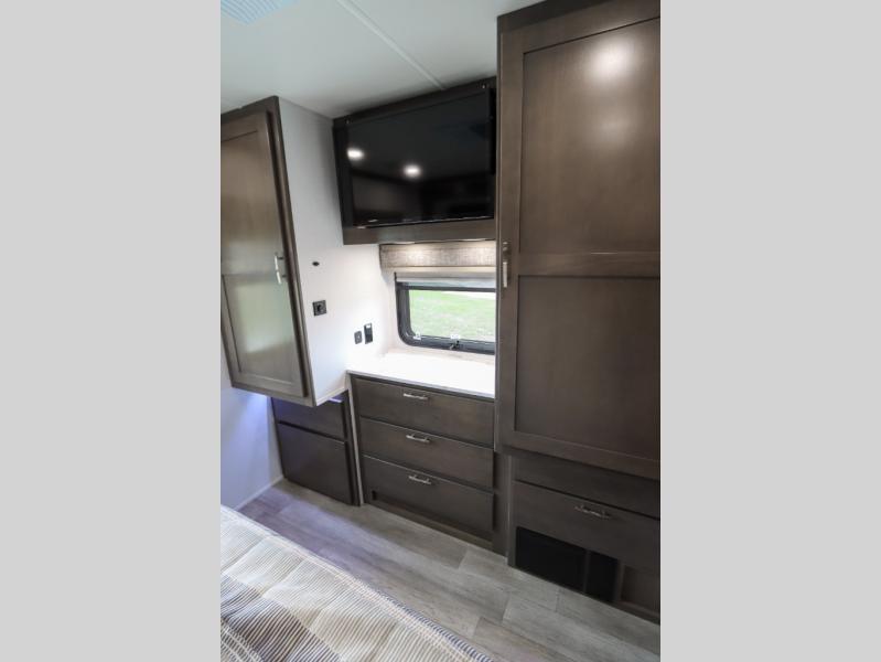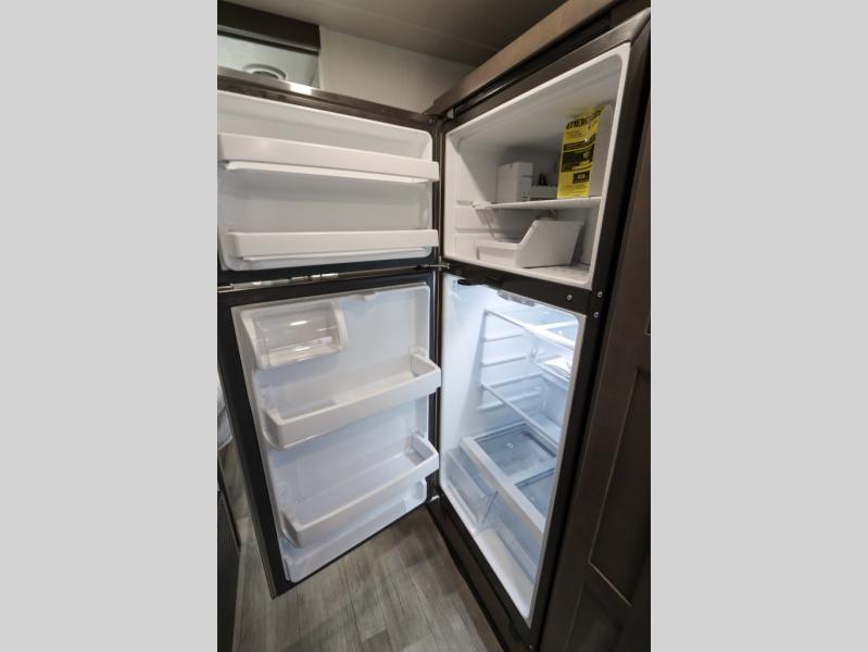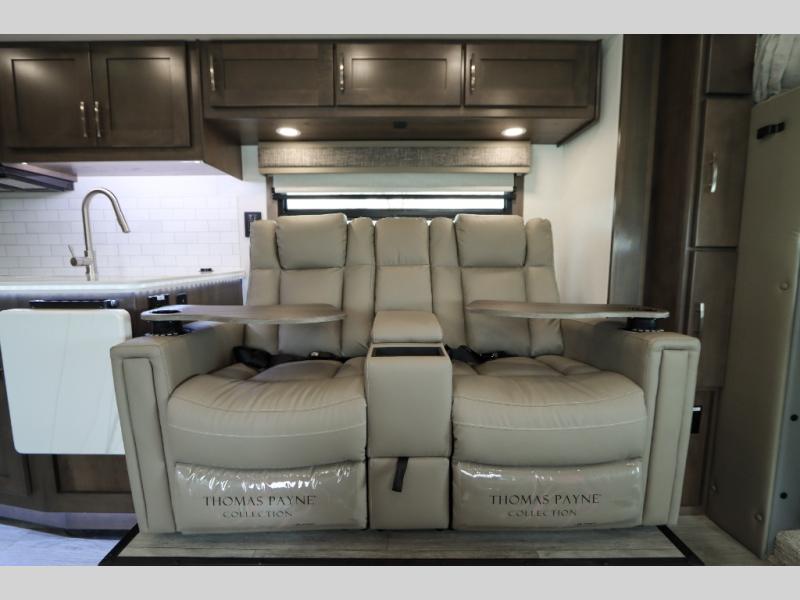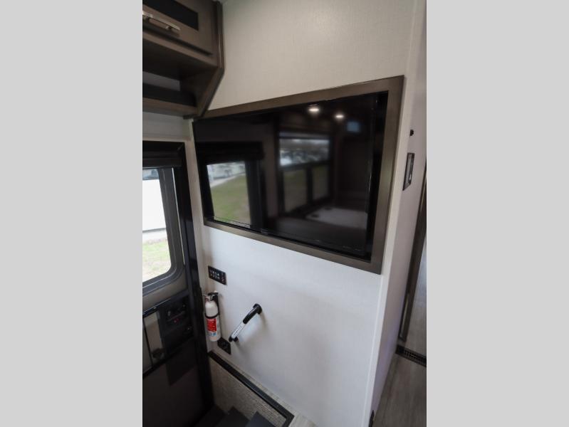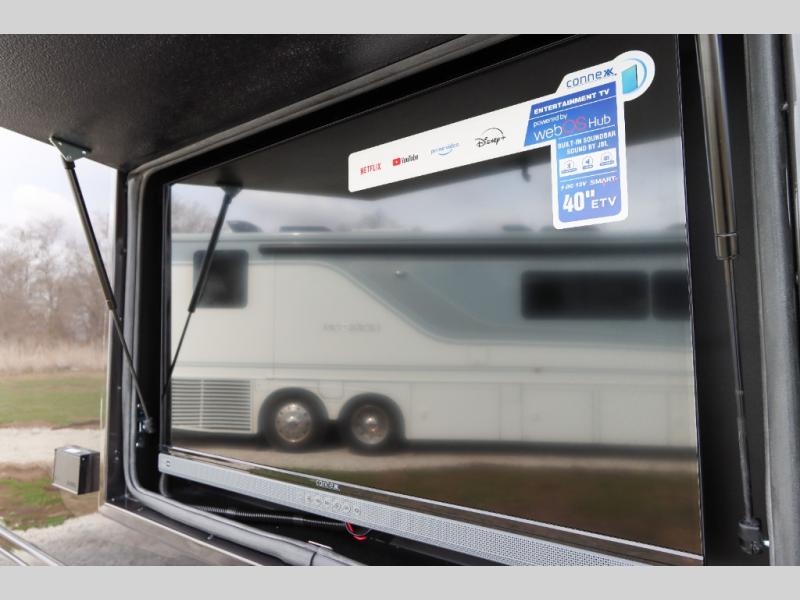 Whether you plan to go near or far, you'll stay comfortable in this spacious coach! There is a king bed slide out in the rear bedroom, plus dual wardrobes, dual nightstands, and your own 32" TV. Each morning, you can freshen up in the full bath that includes a glass shower door, then head to the kitchen for breakfast. There is a convection microwave, a gas range, plus a 16 cu. ft. residential refrigerator with an ice maker for convenience. The 64" sofa sleeper and Dream Dinette provide a place to dine, relax, and sleep additional guest, and you might want to add the cab-over bunk option for the little ones. Spend your evenings outdoors under the armless patio awning with LED lighting and watch a movie on the exterior 32" TV!