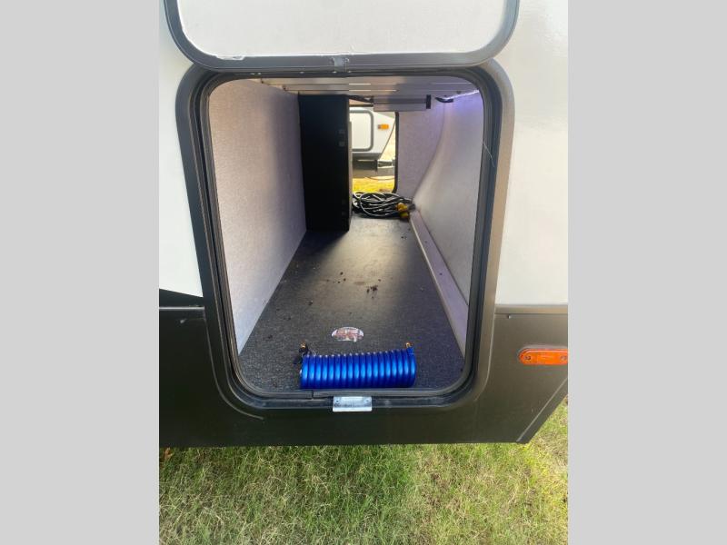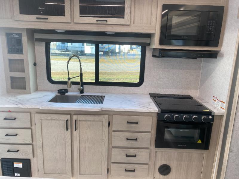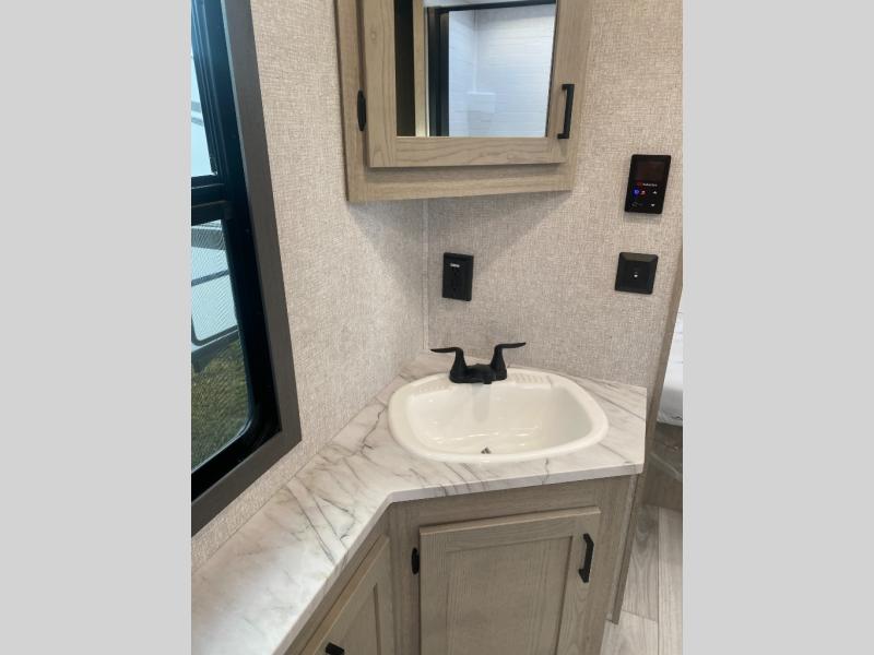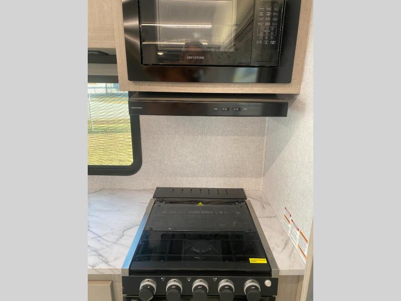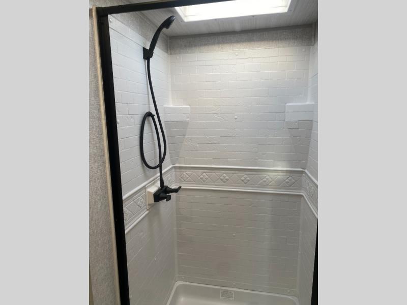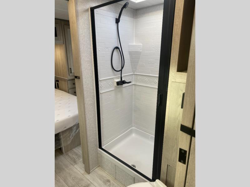 You can comfortably sleep four in this travel trailer thanks to the Tri- Fold Sofa and a king bed. There is also additional space as in the overhead cabinets, dual wardrobes and night stands. The combined living area and kitchen includes a Tri-fold Sofa with optional theater seats, a booth dinette with storage under it, plus a 50" TV. Great accessibility thanks to the two entry doors. In the exterior, there is also a 19' awning and a pass-trough storage. Finally after a long day take a comfortable and relaxing shower in our walk trough bathroom.