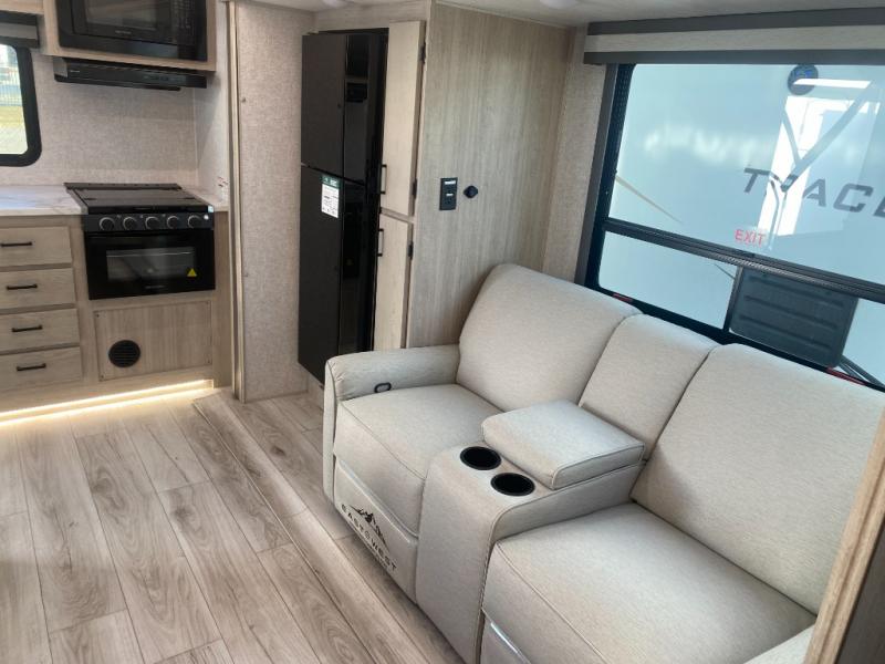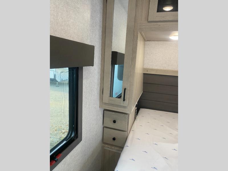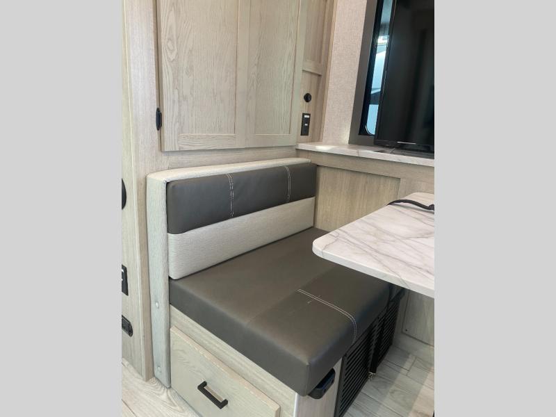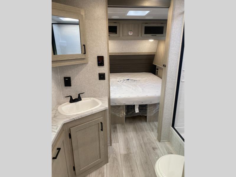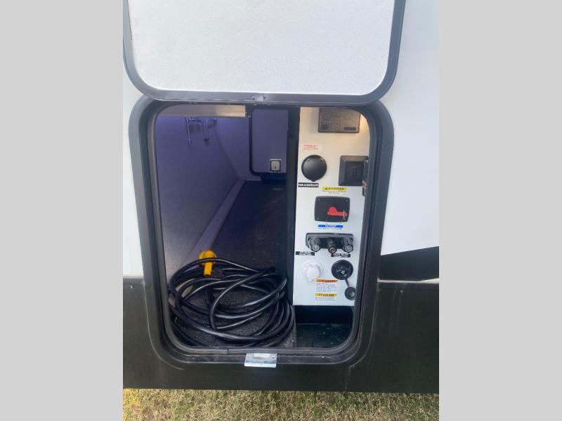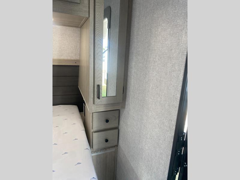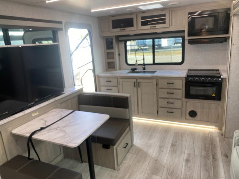 You can comfortably sleep four in this travel trailer thanks to the Tri- Fold Sofa and a king bed. There is also additional space as in the overhead cabinets, dual wardrobes and night stands. The combined living area and kitchen includes a Tri-fold Sofa with optional theater seats, a booth dinette with storage under it, plus a 50" TV. Great accessibility thanks to the two entry doors. In the exterior, there is also a 19' awning and a pass-trough storage. Finally after a long day take a comfortable and relaxing shower in our walk trough bathroom.