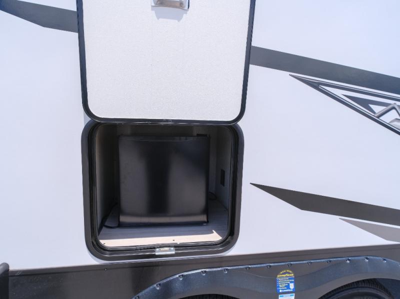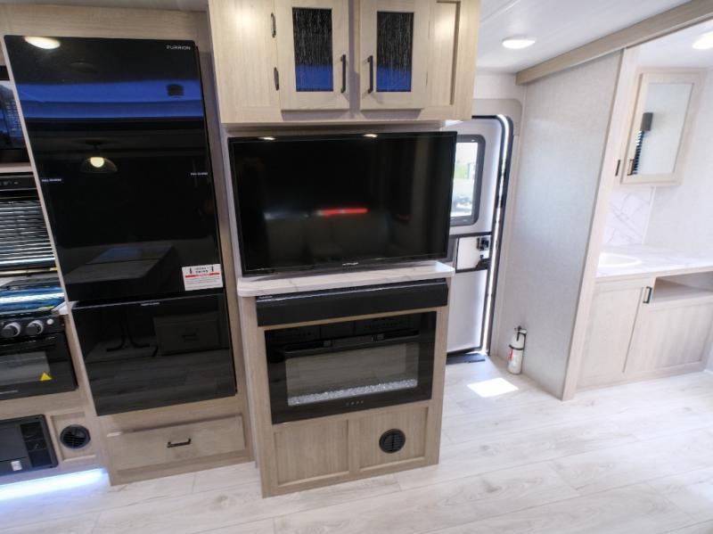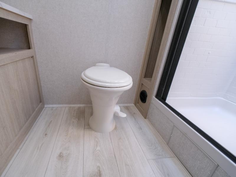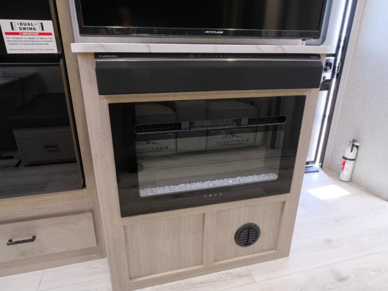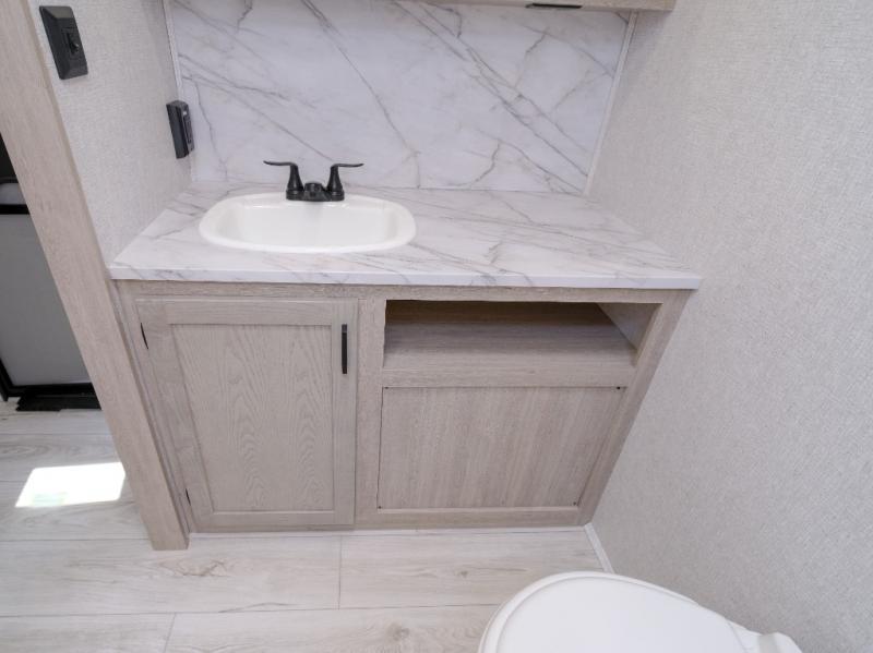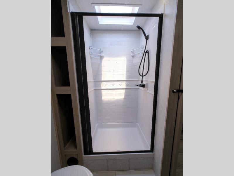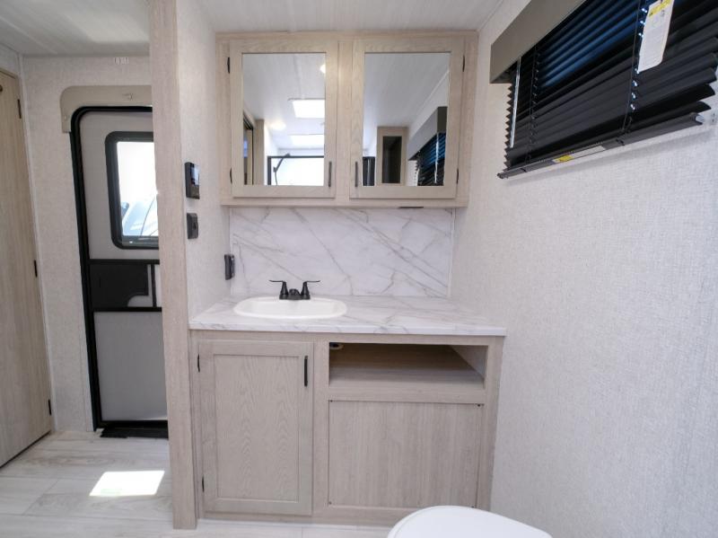 Wow! Check out the spacious full rear bath in this travel trailer for five! You'll appreciate a linen closet here and a shower skylight to let natural light in. Your crew can get comfortable on the theater seating that sits directly across from the fireplace for a more cozy feel. There is also a booth dinette here with storage space underneath for board games. Head to the kitchen to prepare dinner on the three burner cooktop, and use the countertop extension to cut fresh fruits and vegetables. A front private bedroom with a king bed and dual wardrobes will have you feeling right at home. Start camping today!