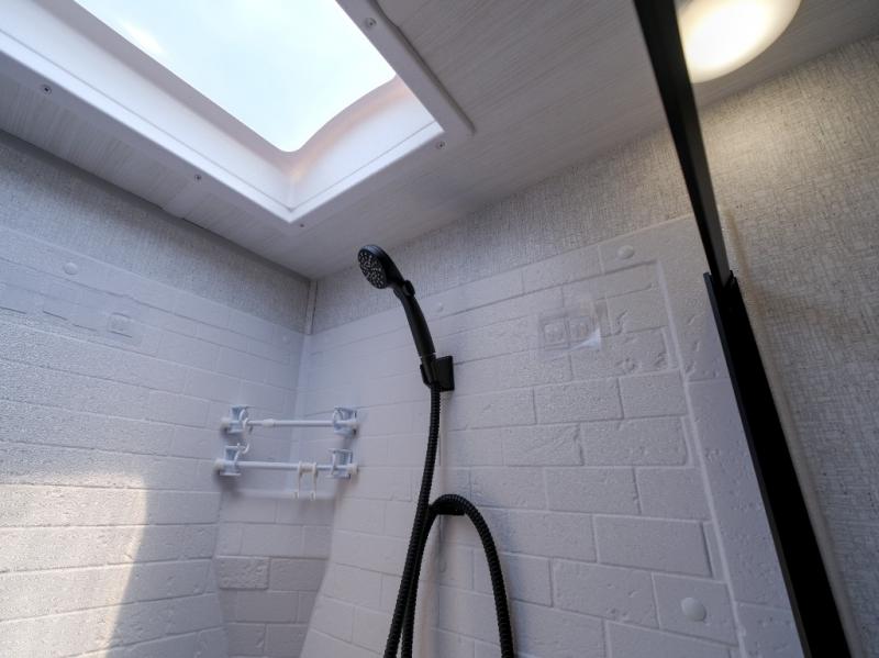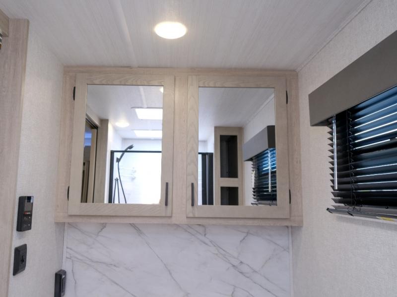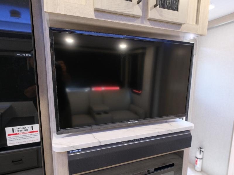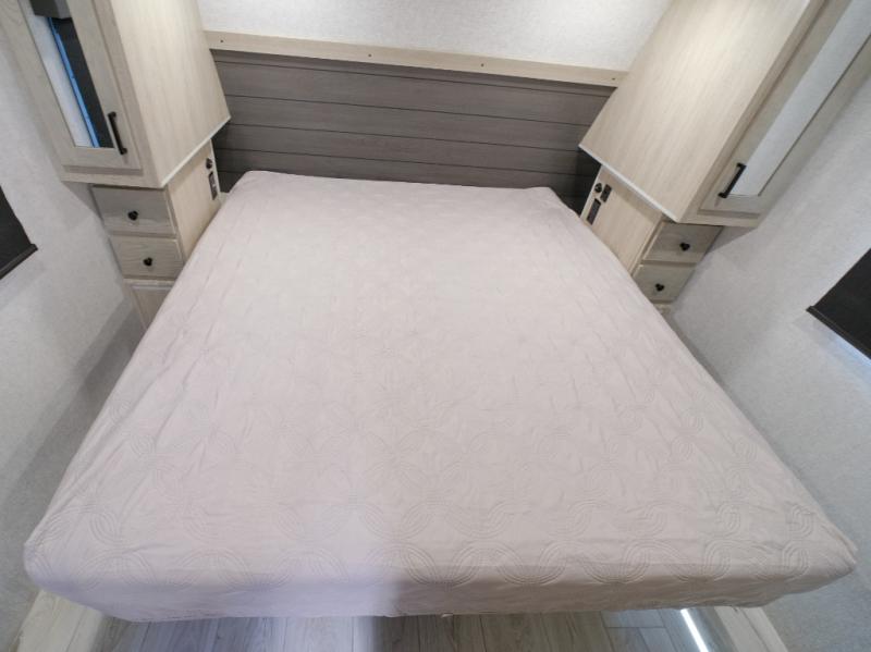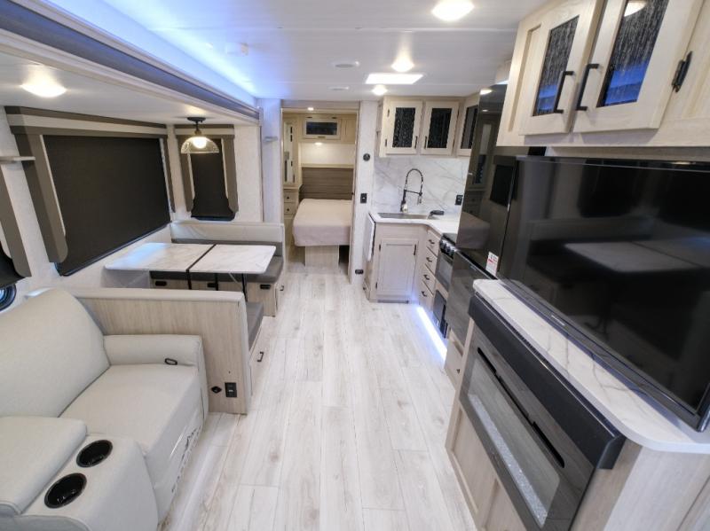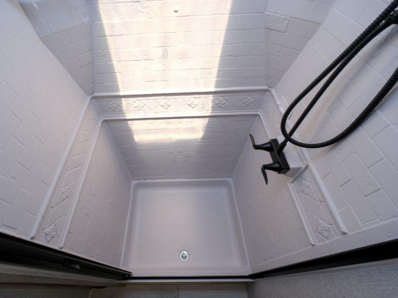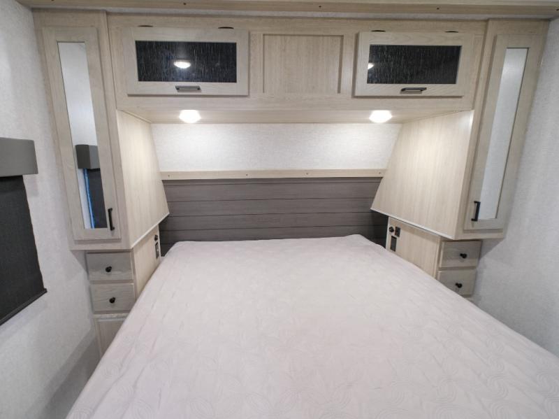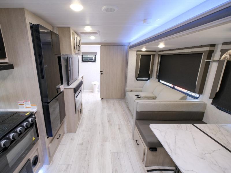 Wow! Check out the spacious full rear bath in this travel trailer for five! You'll appreciate a linen closet here and a shower skylight to let natural light in. Your crew can get comfortable on the theater seating that sits directly across from the fireplace for a more cozy feel. There is also a booth dinette here with storage space underneath for board games. Head to the kitchen to prepare dinner on the three burner cooktop, and use the countertop extension to cut fresh fruits and vegetables. A front private bedroom with a king bed and dual wardrobes will have you feeling right at home. Start camping today!