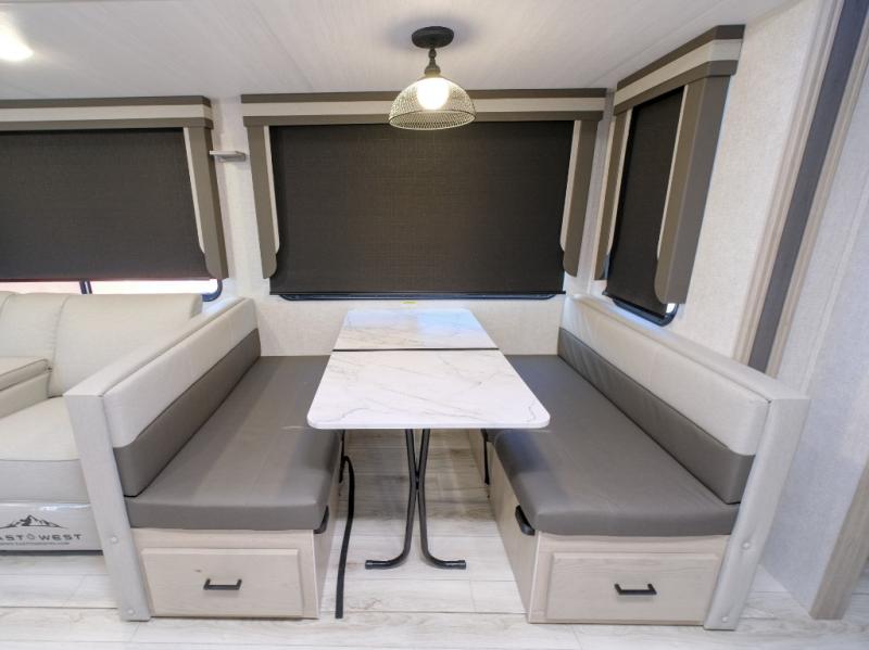 Each Alta travel trailer or toy hauler by EAST TO WEST is constructed with a 5" vacuum bonded roof, an enclosed and heated underbelly, and diamond plate front rock guard for added protection. Outside, you'll find marine-grade exterior speakers, a universal docking station, and back-up camera prep that can be added to make maneuvering in and out of campgrounds easier than ever. Inside, there are 4k interior LED lights, solid pressed membrane countertops, black roller shades, and many more interior comforts you are sure to love.