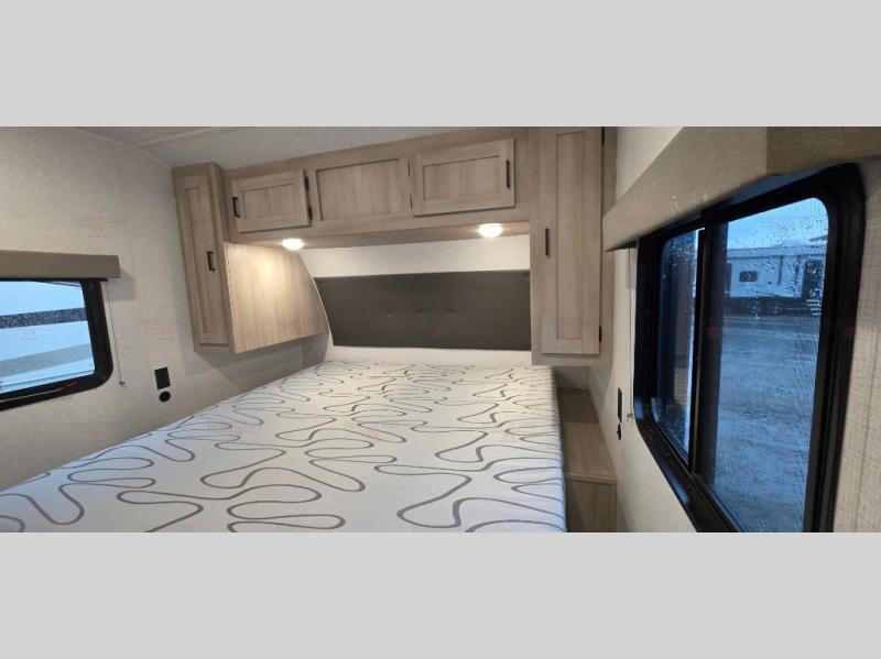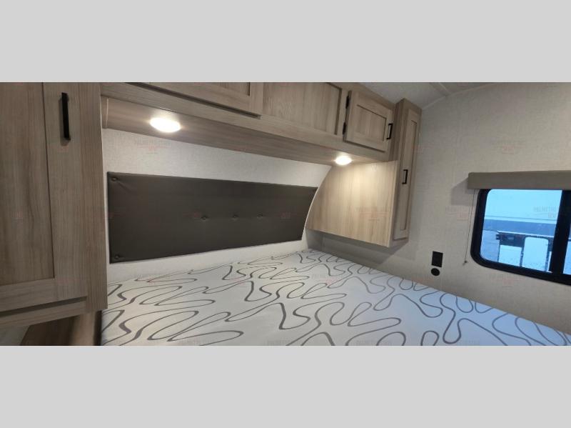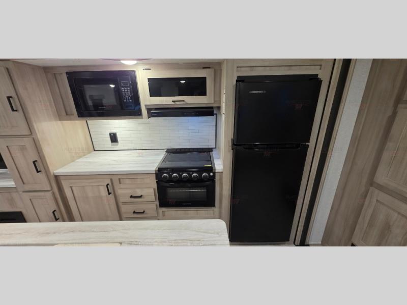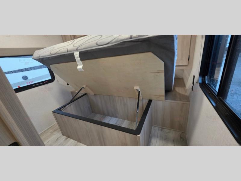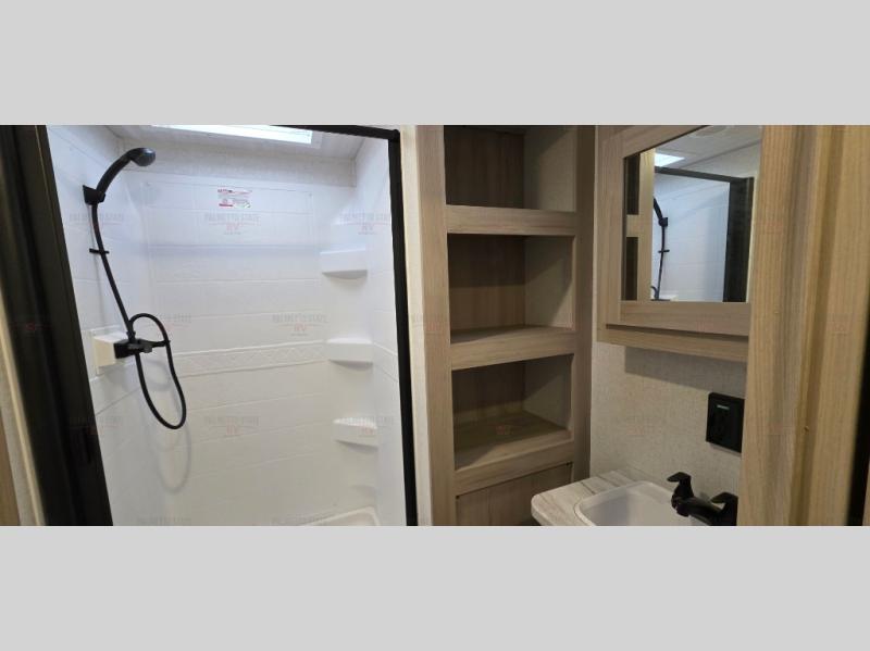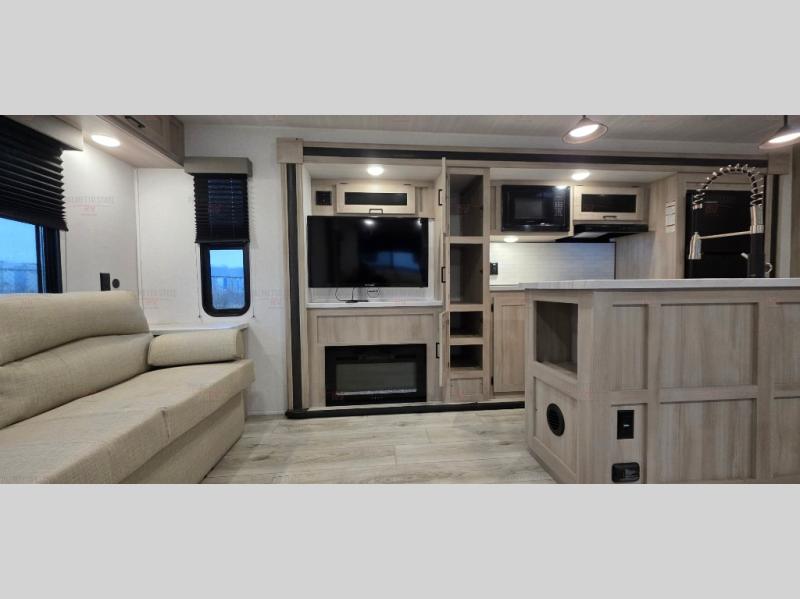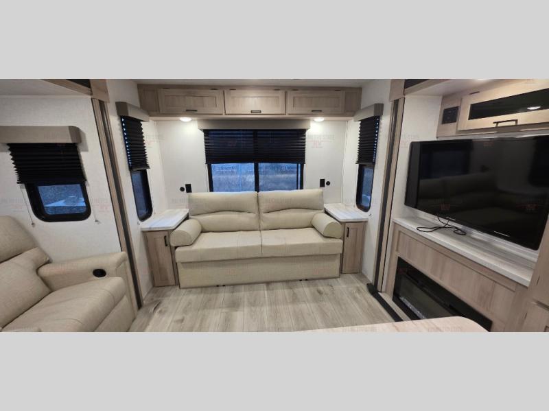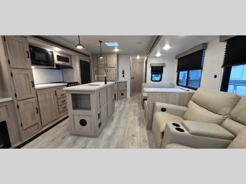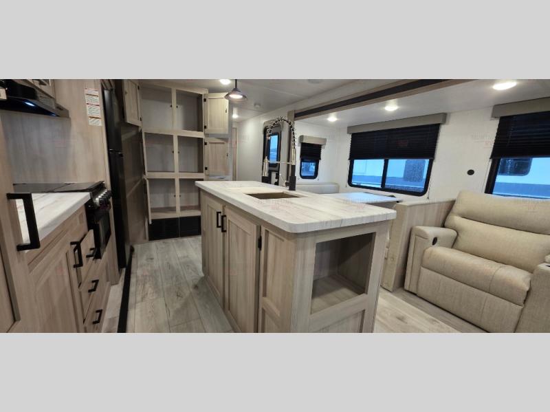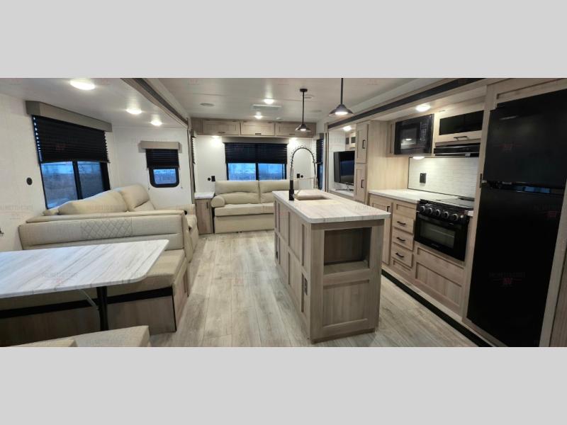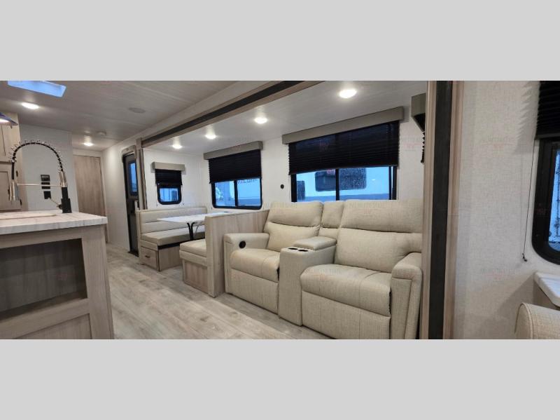 Spacious and inviting, this trailer provides dual opposing slides in the main living and kitchen area giving everyone lots of floor space to walk around the kitchen island featuring a large sink. You will find plenty of seating between the rear jack knife sofa and two chairs or optional theater seating if you wish. There is also a booth dinette that is perfect for dining or playing games, and you will appreciate all the storage underneath. Straight in from the entry door you will find an angled cabinet including a counter to place your cellphones and such, plus just a few steps away a full bath is easily accessible as well. The full bathroom is complete with a 30" x 36" shower, toilet and sink with overhead medicine cabinet, plus linen storage for your towels. A private front bedroom offers privacy and a king size bed for a relaxing nights rest, and clothing storage in dual bedside wardrobes.