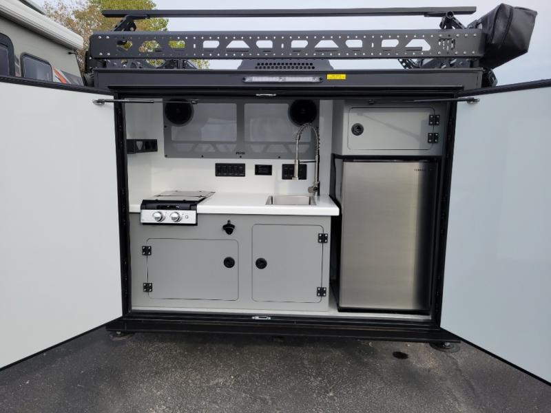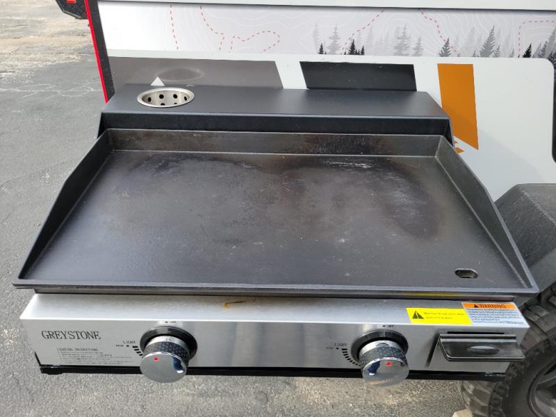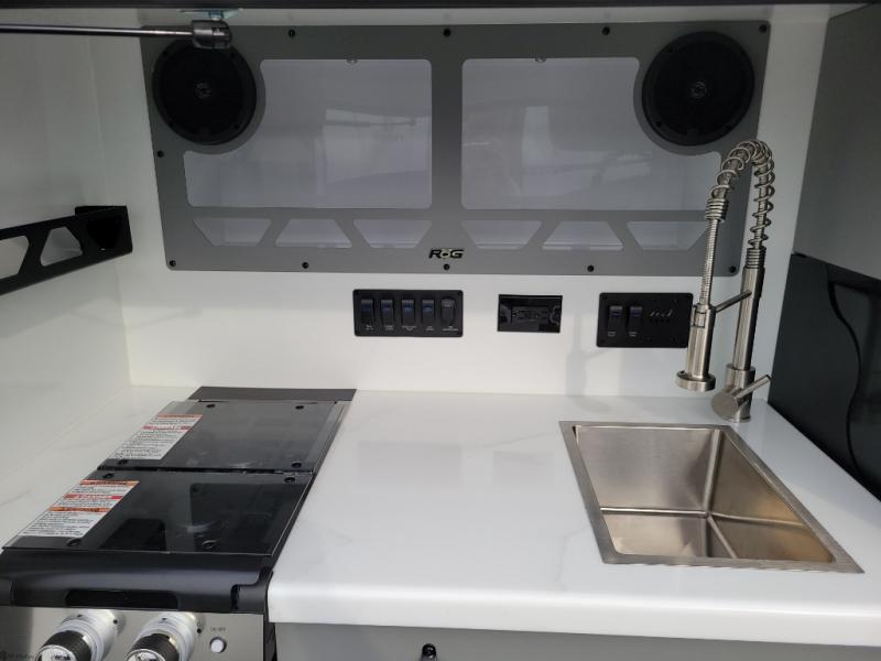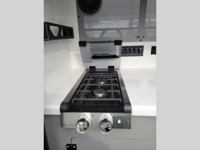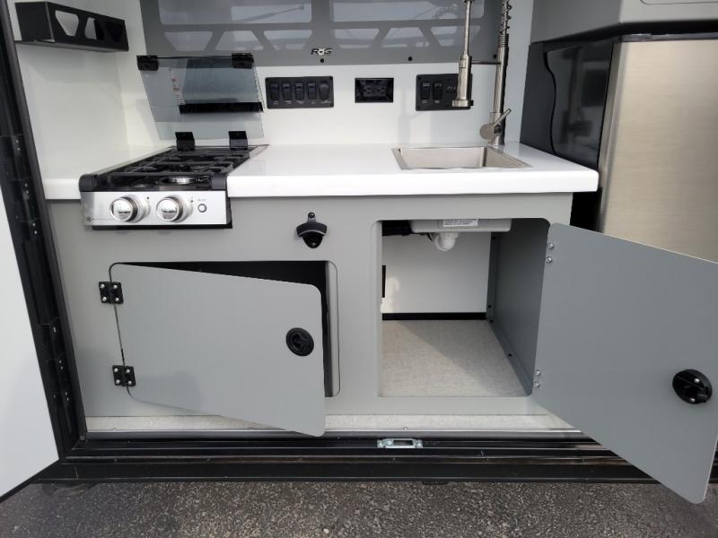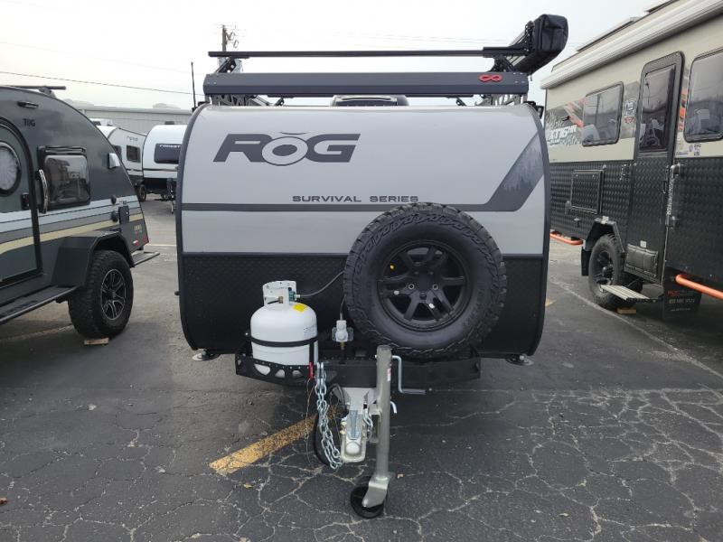 You will be so excited to test out this ROG travel trailer for yourself! The interior has great storage solutions to keep your camp gear secure. The rear outdoor kitchen has convenient amenities to help you eat well while you're away. You'll find a two-burner stove with cast-iron grates and a 3.3 cu. ft. 12V refrigerator to cook and store food. And the queen/futon mattress is sure to bring a great night's rest!