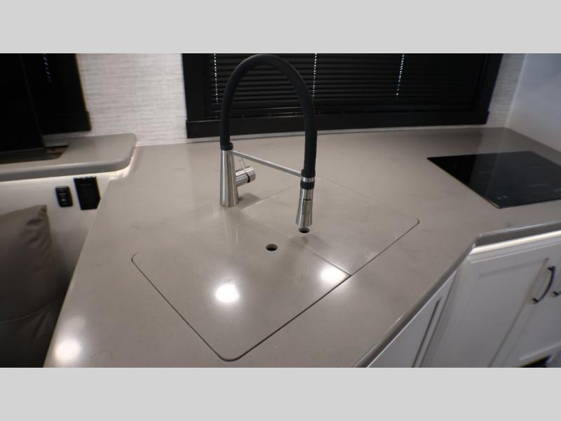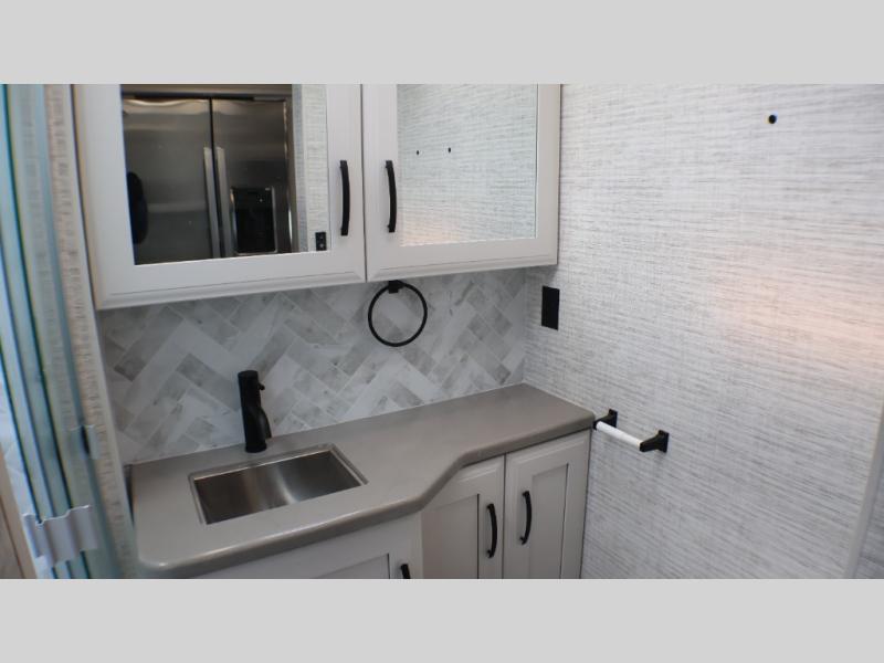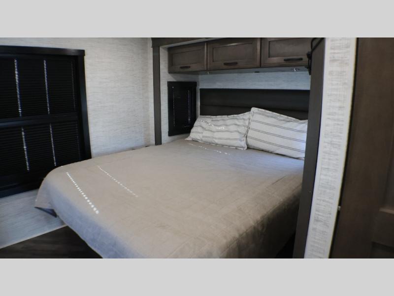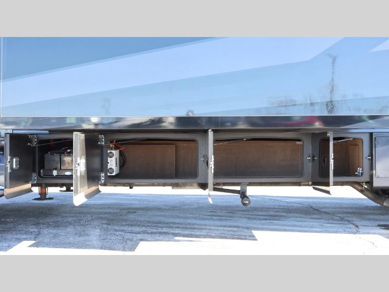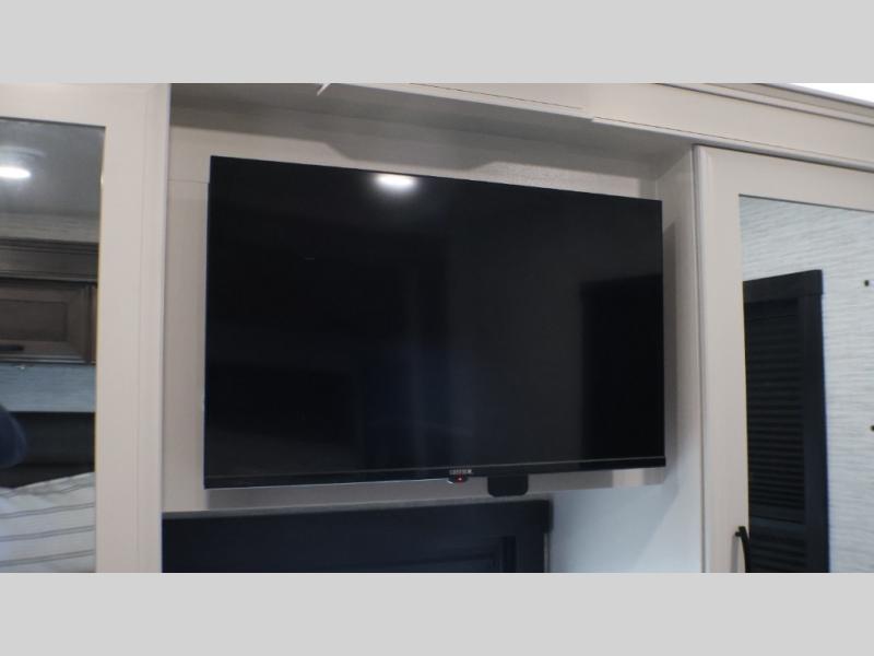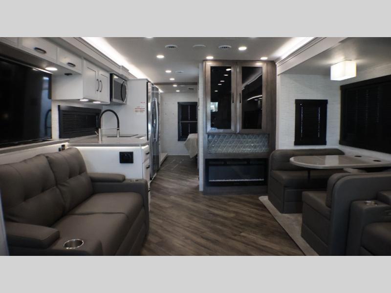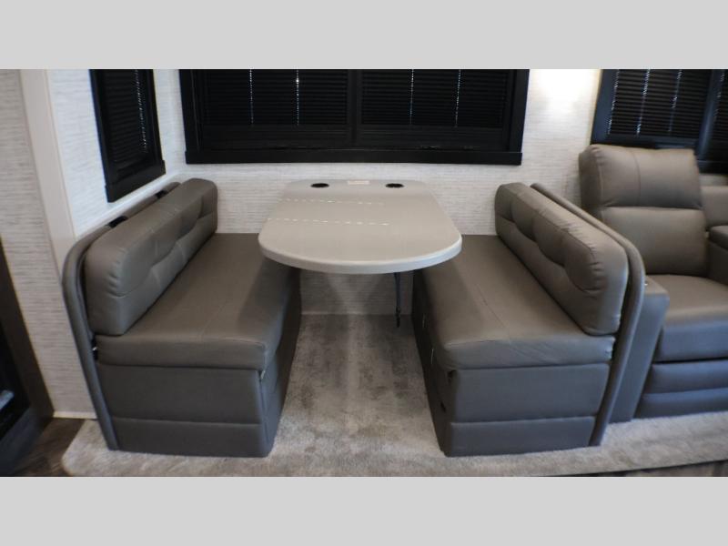 If you liked the Accolade model 37L, but don't need the extra sleeping space from the bunks, this 37M Accolade coach is perfect for you! You'll still have the cab-over bunk, the full-wall slide, and the rear private bedroom. The power head lift king bed will allow you to sit up and read at night, or you may just want to watch a movie on the bedroom LED TV. The chef of your group can prepare meals on the two burner induction cooktop, or use the residential-size convection microwave, and there is a residential refrigerator just like at home. Relaxing each day will be a breeze with the power theater seating across from the 50" TV lift and second sofa, and you can dine at the booth dinette. There is also a hutch for added storage space, and an impressive 23' power awning with LED lights!