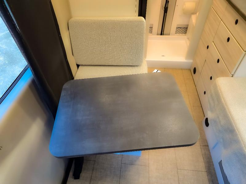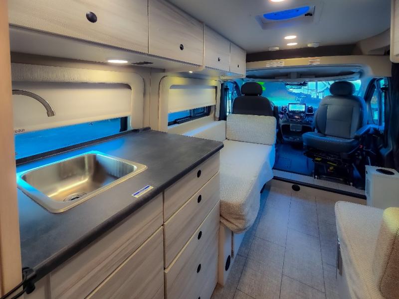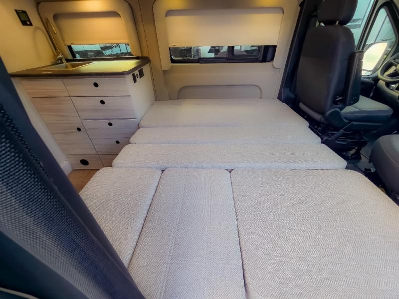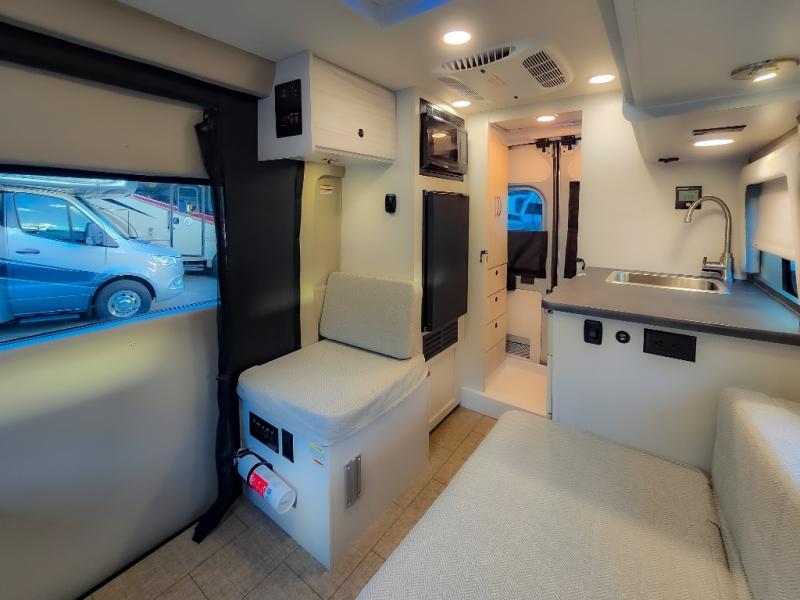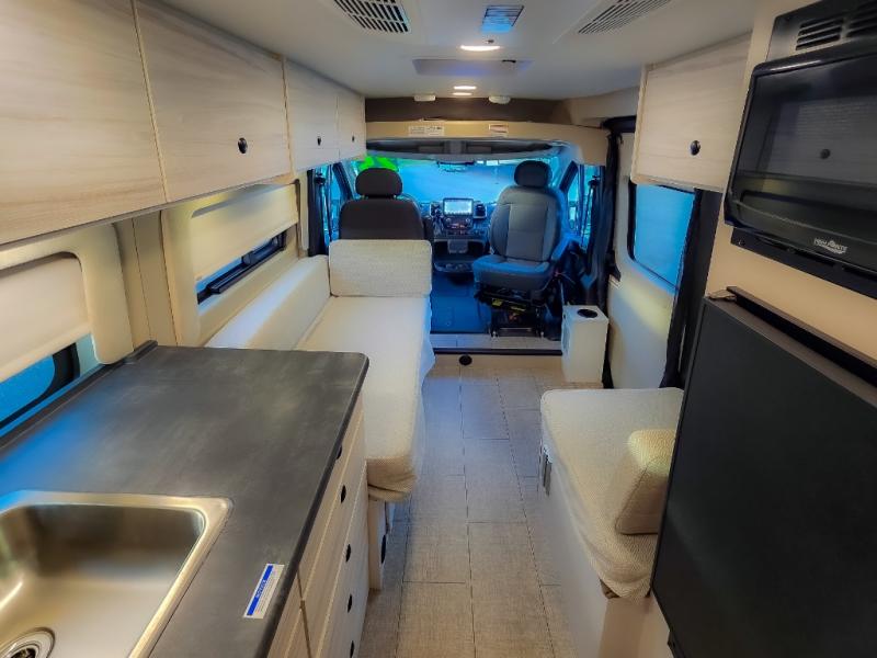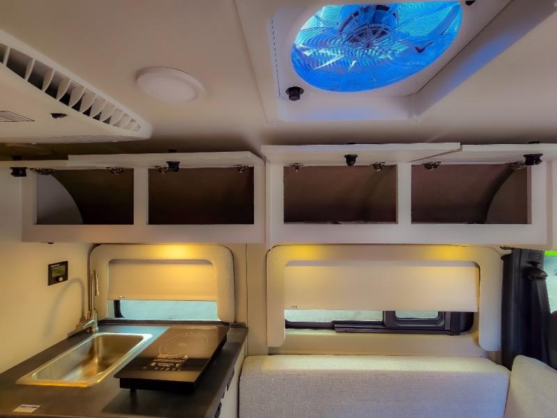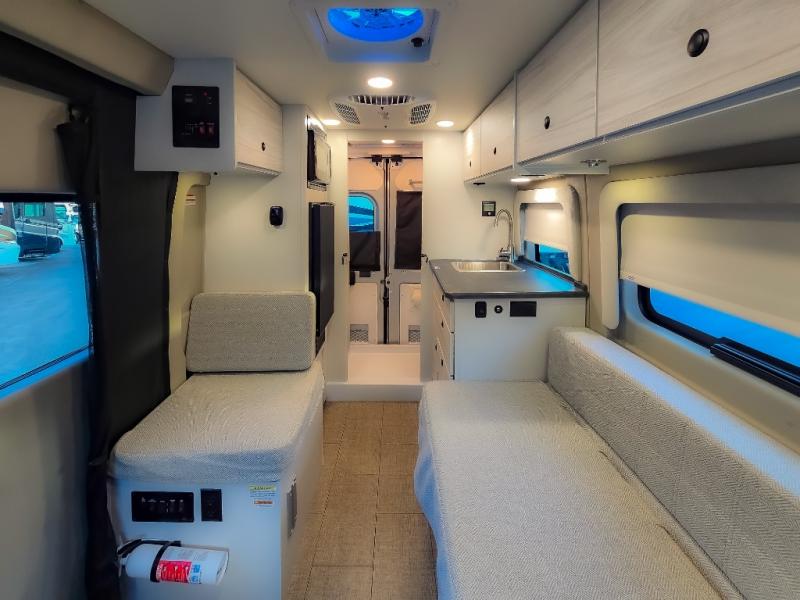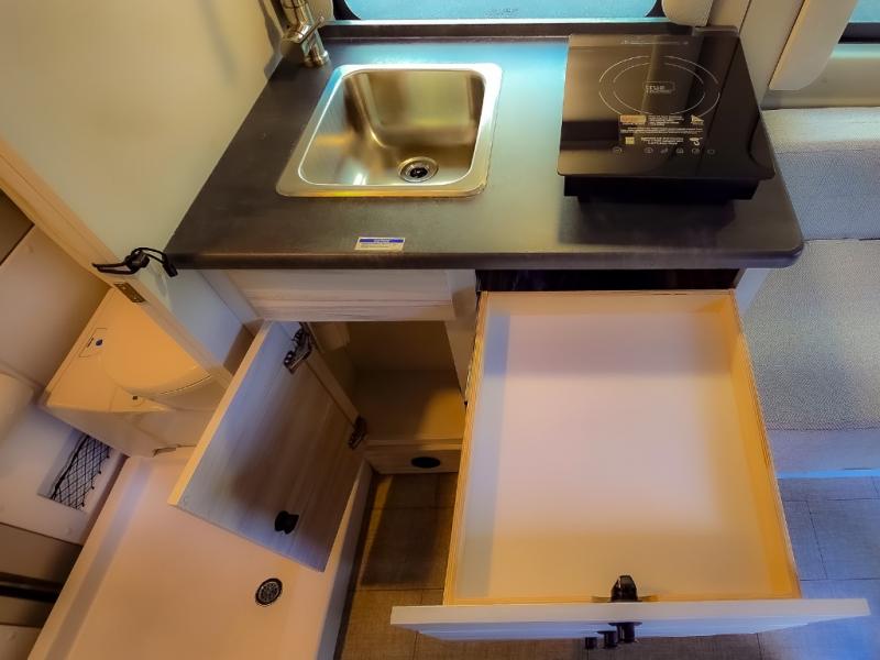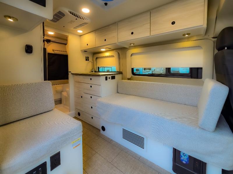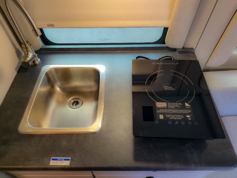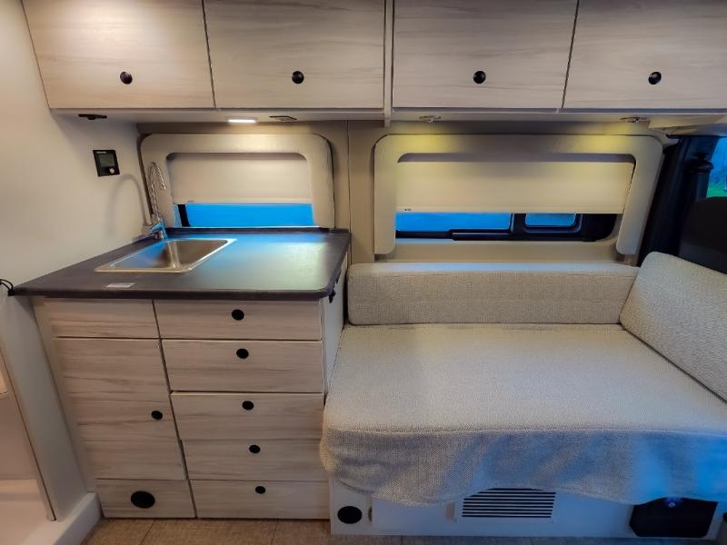 Any trip in this camper van will be spent in comfort thanks to the convenient wet bath and full kitchen amenities. You can whip up a hearty breakfast on the portable induction cooktop or use the microwave oven. There is a stainless steel sink with a cover for more prep space, and the pressed countertops will be easy to clean. After you've hiked for the day and gotten cleaned up in the rear wet bath, you can relax on the 54" sofa that will convert to a 54" x 72" bed. There is also a 27" bench seat for more seating space, overhead cabinets for storage, and an overhead TV to keep you entertained.