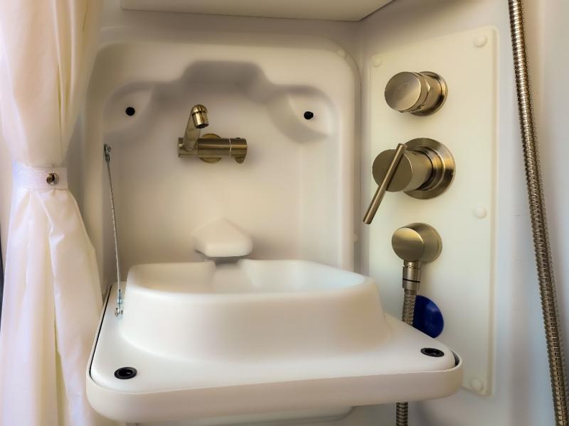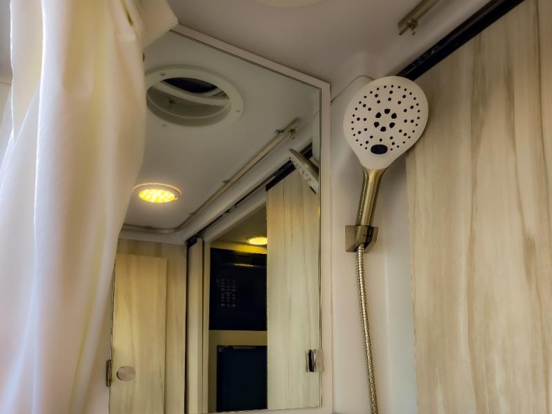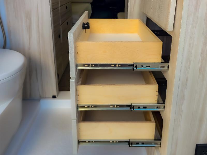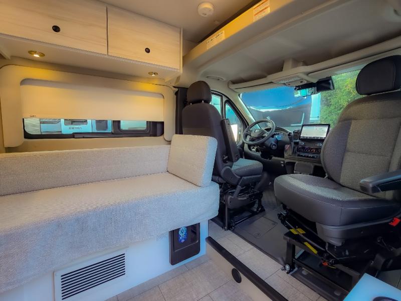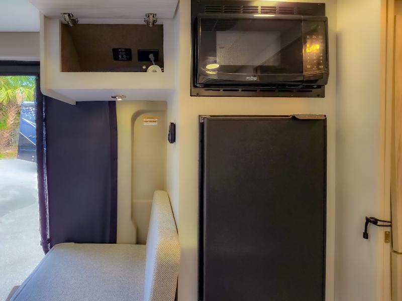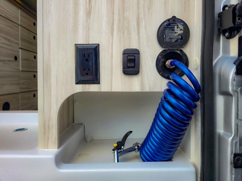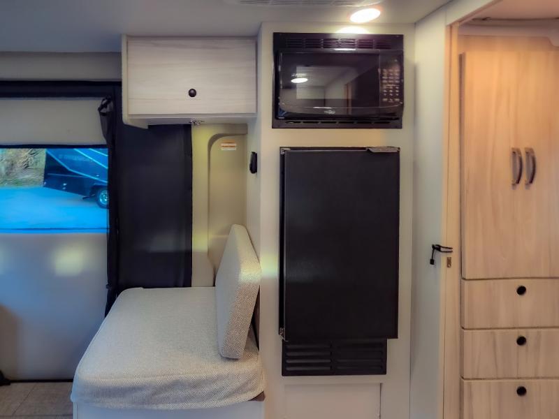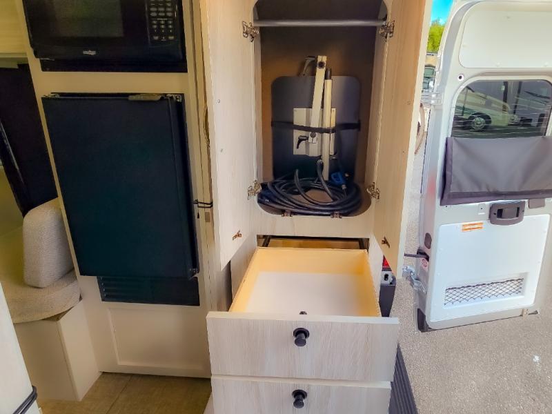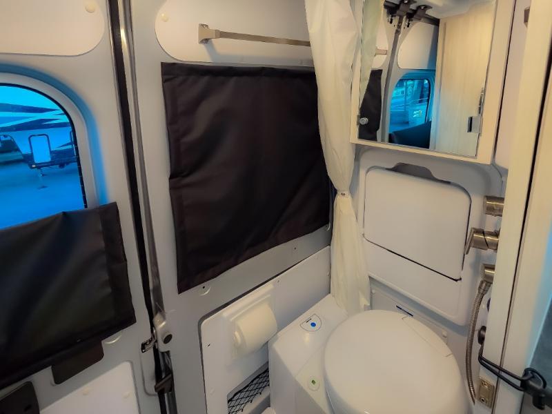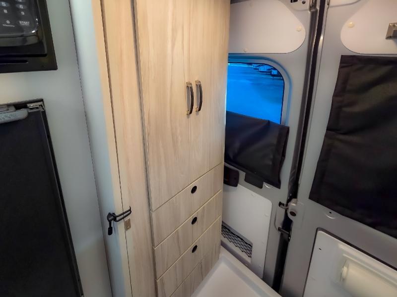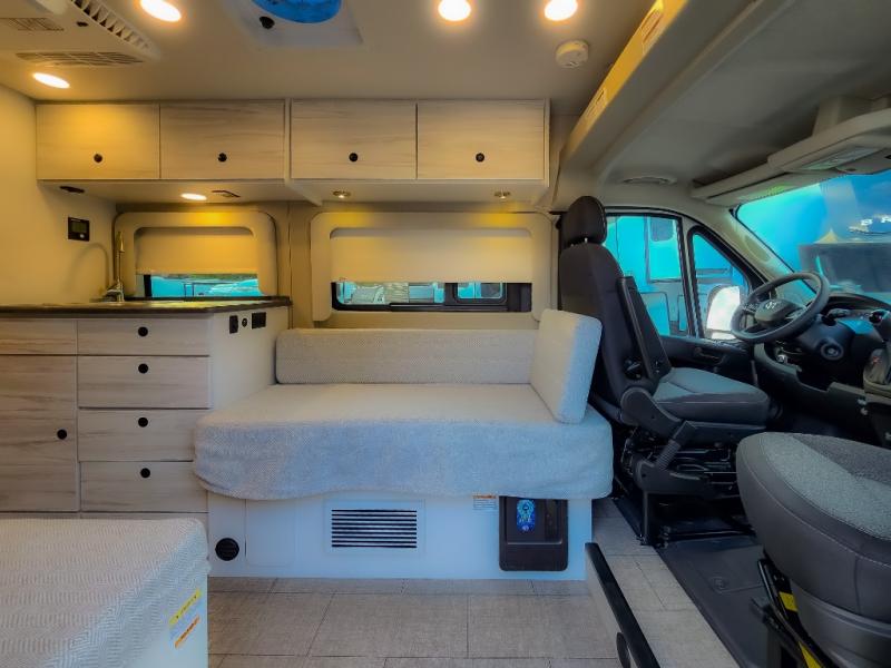 Any trip in this camper van will be spent in comfort thanks to the convenient wet bath and full kitchen amenities. You can whip up a hearty breakfast on the portable induction cooktop or use the microwave oven. There is a stainless steel sink with a cover for more prep space, and the pressed countertops will be easy to clean. After you've hiked for the day and gotten cleaned up in the rear wet bath, you can relax on the 54" sofa that will convert to a 54" x 72" bed. There is also a 27" bench seat for more seating space, overhead cabinets for storage, and an overhead TV to keep you entertained.