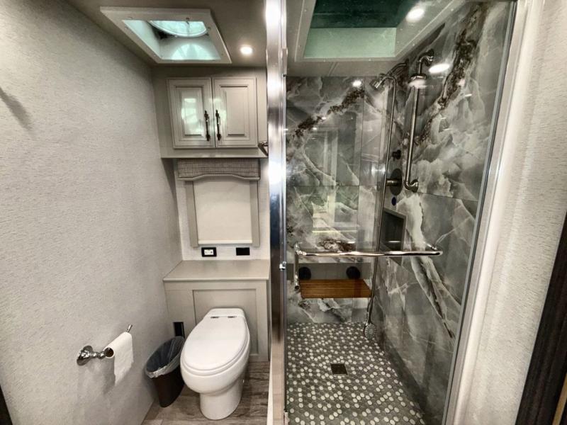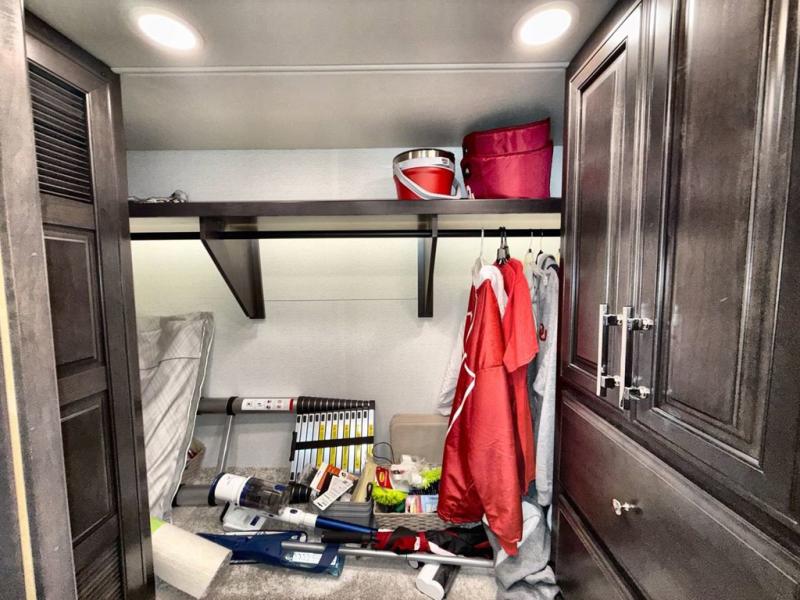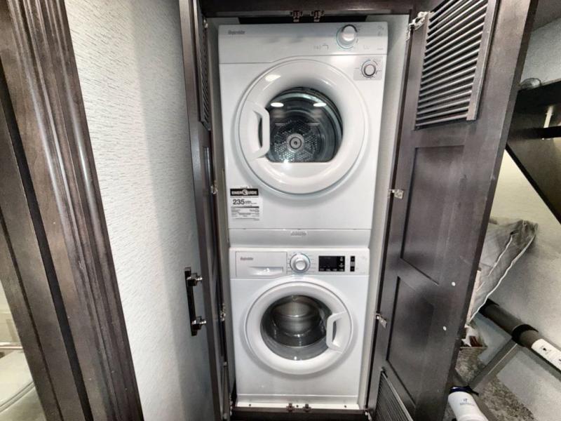 If you've been looking to upgrade your motorhome, this Cornerstone will be the perfect choice. There is a bath and a half, four slides, and sleeping space for four. Once you arrive at the campground, relax on the power theatre seating that is directly across from the 50" TV on lift. You can play a game at the free-standing dinette, or you may just want to head outside since there is an outside entertainment center. The master suite includes a king bed slide out, dual wardrobes, plus your own 32" TV. And check out the full rear bath that includes a rear walk-in wardrobe with plenty of storage space and a Splendide stackable washer and dryer.