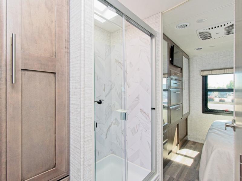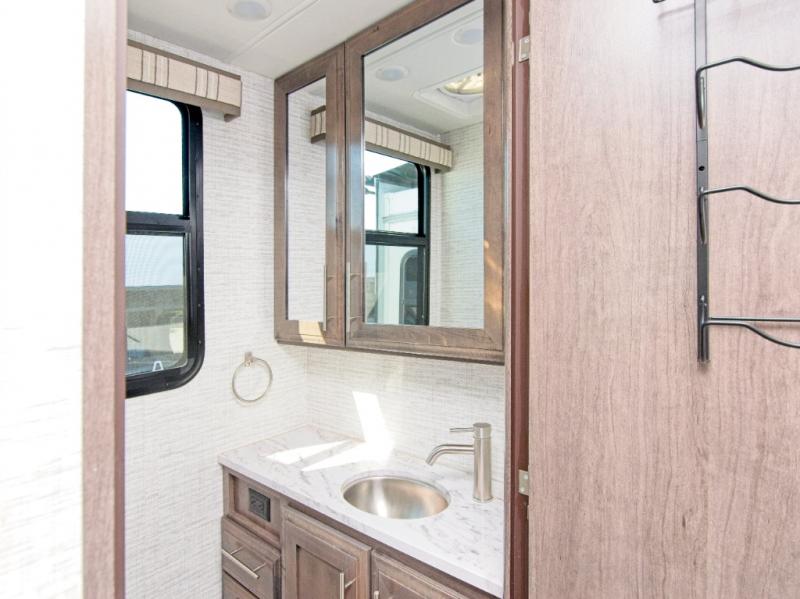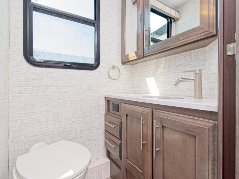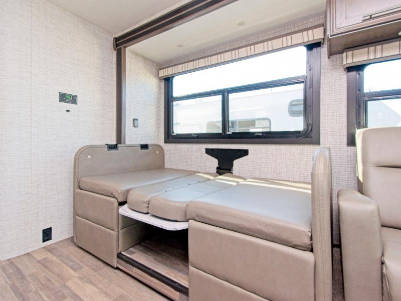 The split bathroom design allows multiple people to get ready at once—one can enjoy the roomy 30" x 36" shower while another uses the private toilet and sink. The booth dinette and tri-fold sofa provide versatile seating and sleeping options, with an upgrade available to a theater sofa. Plus, the bunk over cab adds extra sleeping space for guests or kids.
