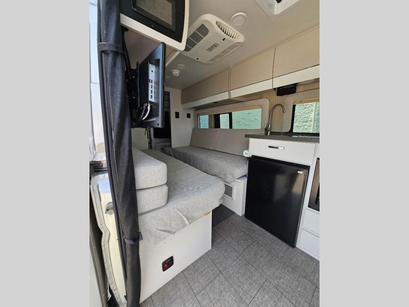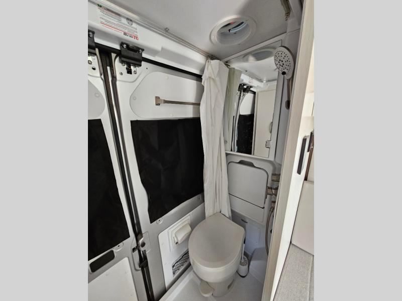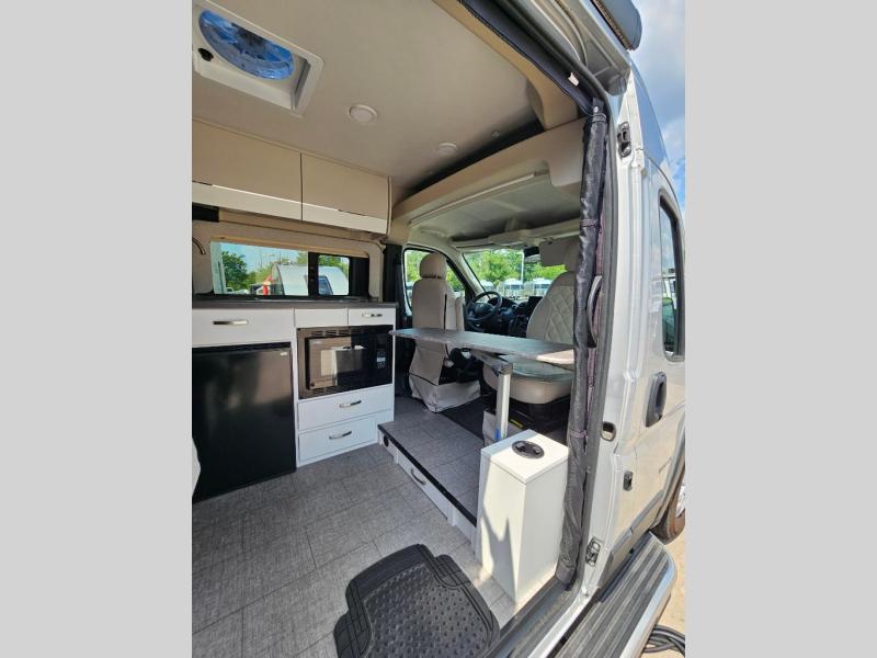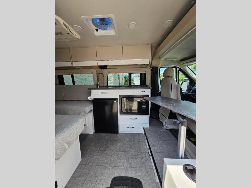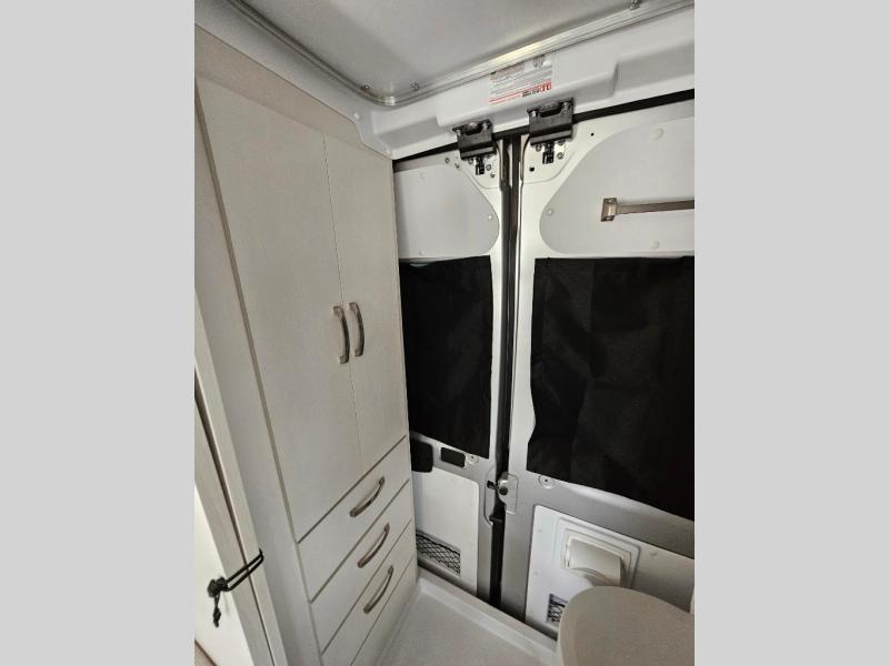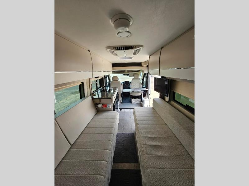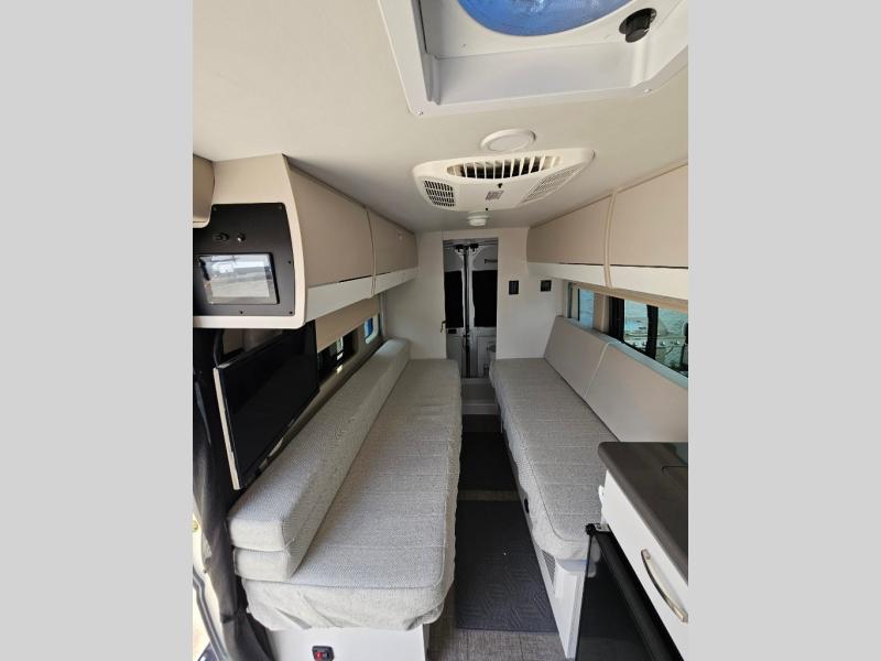 Your trek across country is made comfortable in this coach for two. You can swivel the captains seats around when you get to your destination, or head outdoors to sit under the 13' Thule armless awning with LED lights. The pull-out table indoors will provide a space for your coffee in the morning, while breakfast is being cooked in the convection microwave or on the two burner cooktop. A rear wet bath will allow you to stay clean throughout your trip, and you'll find plenty of storage space for your belongings. You'll love the versatile sleeping arrangements in this model that includes twin-size beds with a filler cushion that converts to a king-size bed, plus there is under-bed storage for your luggage. The optional Li Package can also be added which features a 48V-165 amp hour smart lithium battery, providing 7.9KW hours of power, and more; see dealer for more details!