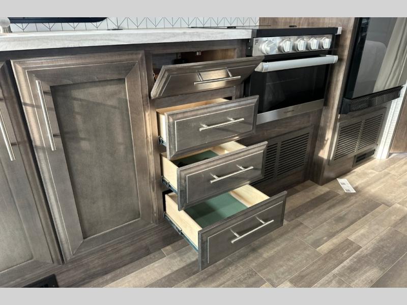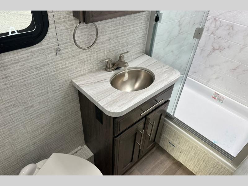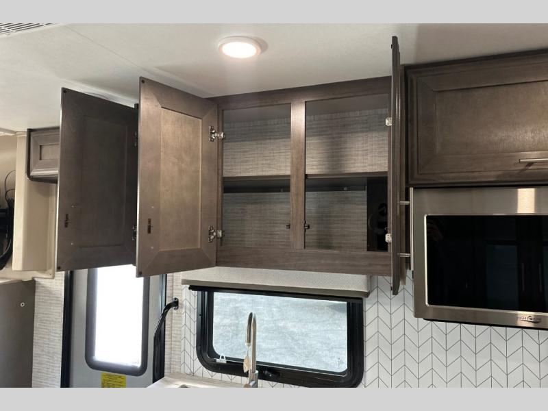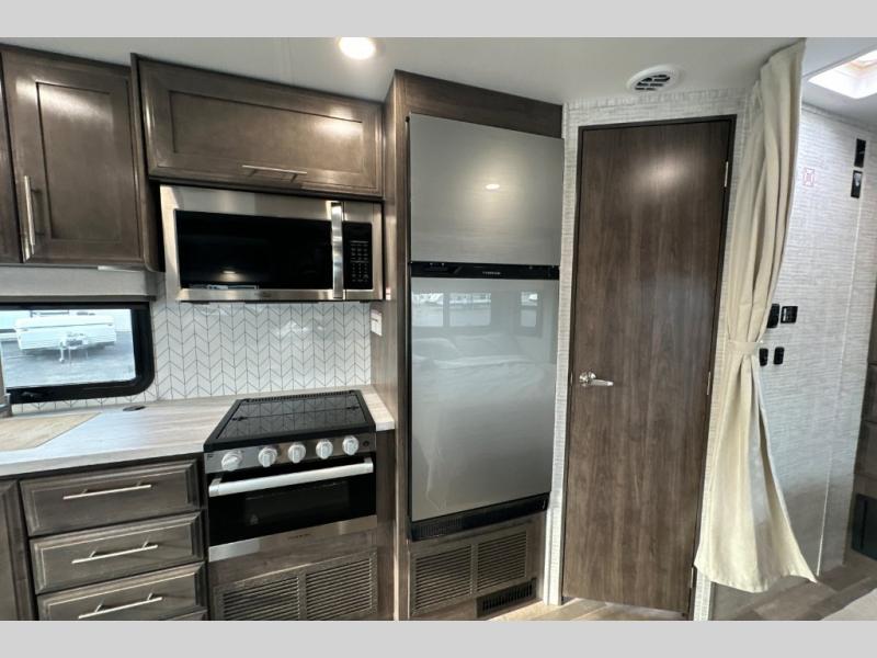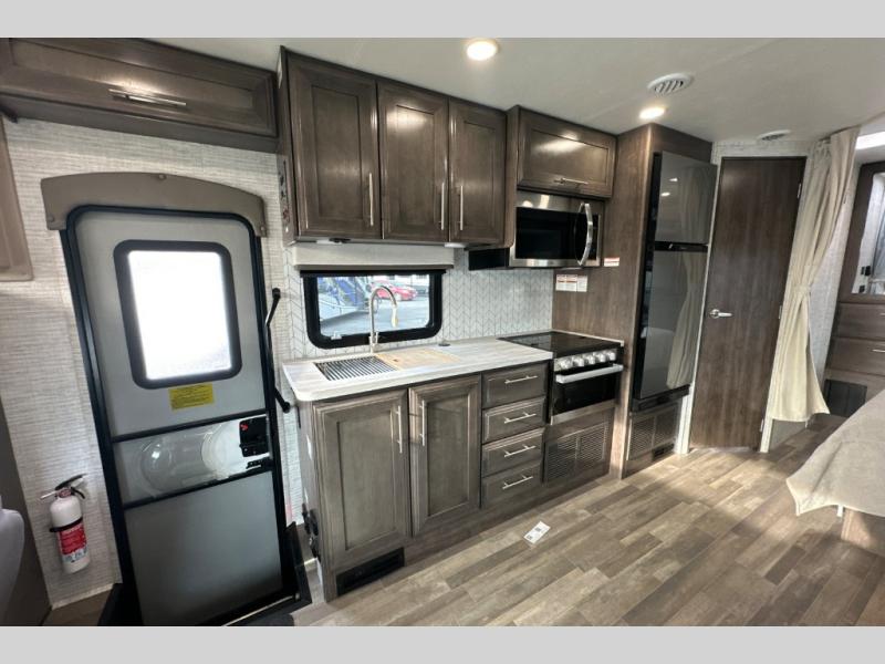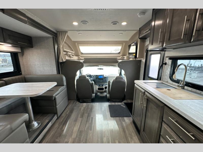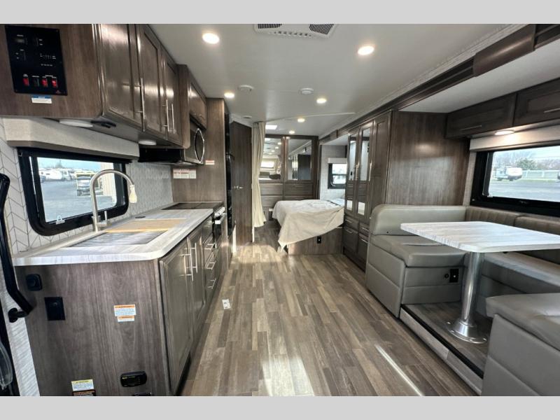With any Odyssey Class C gas motorhome by Entegra Coach, the driver will appreciate the power from the 325 HP engine, the towing capacity from the 7,500 lb. hitch, the tire pressure monitoring system, the navigation from the Sony infotainment center with Apple CarPlay and Android Auto, plus the backup and side-view cameras when parking and driving down the highway. The kitchen offers full amenities including a recessed stainless steel sink with a cutting board sink cover, LED-lit countertops, a decorative backsplash, and a pop-up charging station with 110 outlet and USB plugs to keep your smart phones charged. Get ready for luxury in a Class C, choose your favorite today!
