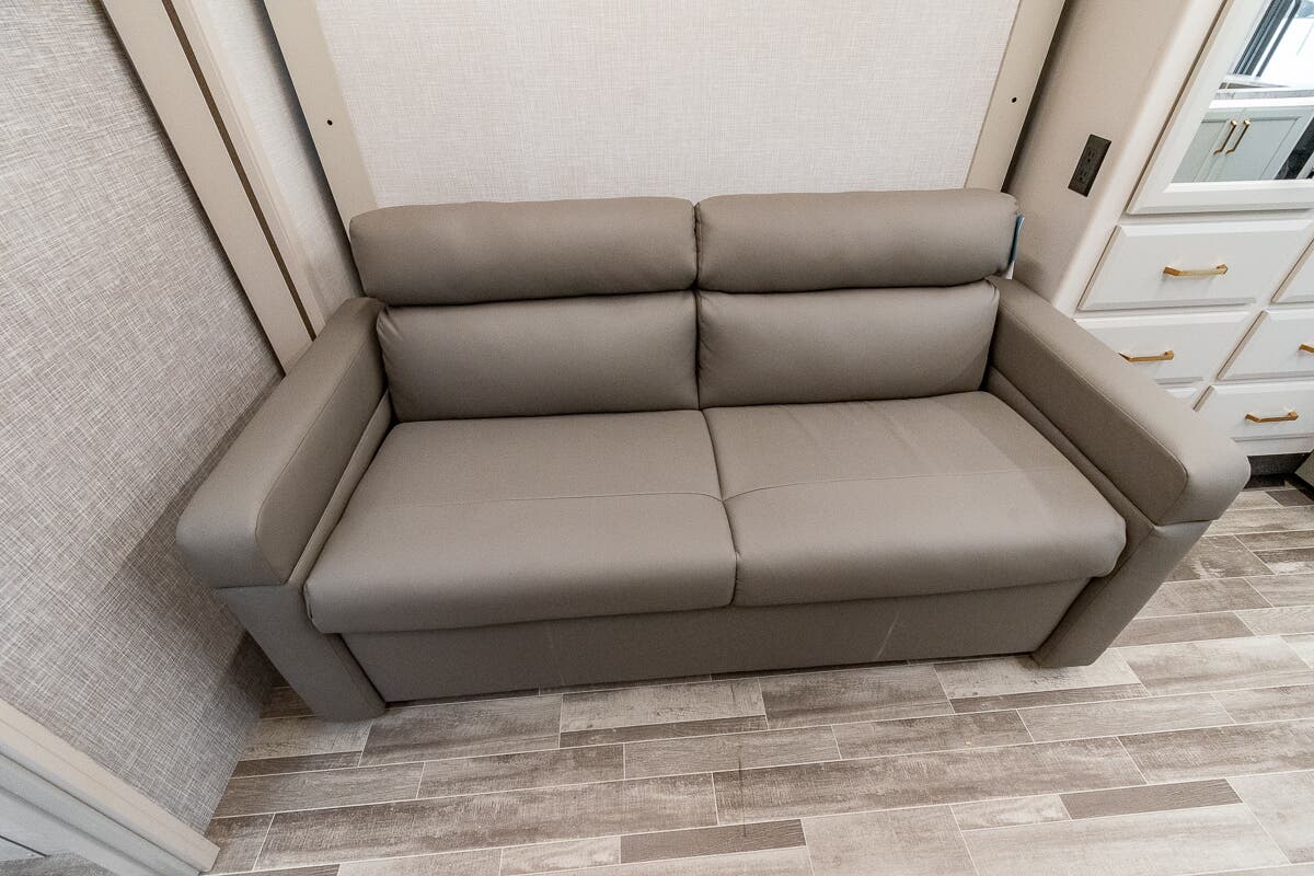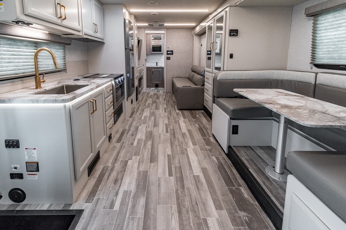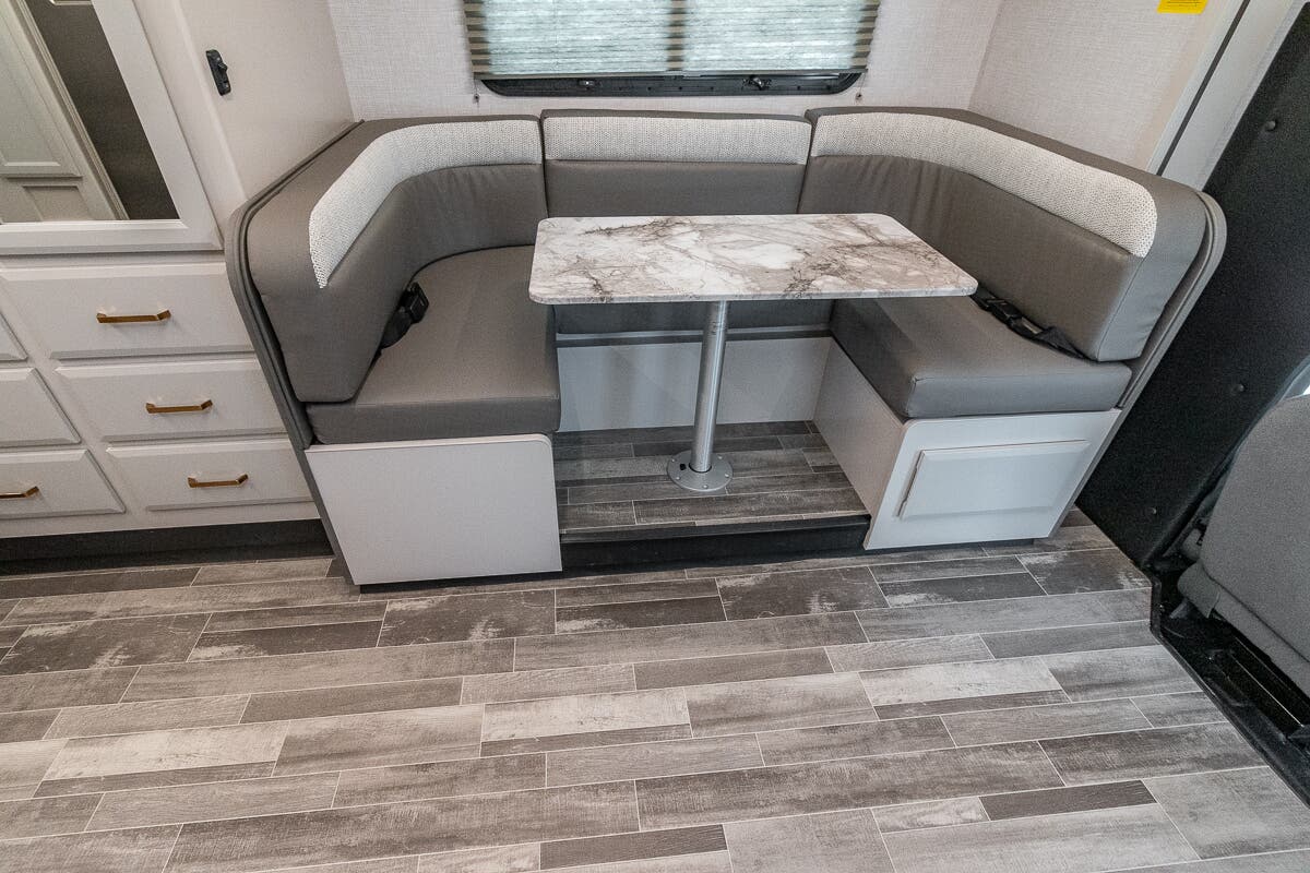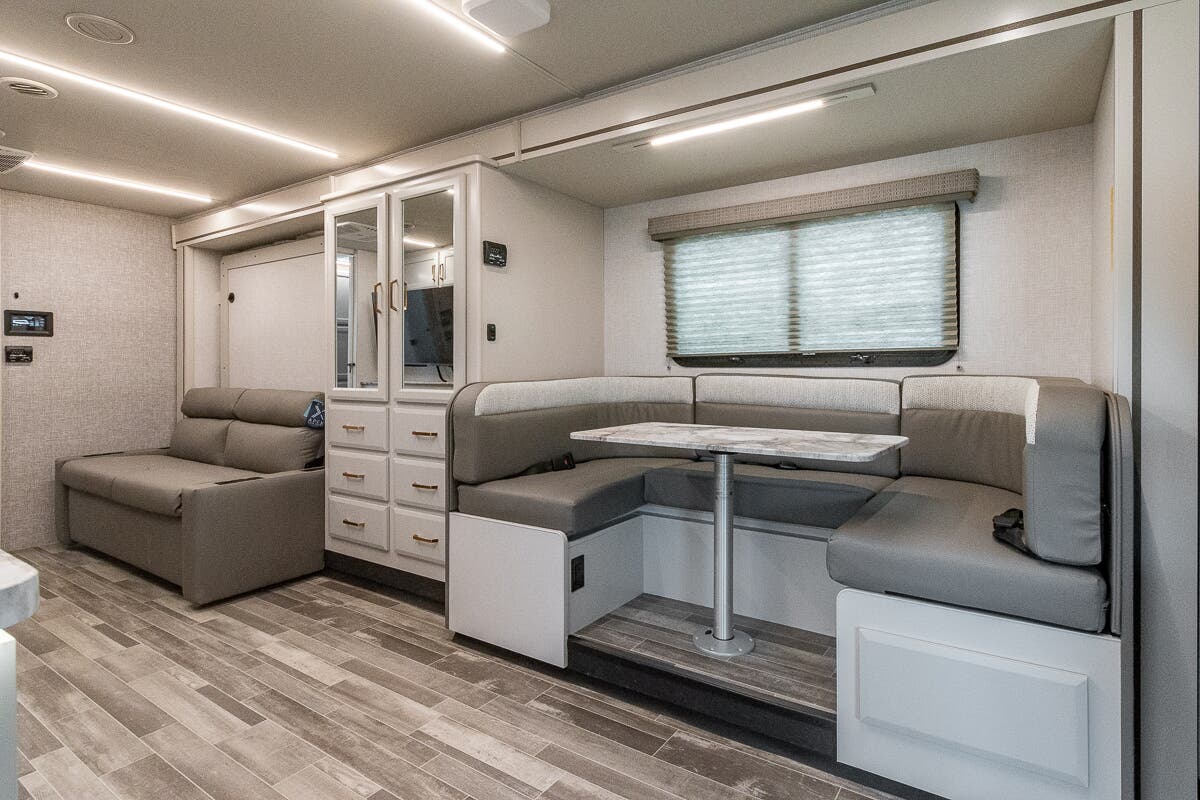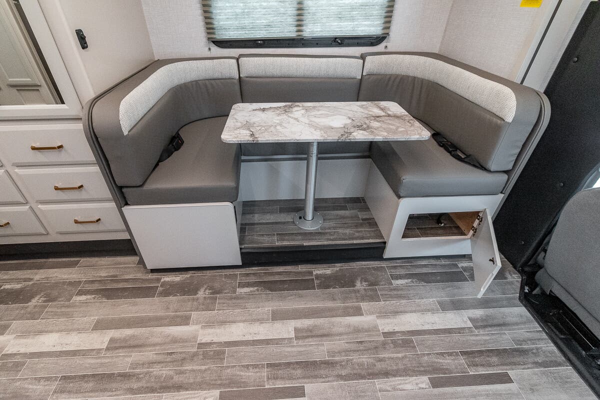 Pack your bags and head off on new adventures in this spacious coach! You will love gathering around the U-shaped dinette for a game or a meal, and the full-wall slide provides ample space to move around. An overhead bunk provides sleeping space for little ones or to be used as extra storage space. Since there is a queen Murphy bed, you will enjoy versatile seating and sleeping space, and the full rear bath will allow you to freshen up each day without having to use the camp's facilities. This model also includes a three burner range/convection microwave combo to cook meals on plus an exterior kitchen with a mini fridge, pull-out griddle, and storage when the weather is nice!