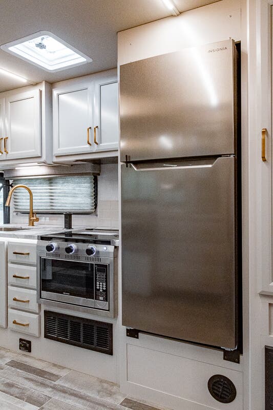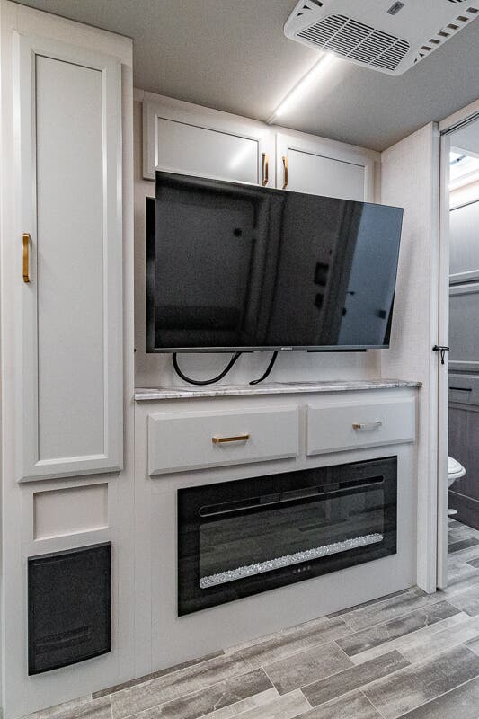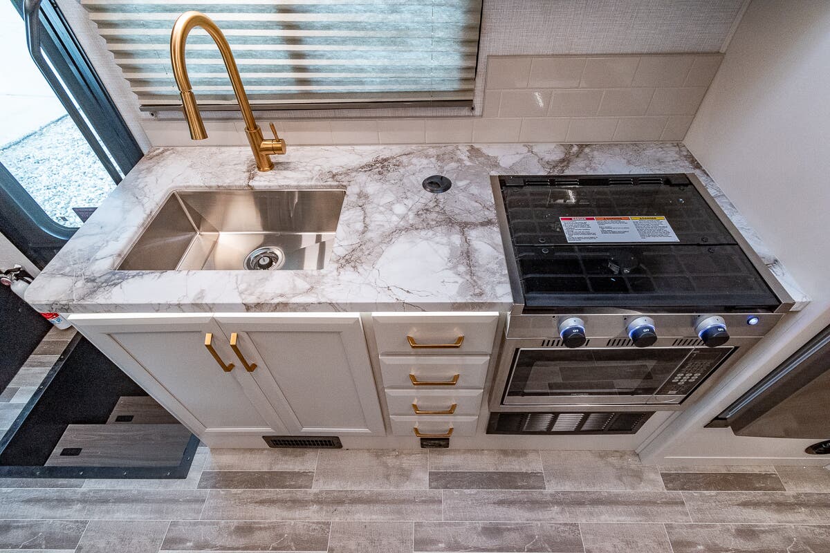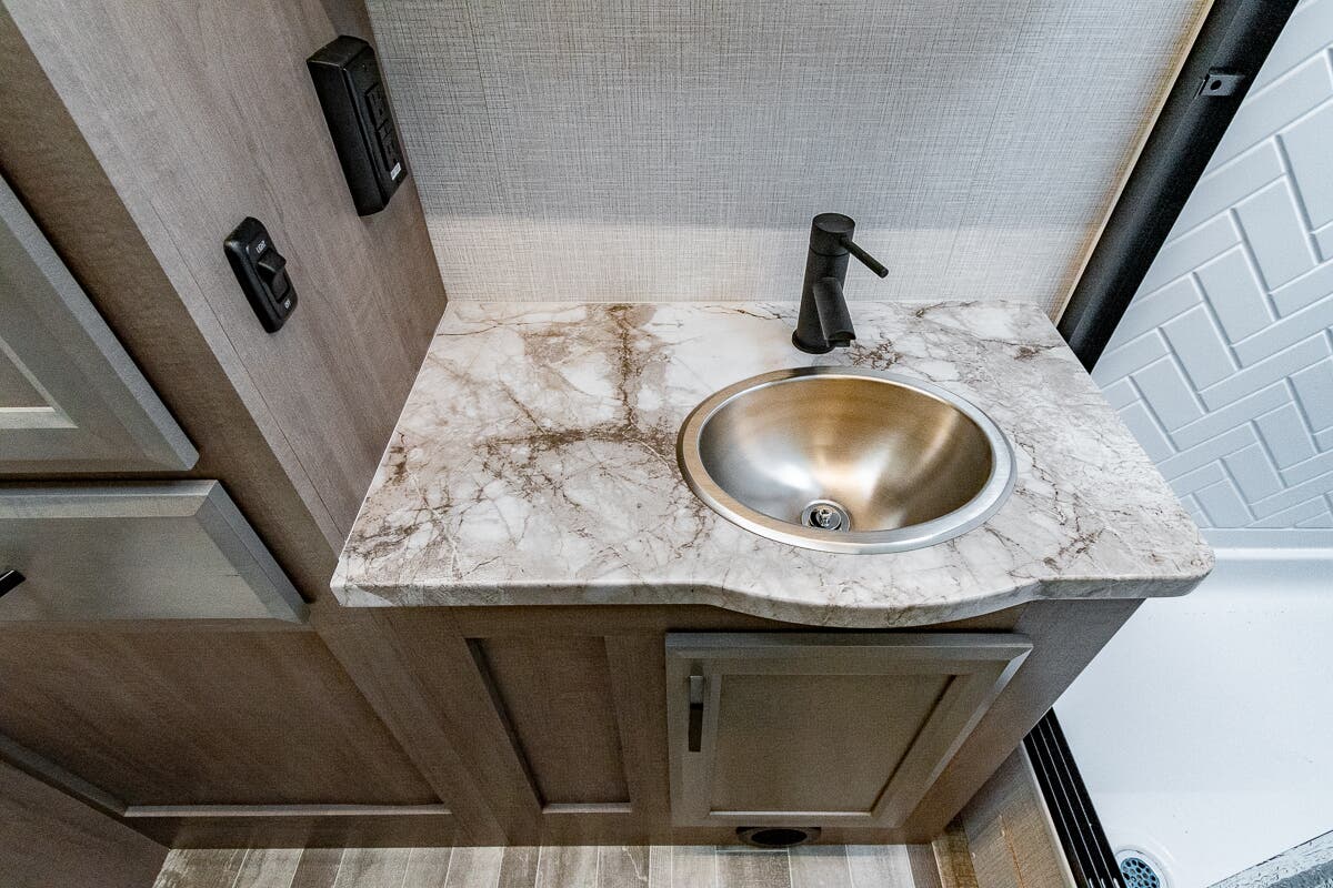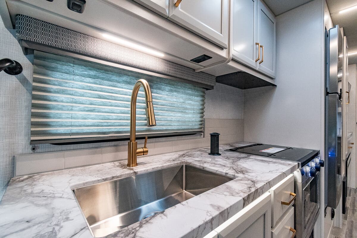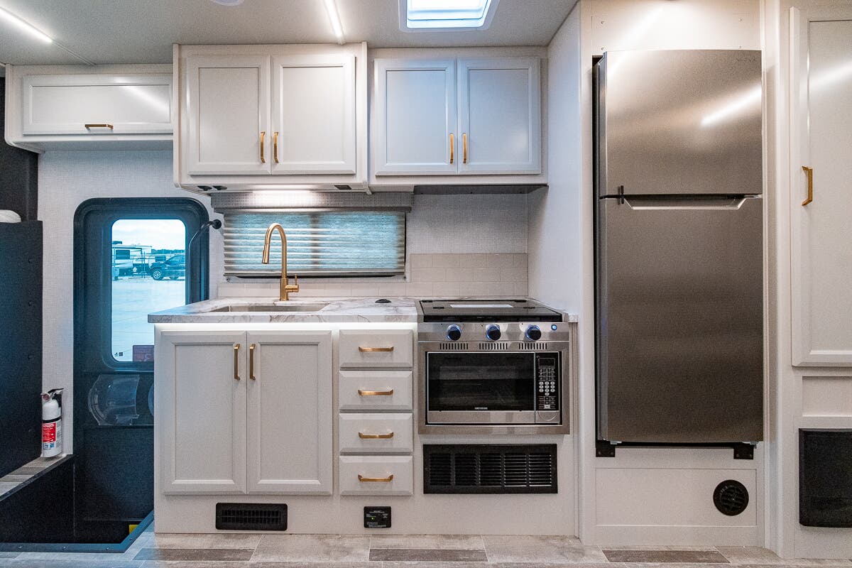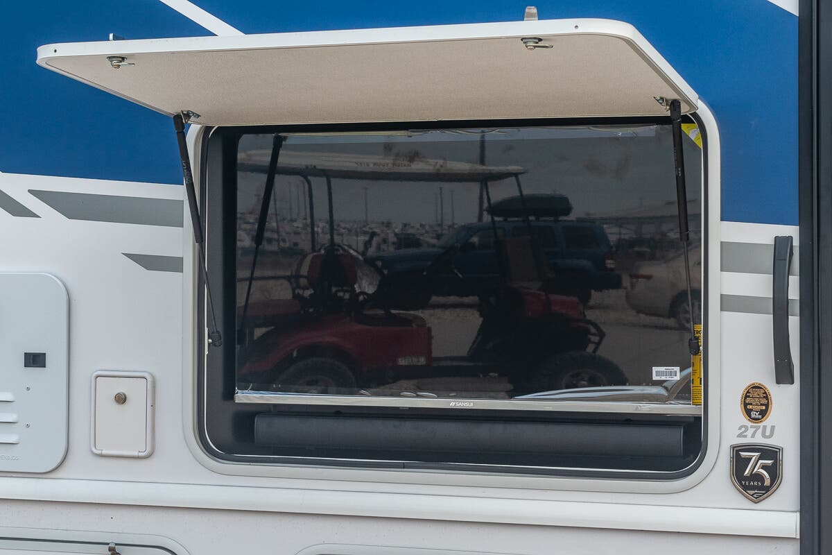 Pack your bags and head off on new adventures in this spacious coach! You will love gathering around the U-shaped dinette for a game or a meal, and the full-wall slide provides ample space to move around. An overhead bunk provides sleeping space for little ones or to be used as extra storage space. Since there is a queen Murphy bed, you will enjoy versatile seating and sleeping space, and the full rear bath will allow you to freshen up each day without having to use the camp's facilities. This model also includes a three burner range/convection microwave combo to cook meals on plus an exterior kitchen with a mini fridge, pull-out griddle, and storage when the weather is nice!