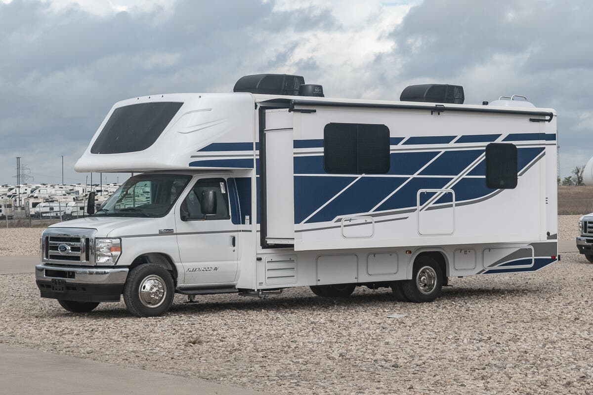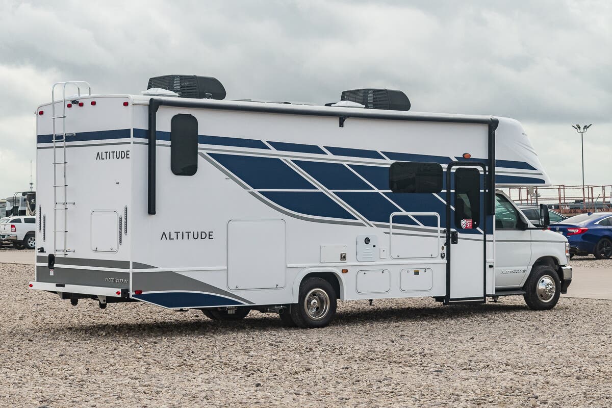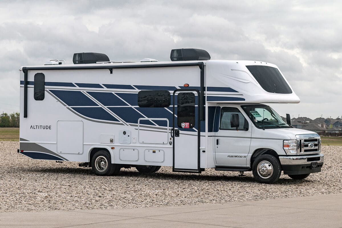 With any Altitude Class C gas motorhome by Fleetwood RV, you will enjoy unrivaled performance, unbeatable storage, and luxury at every turn! You will love the journey just as much as the destination with reclining back captain's chairs and side view cameras, plus there is a Ford 7.3L V8 engine for power you can feel. Each model features painted steel frame construction with a Powerlock System ll that interlocks the walls to the roof for added durability, along with Vacu-Bond aluminum framed sidewalls, roof, and floor. Outside, you'll find automatic hydraulic leveling jacks, patio lighting, slam latch luggage door handles, and a Winegard Air 360+ that will allow you to stay connected as you travel. Head inside to find Surf-X countertops, slide out fascia with coordinating interior wood color, hidden hinge cabinet doors, kitchen backsplash, and many more comforts!