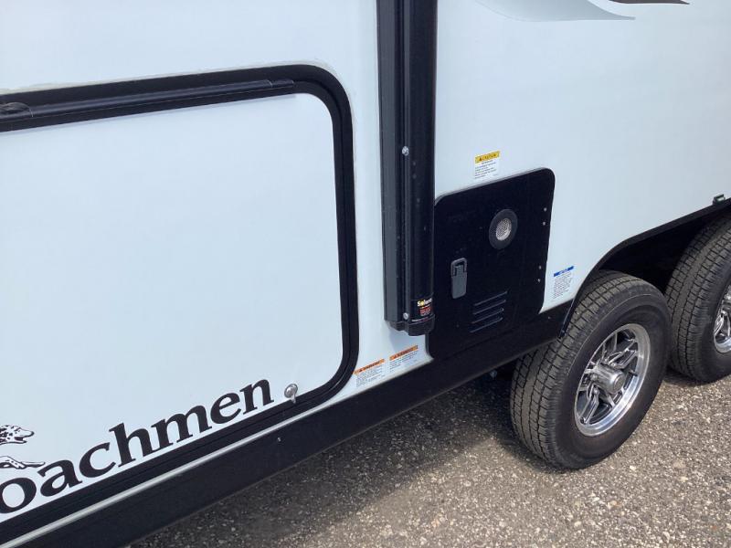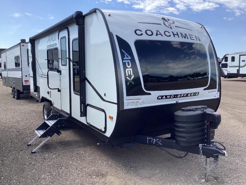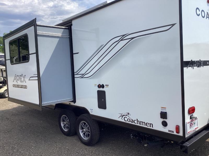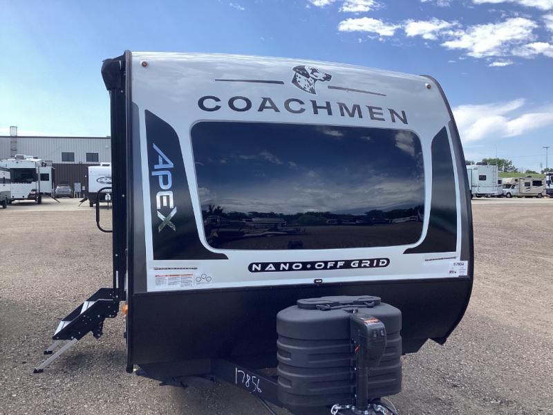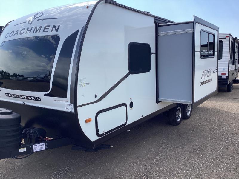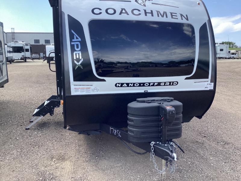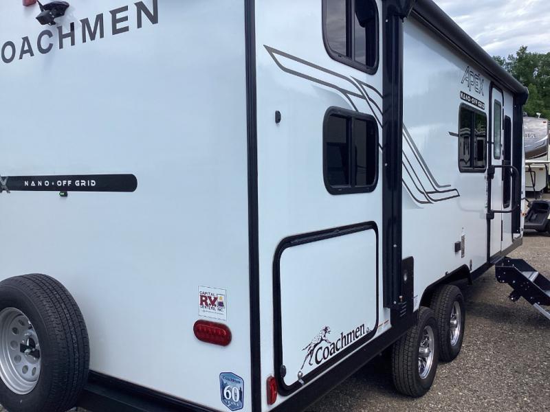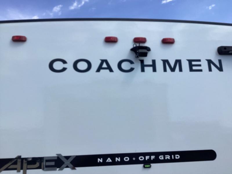 You will find comfort, convenience, and a sturdy construction with each of these Coachmen RV Apex Nano travel trailers! They are held together with an aluma-cage construction, an I-beam chassis, plus vacuum-bonded laminated dual Azdel fiberglass walls for double the protection against the elements. The 200-watt solar panel with a 30 amp control charger is included within the Off-Grid Package, along with two 20 lb. LP tanks, a high velocity power roof vent, plus 12V outlets to keep you powered up. More exterior feature include a hot/cold shower, four stabilizer jacks, a power awning with LED lighting, and magnetic baggage door catches to easily pack and unload your gear. You will love the interior of your Apex Nano with Congoleum residential flooring, one-piece seamless edge countertops, matte black hardware in the galley, and a hand-crafted wood medicine cabinet in the bath.