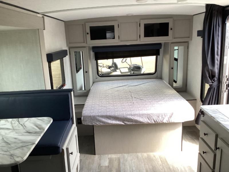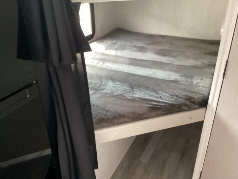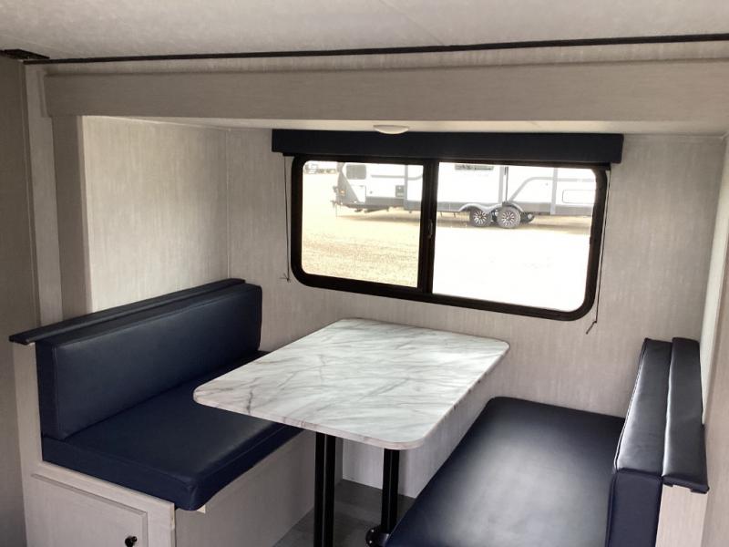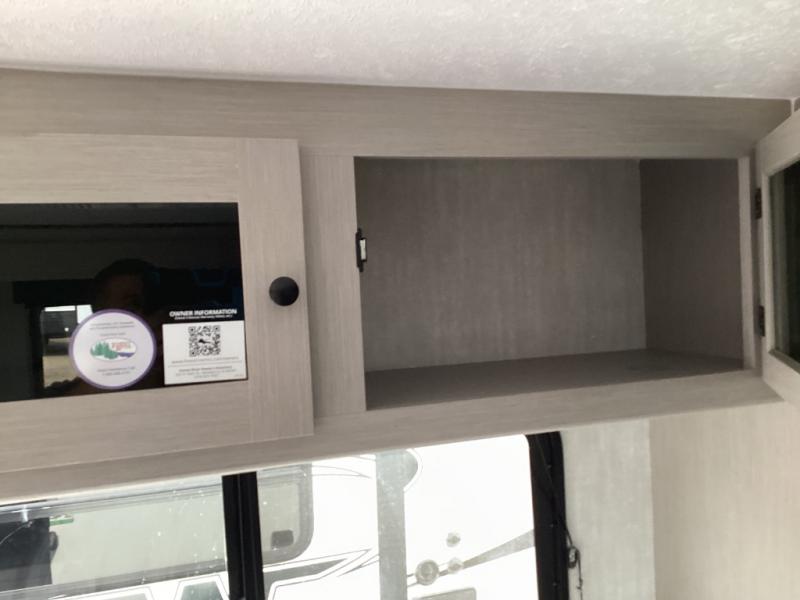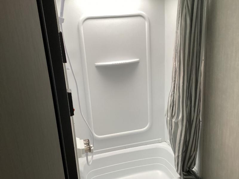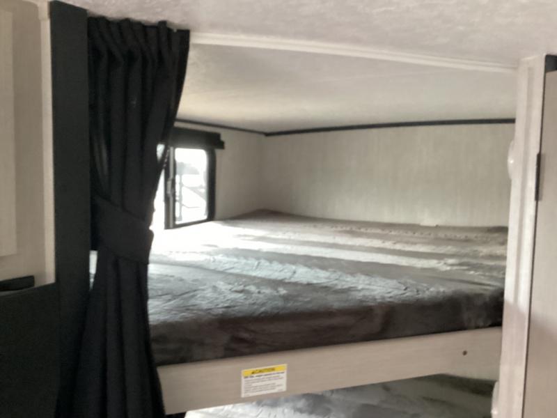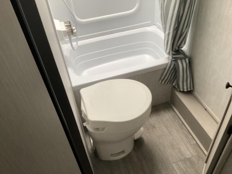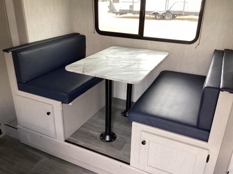 You and a few friends or family members can camp comfortably in this travel trailer! It features a front queen bed with wardrobes on either side to keep your clothes out of the way or you can switch it out for the optional Murphy bed for more versatility. Two others can sleep on the rear corner upper double bed and lower flip up double bed. After you have fried up some eggs on the two burner cooktop and heated up a piece of banana bread in the microwave, you can head to the booth dinette slide to enjoy it. There is even a pantry to store your coffee grounds and snacks. Now that your bellies are full, you can freshen up in the rear corner bathroom with the tub/shower.