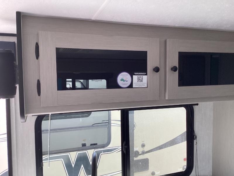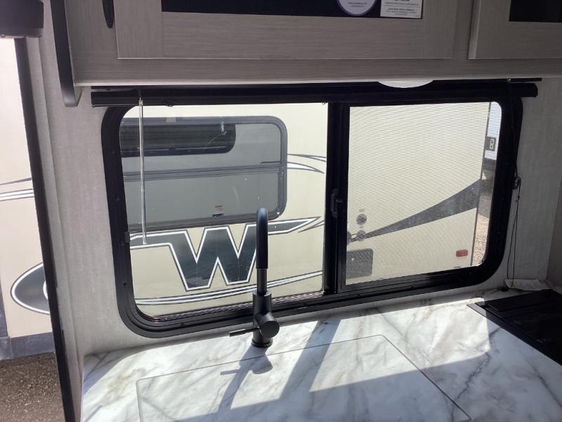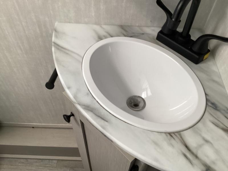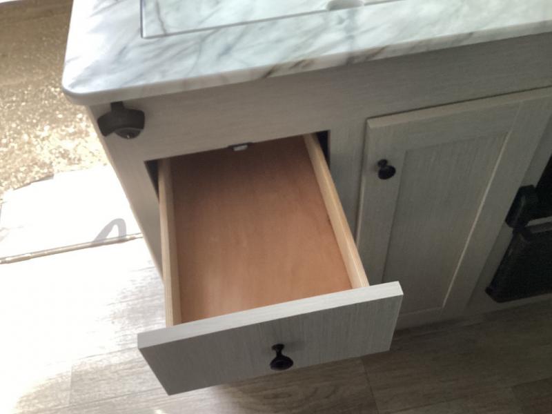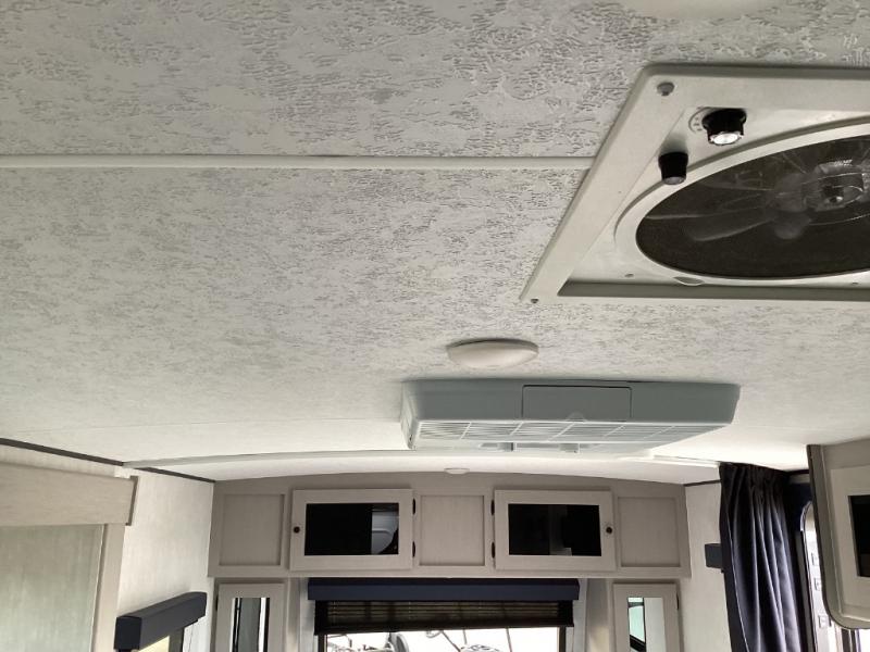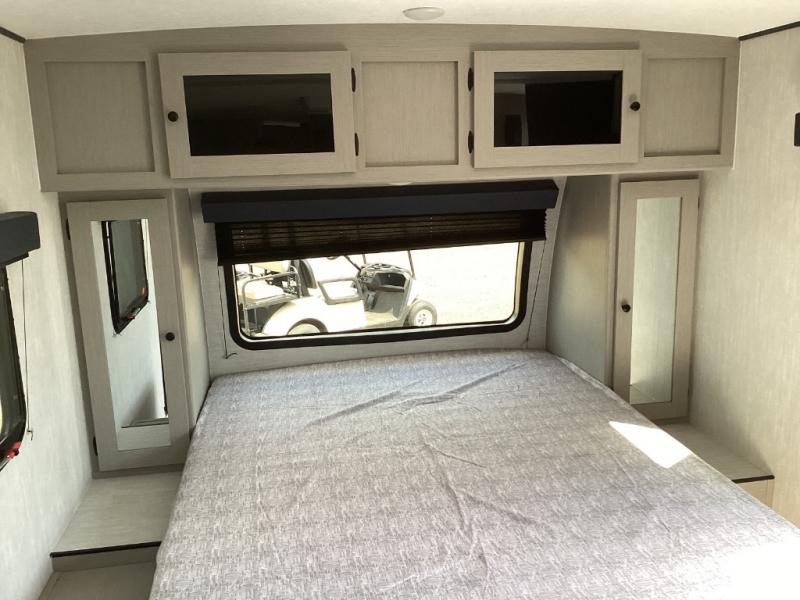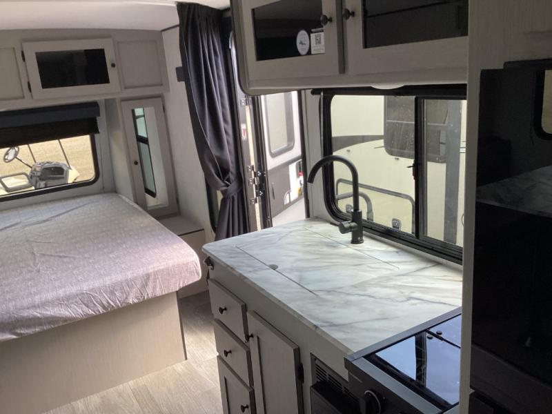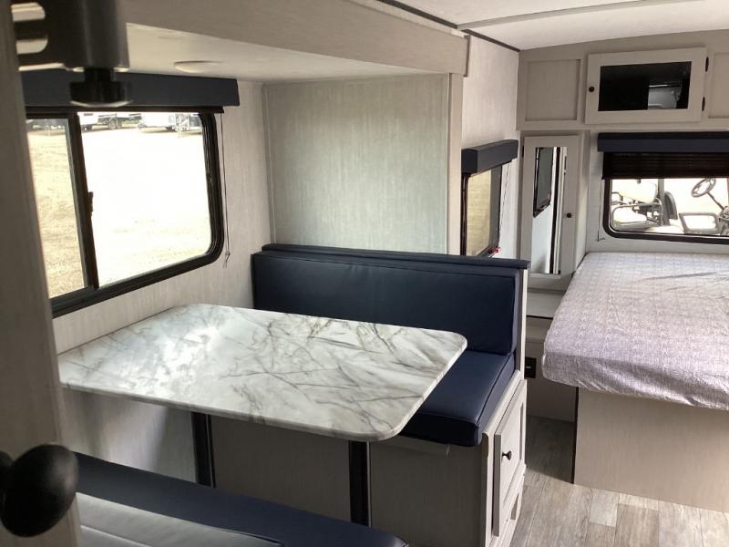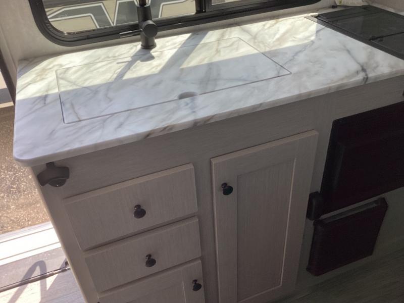 You and a few friends or family members can camp comfortably in this travel trailer! It features a front queen bed with wardrobes on either side to keep your clothes out of the way or you can switch it out for the optional Murphy bed for more versatility. Two others can sleep on the rear corner upper double bed and lower flip up double bed. After you have fried up some eggs on the two burner cooktop and heated up a piece of banana bread in the microwave, you can head to the booth dinette slide to enjoy it. There is even a pantry to store your coffee grounds and snacks. Now that your bellies are full, you can freshen up in the rear corner bathroom with the tub/shower.