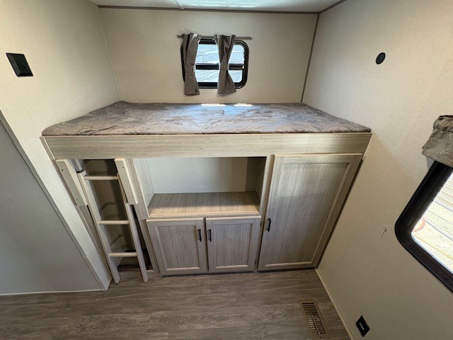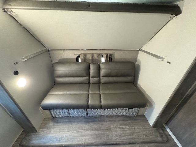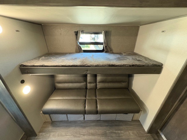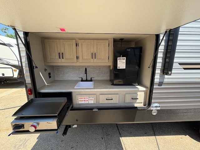 The whole gang will have a good time camping in this travel trailer! There is a place for everyone to sleep between the rear private bunkhouse with a 40" x 74" loft bed and a flip up bunk bed above a jackknife sofa, and the front private bedroom has a 60" x 74" queen bed slide, plus the booth dinette and 60" sofa in the main living area can provide extra sleeping spaces. You could even choose to switch out the bunk and sofa for an optional queen bed instead. The bedroom also has a dresser and a front closet that is big enough for your clothes and an area with washer and dryer prep. The chef can choose to either cook indoors with the three burner cooktop or breathe in some fresh air while cooking at the outside camp kitchen with a refrigerator, a sink, overhead cabinets, and a grill with drawers next to it for your cooking utensils!