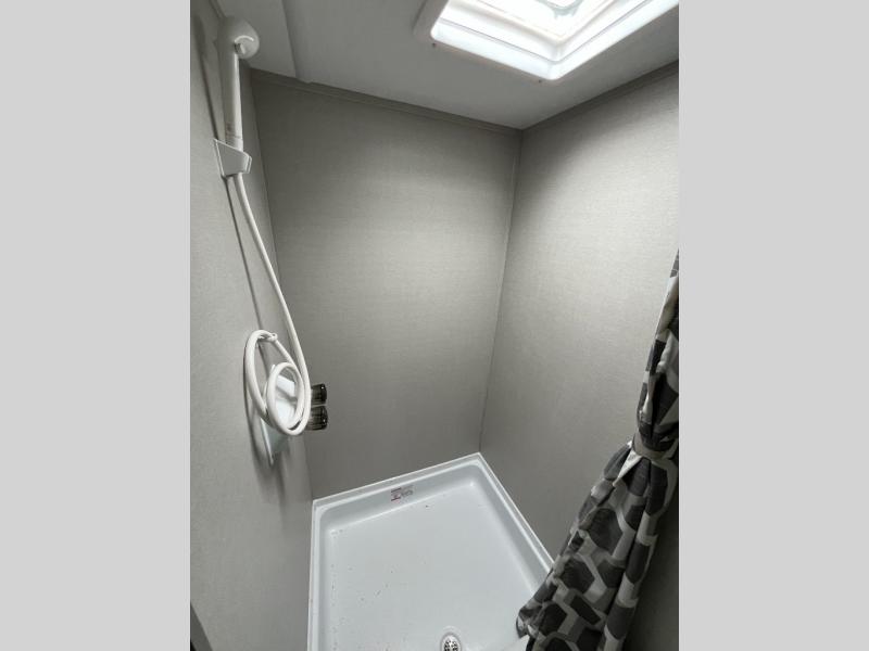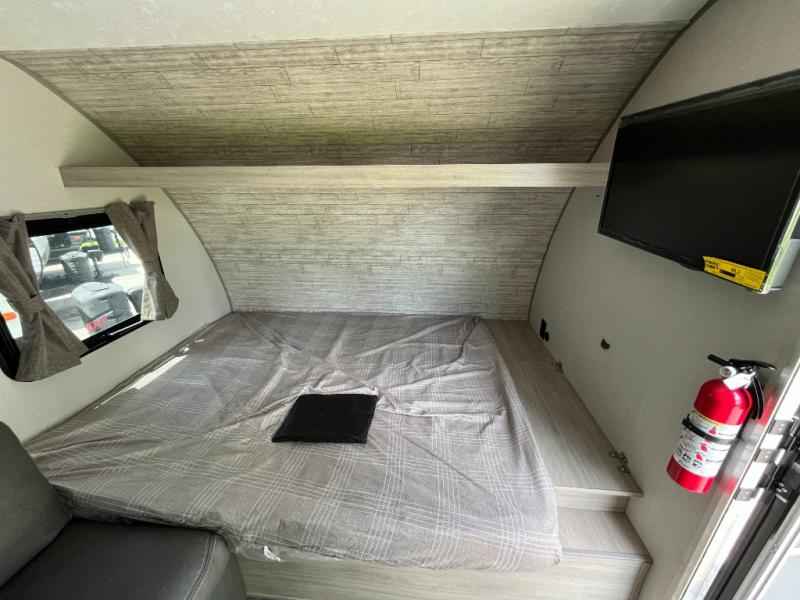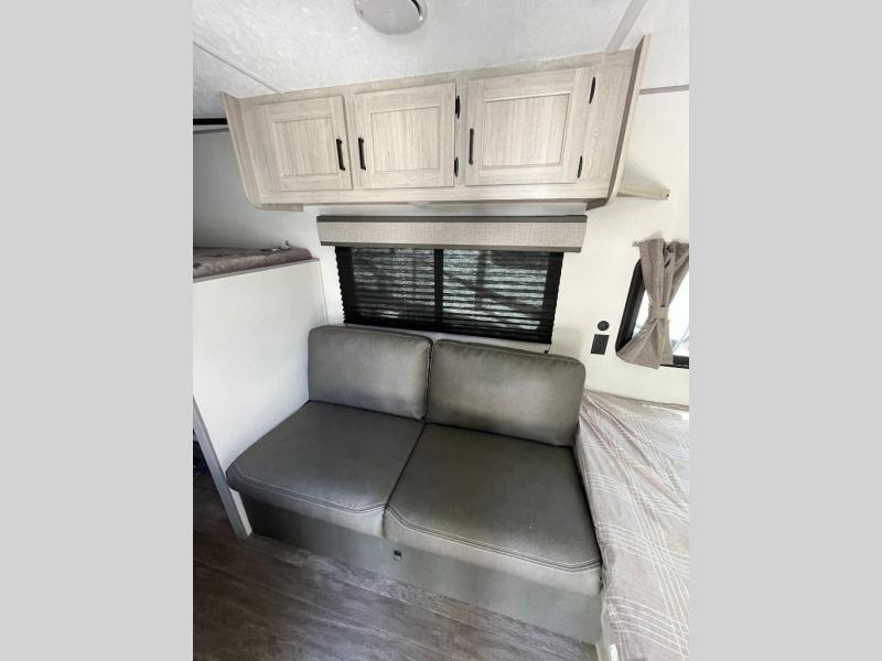 This cozy travel trailer can sleep five, so pack up and head out! You will have a queen bed up front to sleep on each night instead of an air mattress, and the little ones can take the 28" x 70" bunk beds! There is also a 60" sofa here that can sleep an additional guest and is perfect for relaxing during the day. The two burner cooktop and microwave oven means you won't have to cook over a campfire, and the private toilet and shower lets you clean up after a day outdoors. This model includes plenty of storage space, including bedroom storage, an exterior pass-through, plus additional outside storage beneath the bunks for hiking gear!