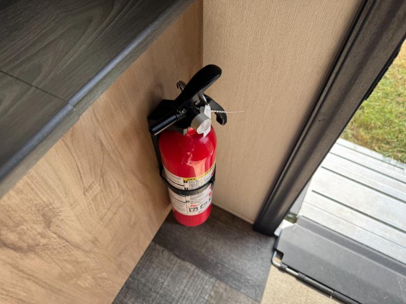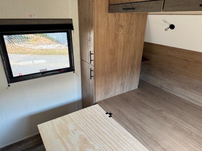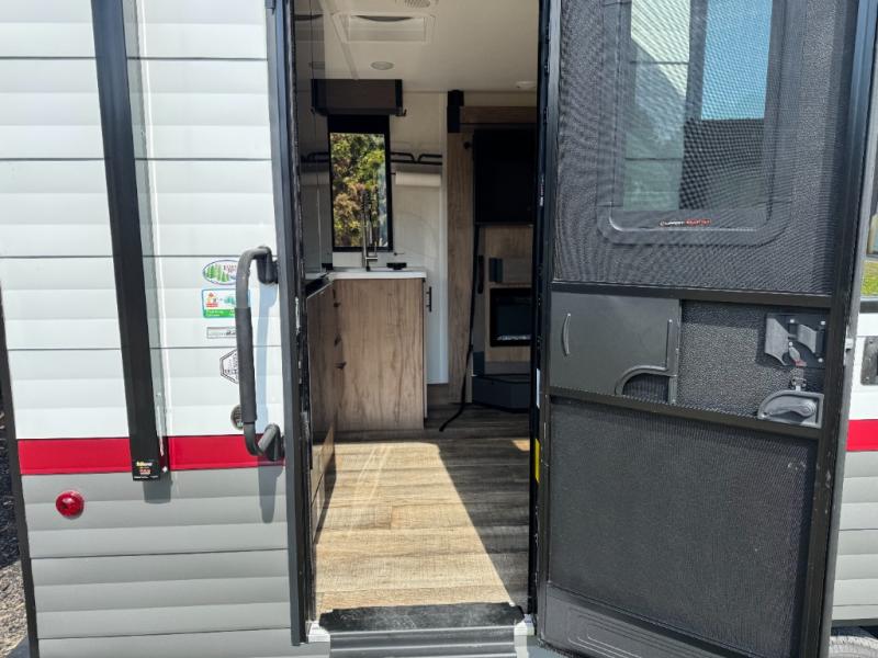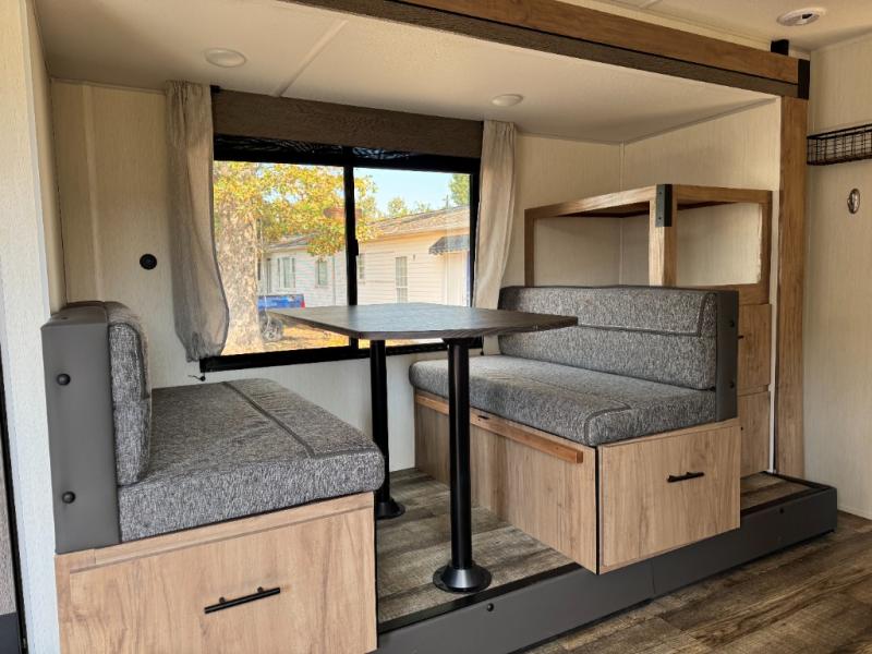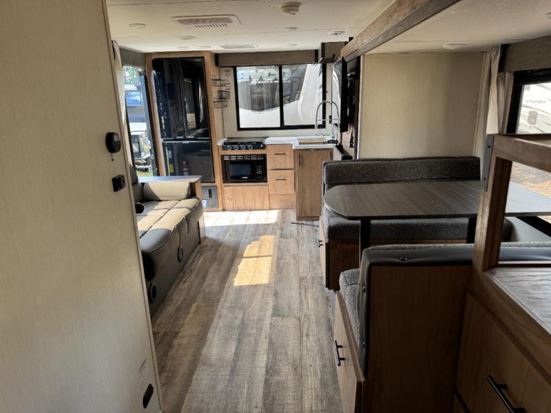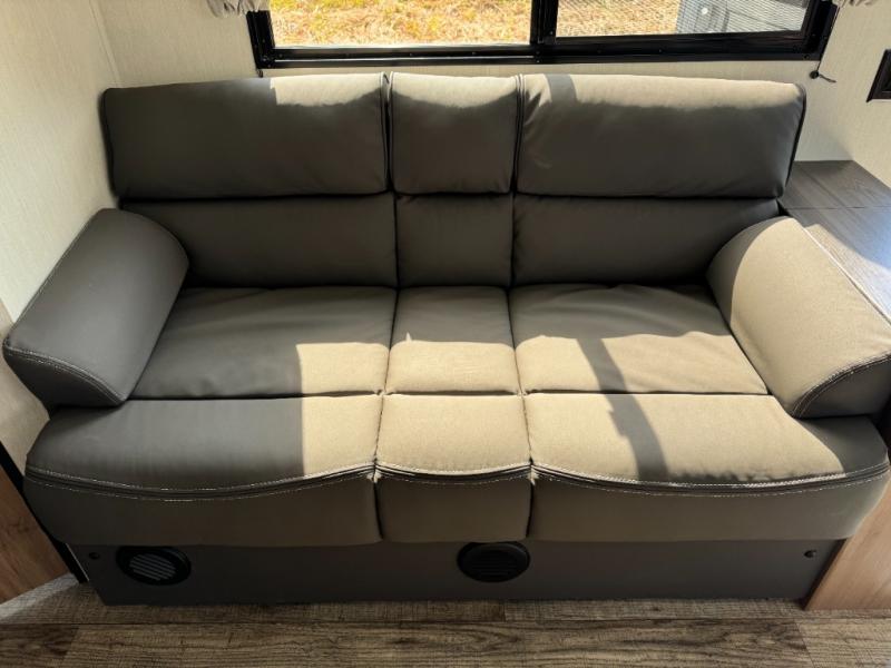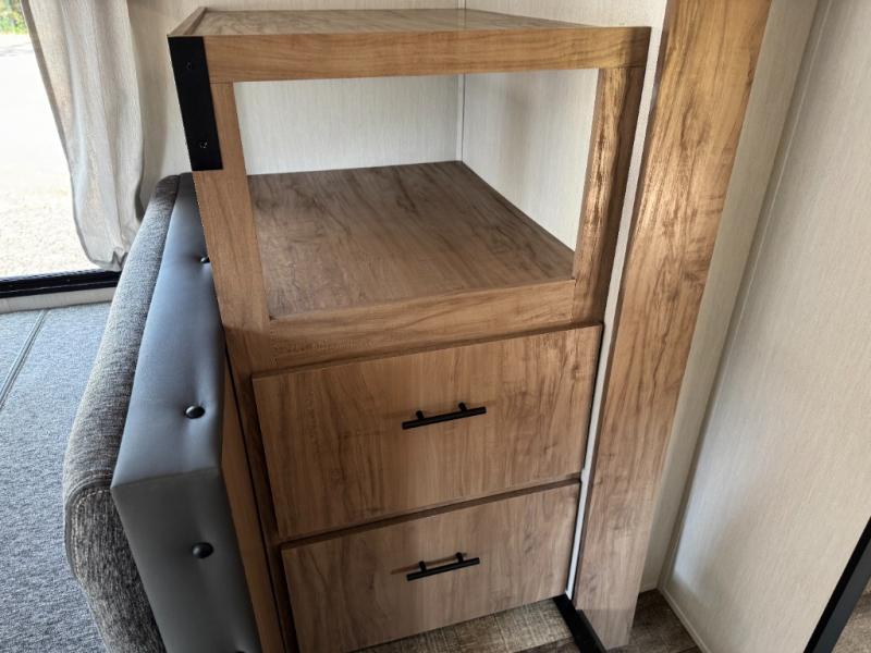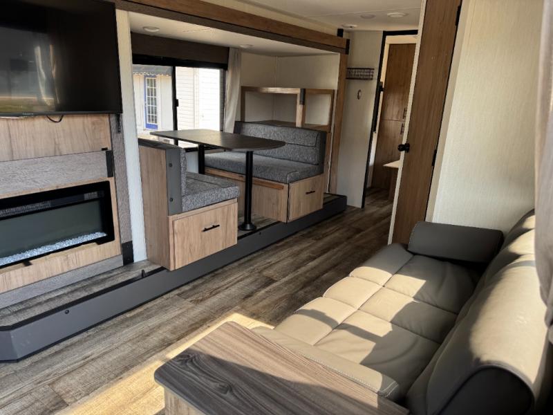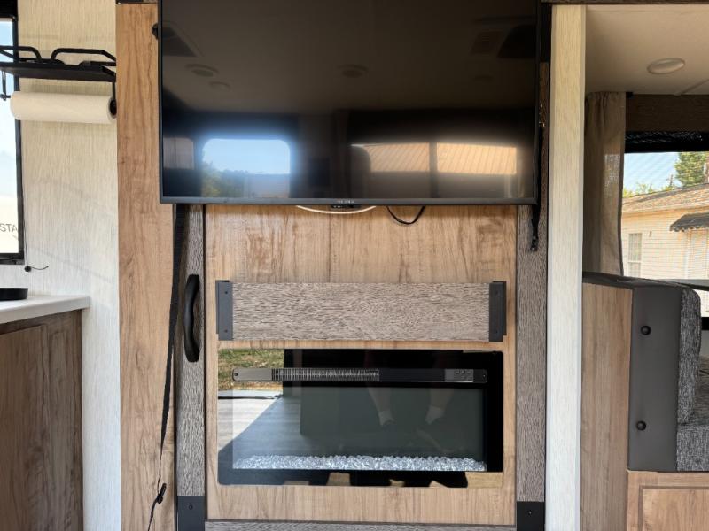 It won't be hard to find comfort in this spacious travel trailer! A front private bedroom is sure to make you feel right at home, and you'll find a bedside wardrobe, overhead cabinets, plus a TV mount if you choose to add entertainment here. In the main living area, your crew can relax on the sofa with panoramic windows behind it for great outdoor views. There is also a booth dinette within the large slide out. Ample storage is also found here, including hidden shelves behind the entertainment center with a fireplace. Head to the rear kitchen where you'll find generous counter space and all the appliances needed to make meals each day!