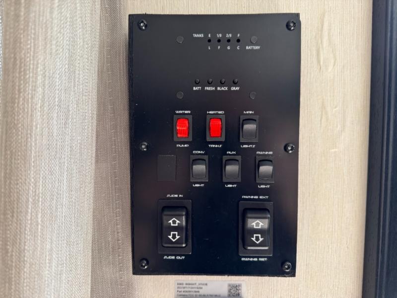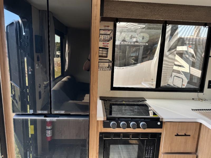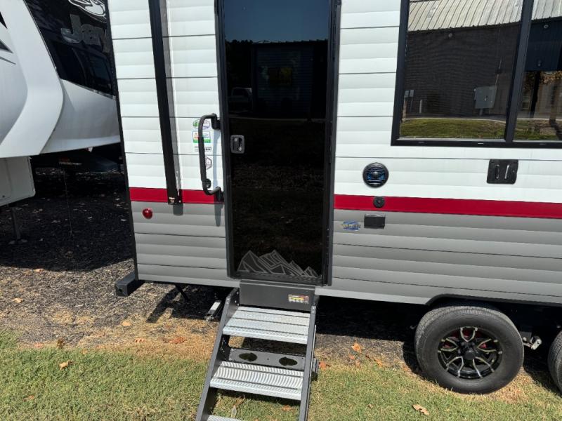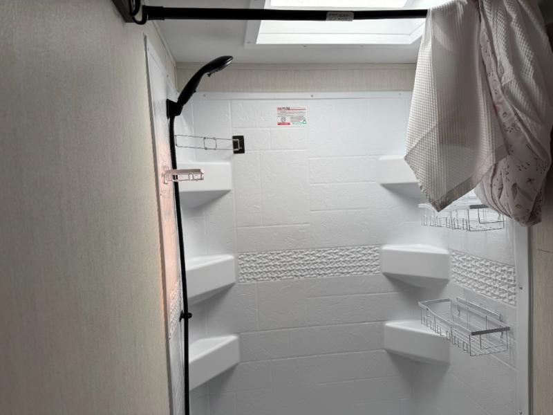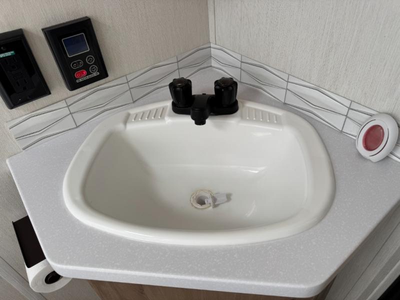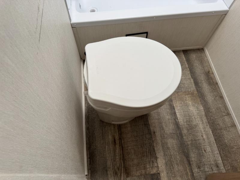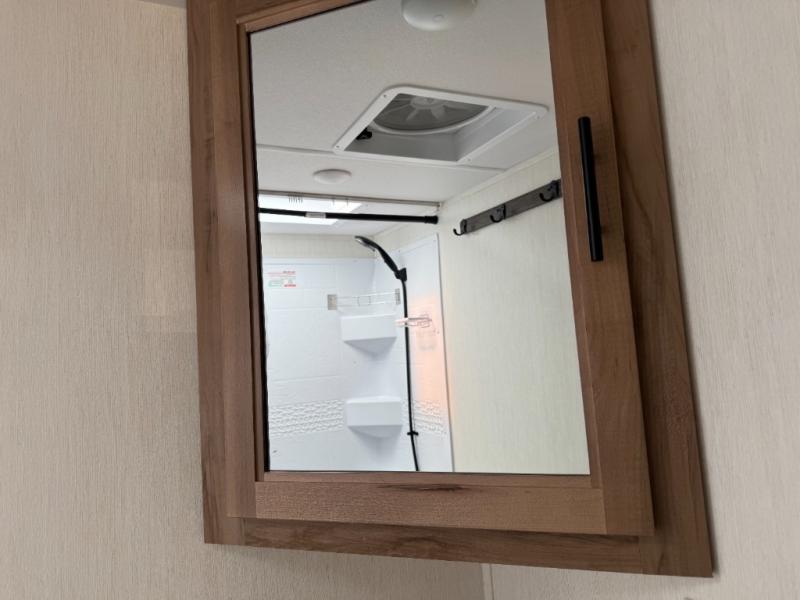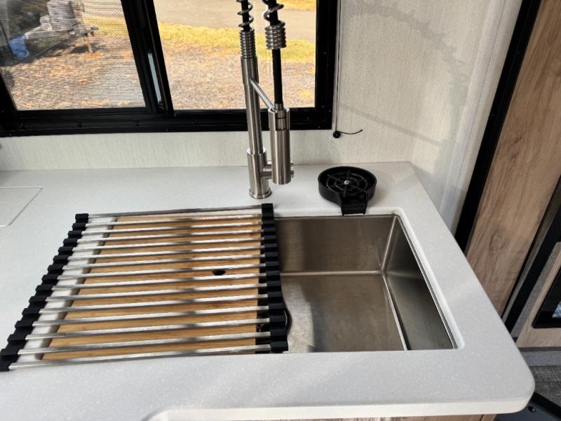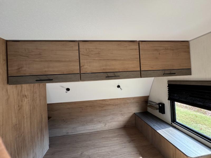 It won't be hard to find comfort in this spacious travel trailer! A front private bedroom is sure to make you feel right at home, and you'll find a bedside wardrobe, overhead cabinets, plus a TV mount if you choose to add entertainment here. In the main living area, your crew can relax on the sofa with panoramic windows behind it for great outdoor views. There is also a booth dinette within the large slide out. Ample storage is also found here, including hidden shelves behind the entertainment center with a fireplace. Head to the rear kitchen where you'll find generous counter space and all the appliances needed to make meals each day!