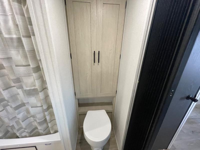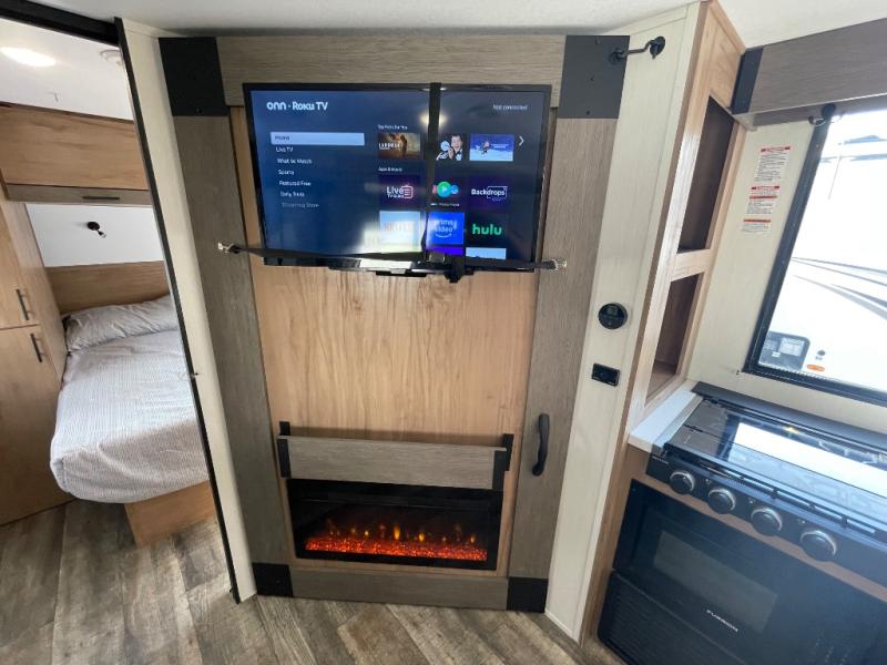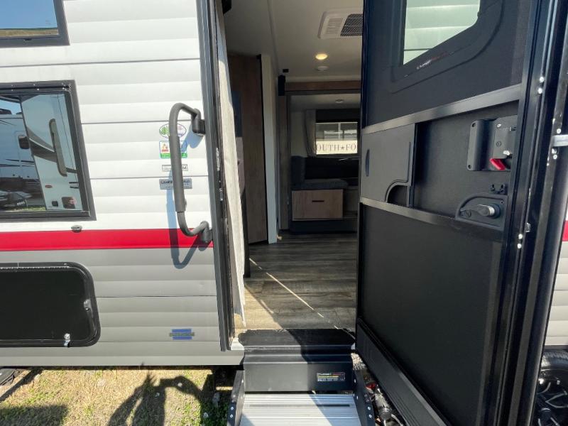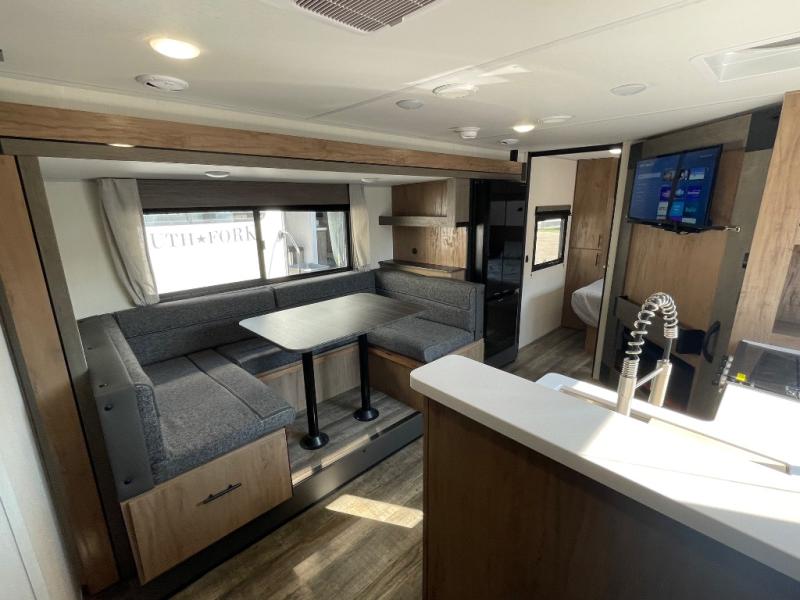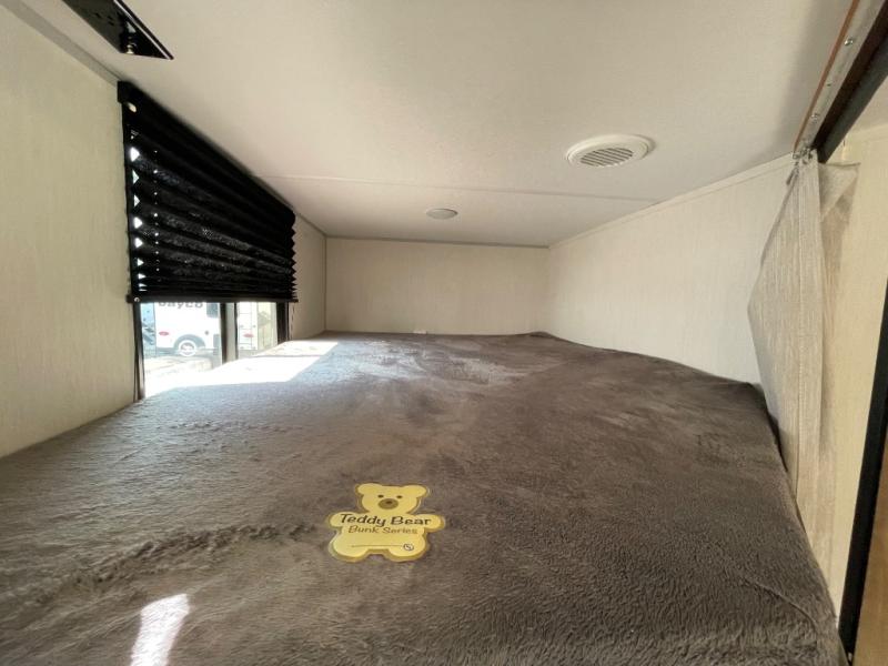 You'll love the double-size bunks in this unit for extra guests! You will appreciate the extra deep storage under the bunks for your guests' belongings, and there is more storage found throughout for camp necessities. The chef will have their choice to cook at the outside kitchen or stay warm inside by the fireplace. After dinner, everyone can gather around the U-shaped dinette for game night, and the hidden shelves behind the entertainment center will be perfect for books, movies, or snacks! Having your own bedroom with a camp king bed will have you feeling right at home, and you can even bring a television along since there is a TV mount here!