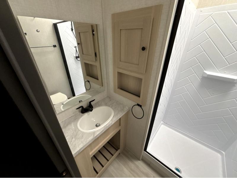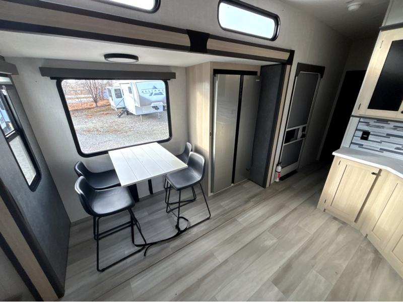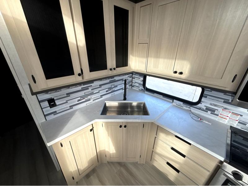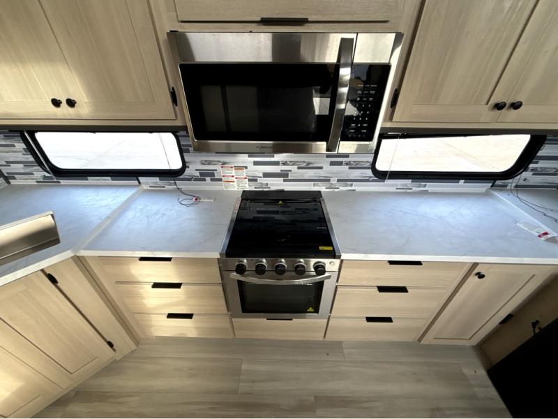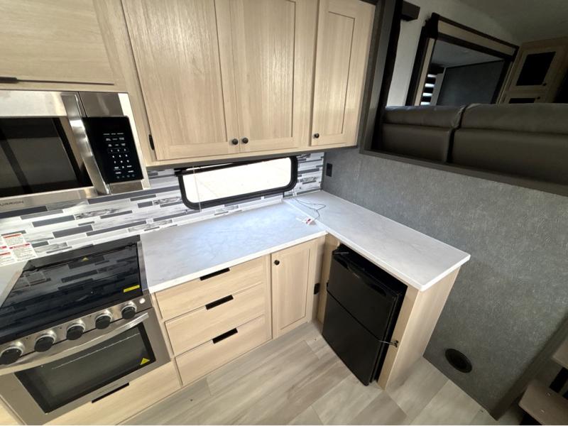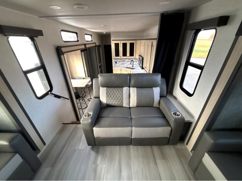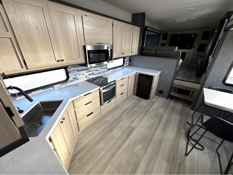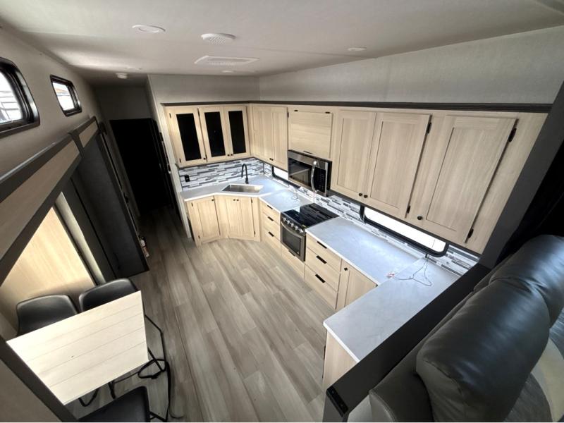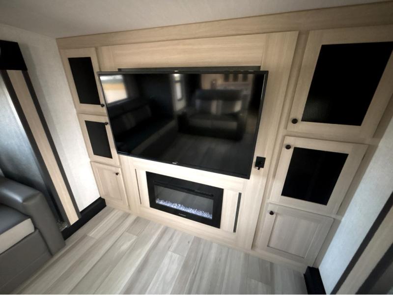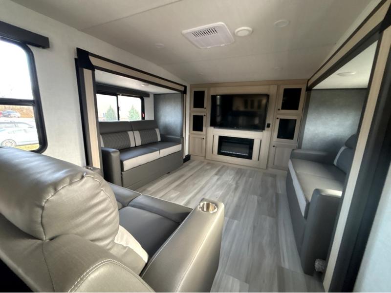 This fifth wheel is packed with features to make each trip enjoyable! The middle kitchen might be your favorite room with wrap-around counter space, a pantry, and a 16 cu. ft. 12V refrigerator for food storage. You can dine at the hi-top table and chairs here, or sit in the front living area on the dual sofas and theater seating! This area can become your guests bedroom at night since there are dual opposing slides and wardrobe storage for their things. You will also find a full-length wardrobe in the rear private bedroom, along with a king bed slide out, plus washer and dryer prep! And of course there is a full bath so everyone can stay clean each day!