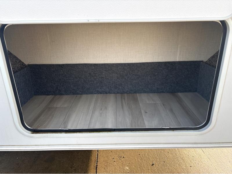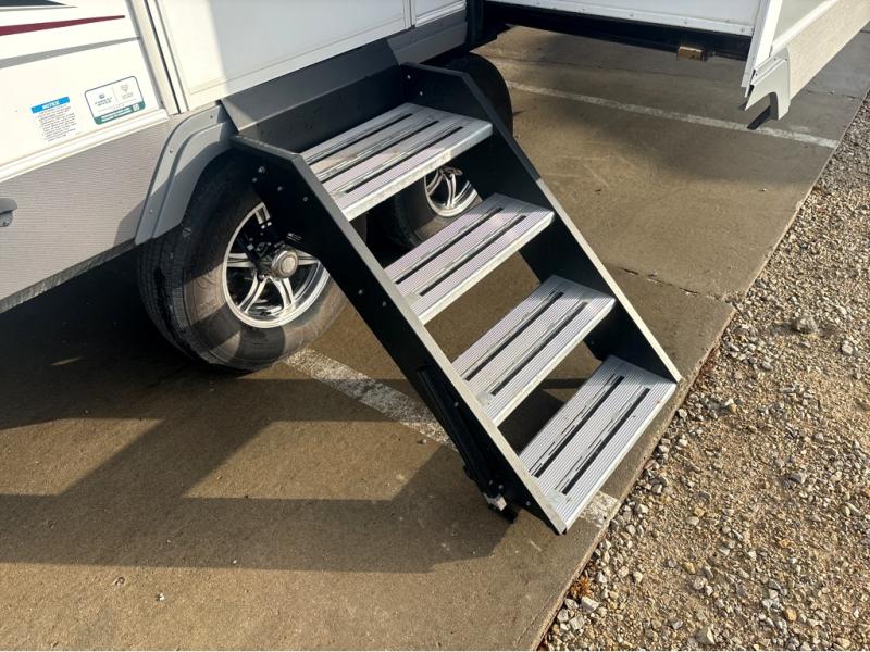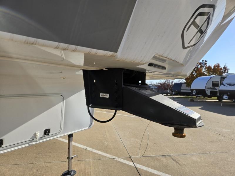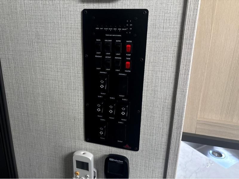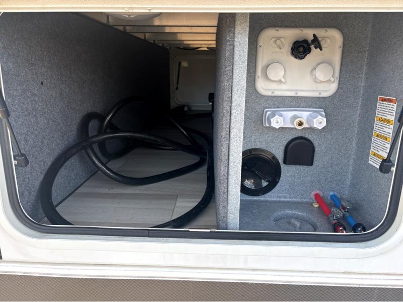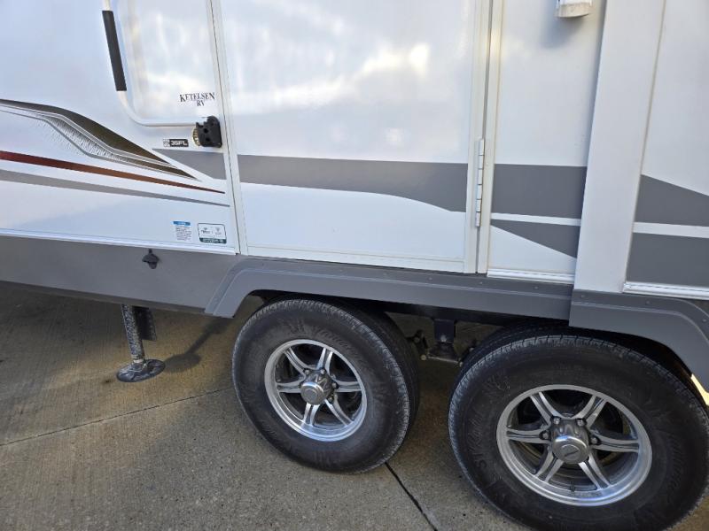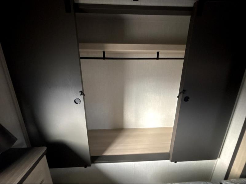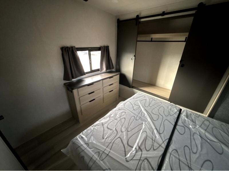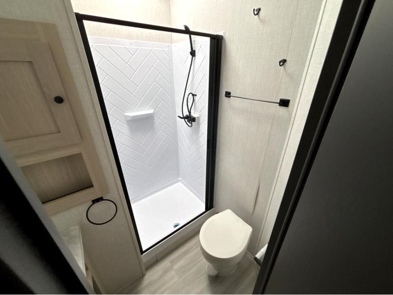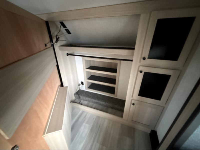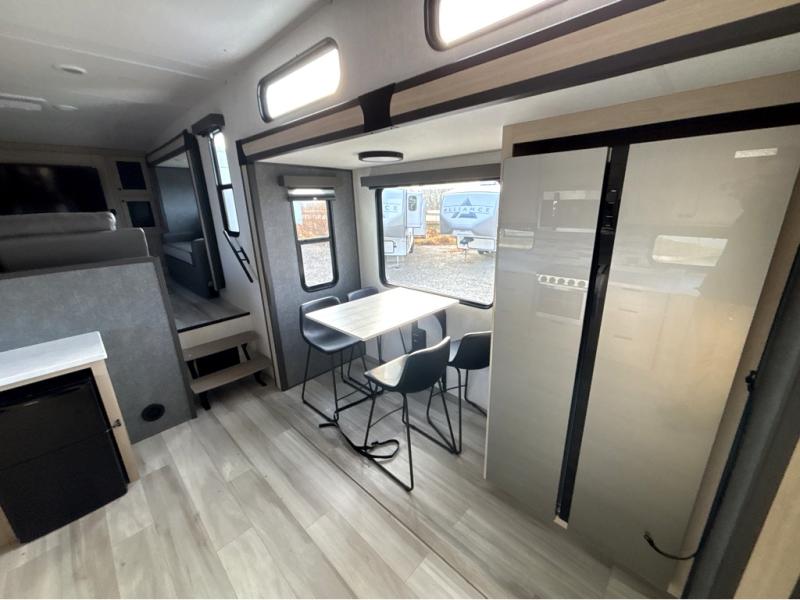 This fifth wheel is packed with features to make each trip enjoyable! The middle kitchen might be your favorite room with wrap-around counter space, a pantry, and a 16 cu. ft. 12V refrigerator for food storage. You can dine at the hi-top table and chairs here, or sit in the front living area on the dual sofas and theater seating! This area can become your guests bedroom at night since there are dual opposing slides and wardrobe storage for their things. You will also find a full-length wardrobe in the rear private bedroom, along with a king bed slide out, plus washer and dryer prep! And of course there is a full bath so everyone can stay clean each day!