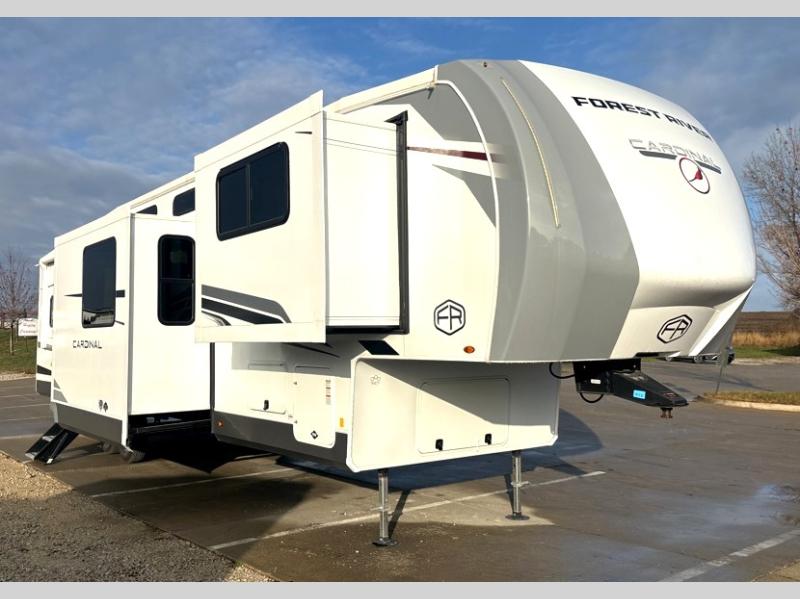 With any Cardinal fifth wheel by Forest River you will enjoy affordable luxury at every turn. These models are constructed with residential fiberglass insulation in the roof and floor, a sectioned ABS plastic underbelly armor, and a vacuum bonded, welded aluminum structure for added strength and durability. You will also find seamless roto-cast holding tanks, an outdoor shower, and 4-point auto leveling for quick and easy setup. Each model includes a best-in-class, high-efficiency 35,000 BTU furnace, along with a 18,000 BTU ducted A/C, with second and third A/C prep, plus an on-demand tankless water heater for added convenience. There are carpet-free living spaces, residential backsplash, motion lighting throughout, and many more comforts!