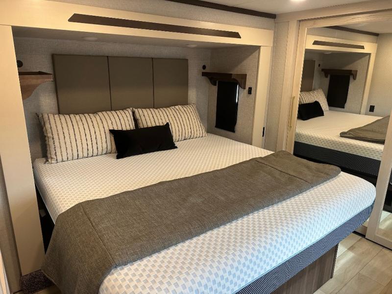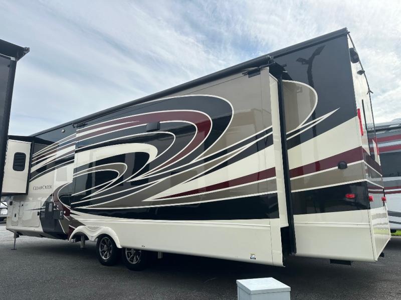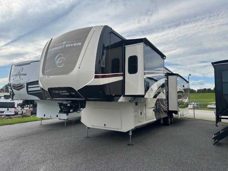 With any Cedar Creek fifth wheel by Forest River, you will find a quality-built RV with your comfort in mind! The all-aluminum super structure on 16" centers or less will provide a solid foundation to your fifth wheel, and the 3M bonded sidewalls will hold up over years of use. Each model also includes a Road Warrior suspension for smooth towing, a 21,000 lb. Rhino box hitch, and a new 101" wide body frame. Inside, you'll enjoy walnut/two tone wooden cabinets and fascias, day/night roller shades, motion lighting in the bath and bedroom closet, plus many more comforts. The new CradlePoint WiFi/5G antenna and Day 1 connectivity will help keep you connected as you travel, and the "Rich Solar" 200W solar panel will give you off-grid capabilities!