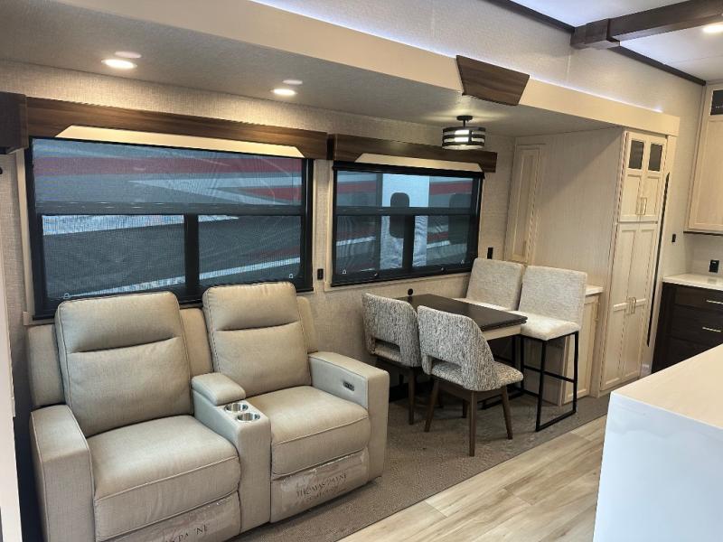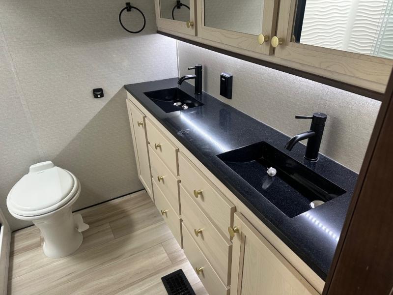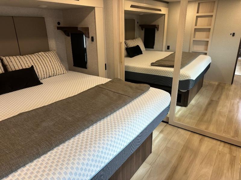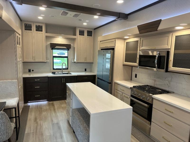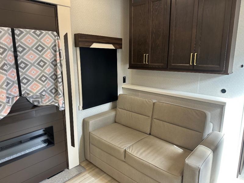 It will feel like coming home each time you take this fifth wheel out! The dual opposing slides in the main living area make your space open, and the waterfall island with swivel chairs will be the perfect place to prep meals, dine together, or set out snacks for movie night! You will also love the rear counter space with a large sink to clean up each day and there is a dishwasher option if you want the option to make the process even easier. A tri-fold sofa in the main living area will provide a place for a guest or two to sleep, and the Murphy pantry hidden behind the entertainment center and fireplace will keep snacks stocked up. The full bath includes a shower with a seat, dual bath sinks, plus a linen closet to keep towels tidy. What could make this fifth wheel better than a king bed slide out in the front bedroom?! How about a large wardrobe with washer/dryer prep, a dresser with a TV above, and overhead storage for belongings!