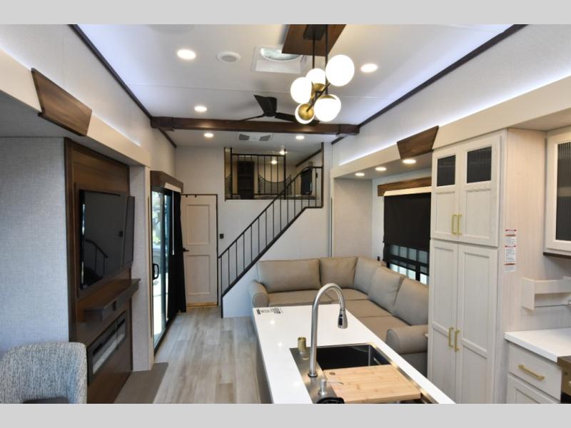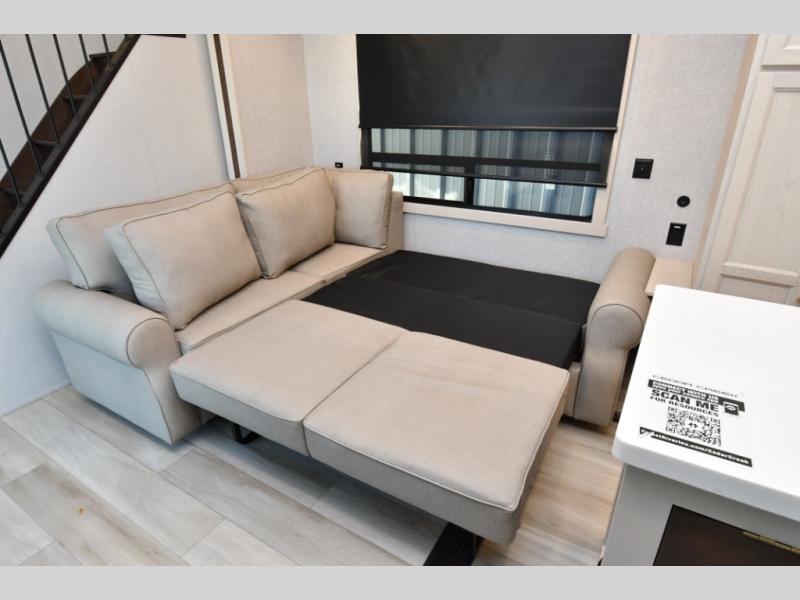 Experience the perfect blend of residential luxury and vacation-ready convenience with the pre-owned 2025 Forest River Cedar Creek Cottage 40CBK. This destination trailer offers spacious living areas, multiple sleeping spaces, and premium amenities designed for extended stays at your favorite getaway location. With dual entry doors, front and rear lofts, and a master bedroom with a king bed, there’s room for everyone to relax and recharge. The fully equipped kitchen, including a center island with fold-down breakfast counter and free-standing dinette with extension, makes meal prep and entertaining effortless. Enjoy the living area’s large L-shaped sectional sofa, swivel-mounted Smart TV, and cozy fireplace for evenings spent indoors, while the included washer and dryer make extended stays simple and convenient.