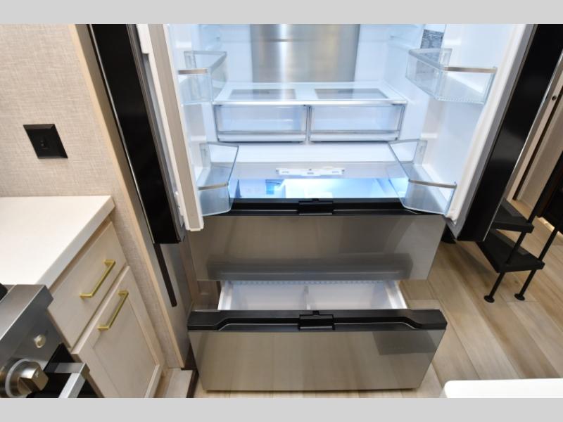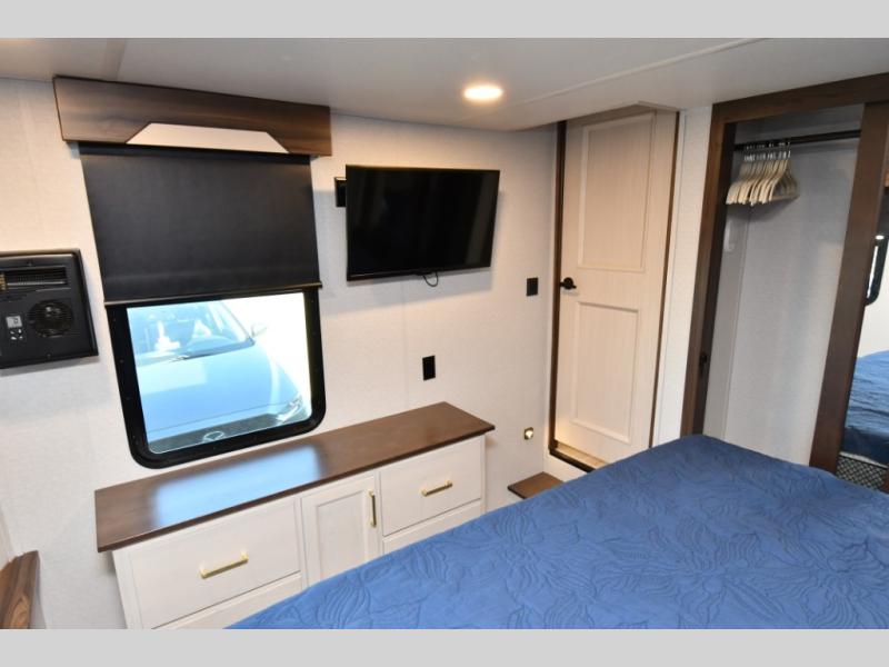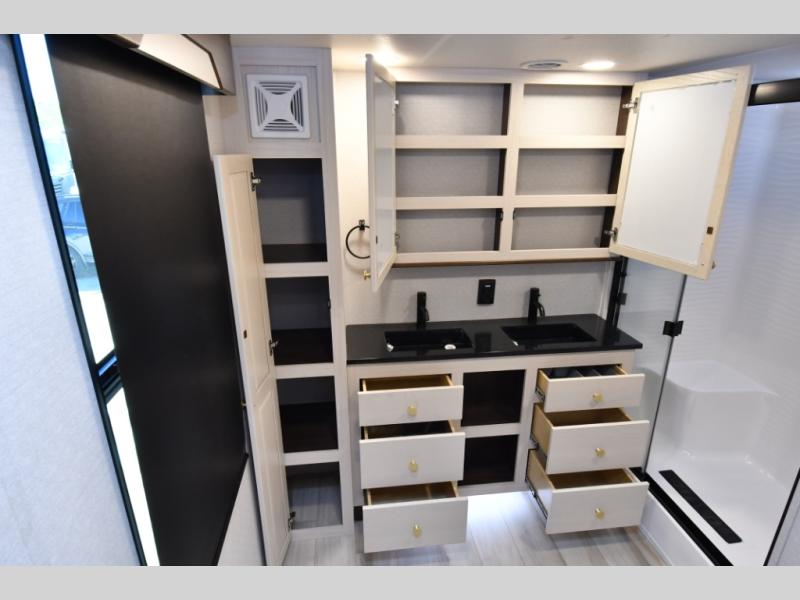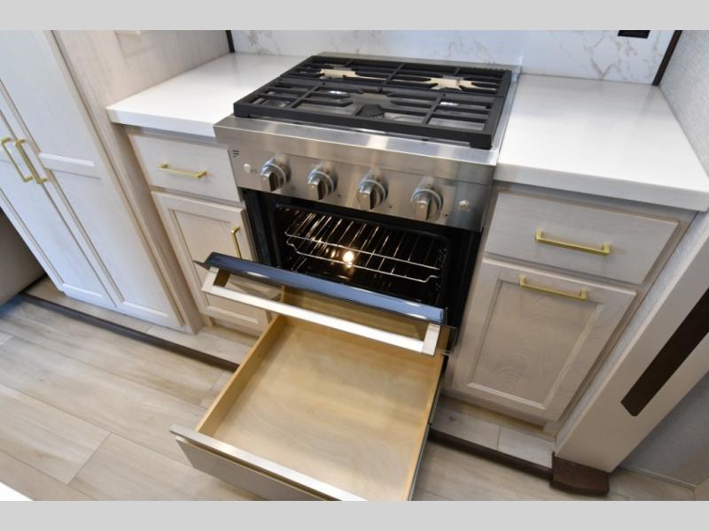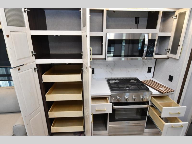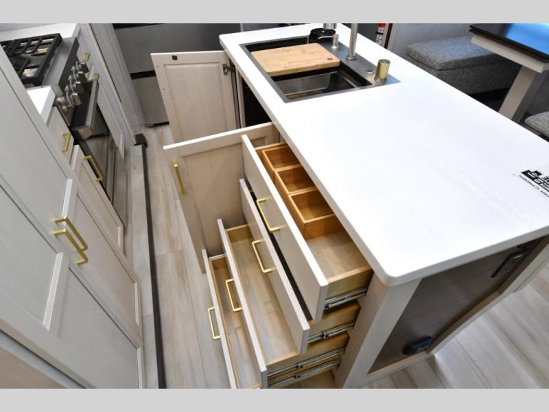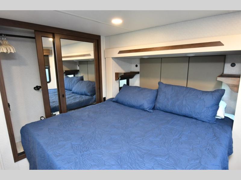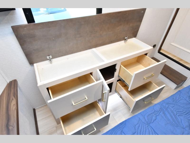 Residential-quality cabinetry, flush-floor slides, and luxurious bedroom décor