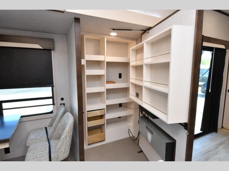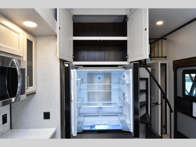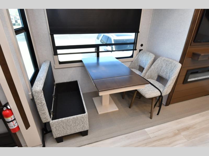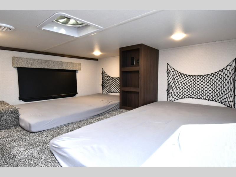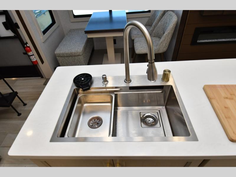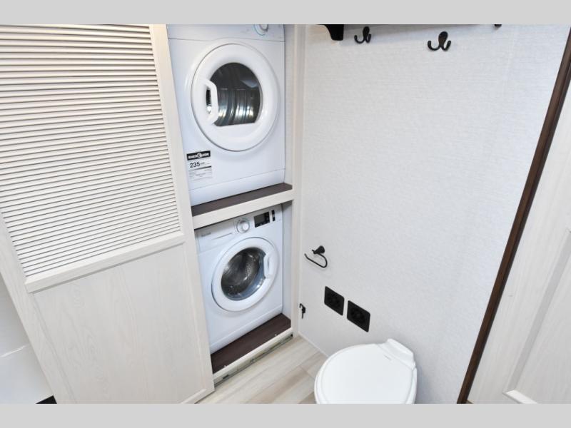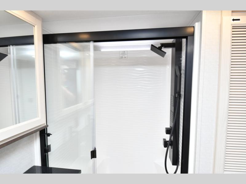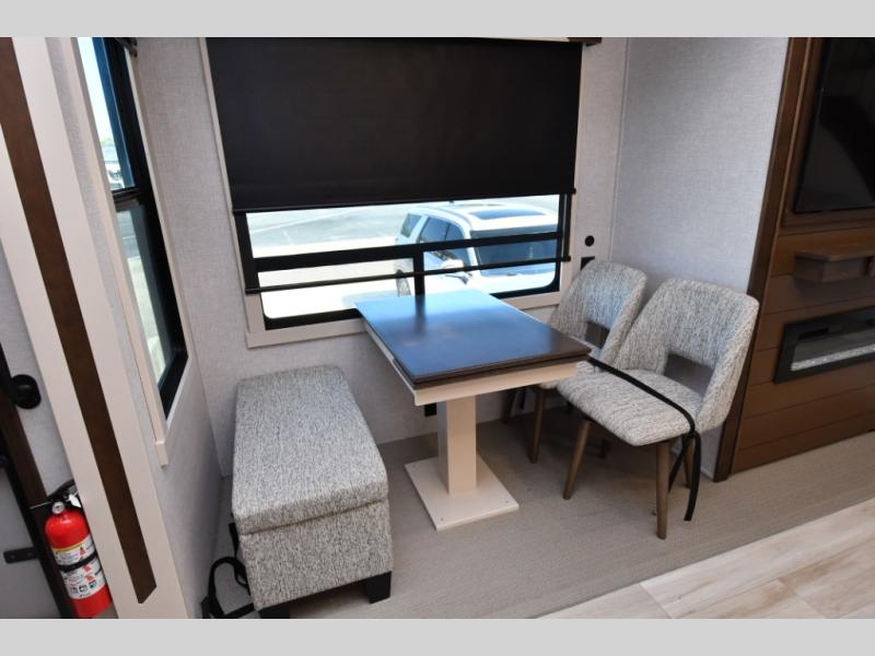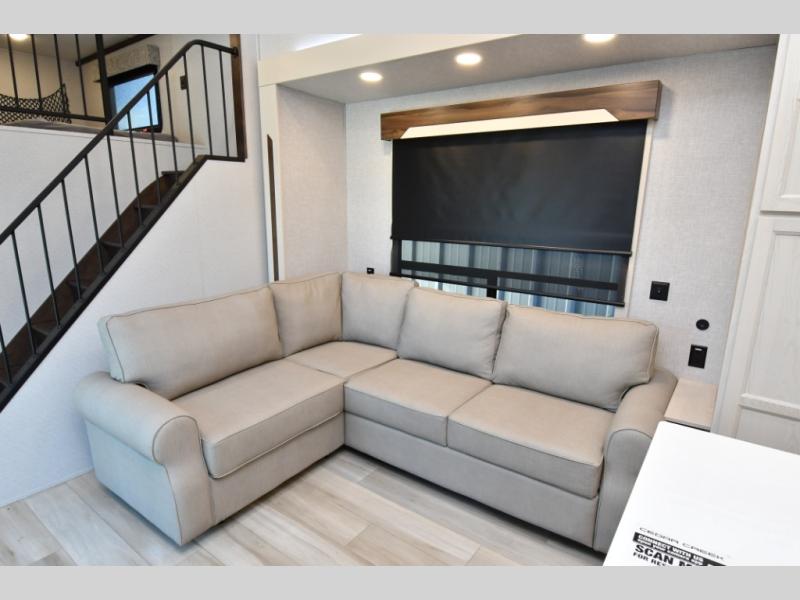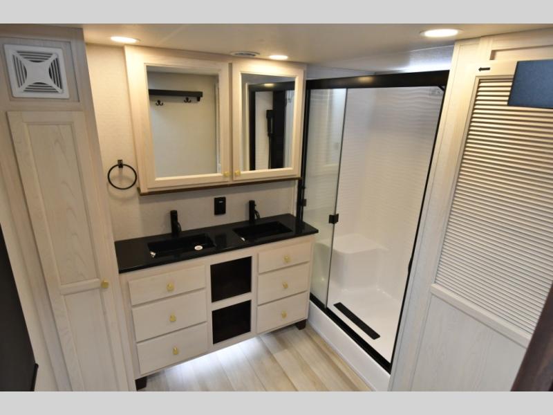 Built for lasting comfort and durability, the Cedar Creek Cottage features 3M bonded sidewalls resistant to UV, heat, oil, and moisture, along with an AlphaPly TPO roof membrane and new waterproof, bug-proof Vixenite slide room floor panels. Residential touches throughout include self-closing dovetail drawers, flush-floor slides, luxurious bedding, a residential headboard, dual sink vanity, and ample storage in the bedroom and bath. Pre-wired for satellite and equipped with a CradlePoint WiFi/5G antenna, you’ll stay connected even in remote locations.