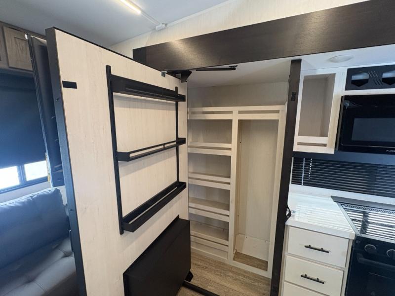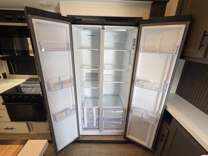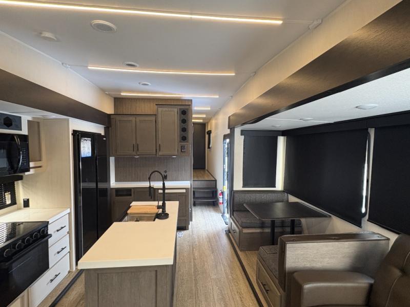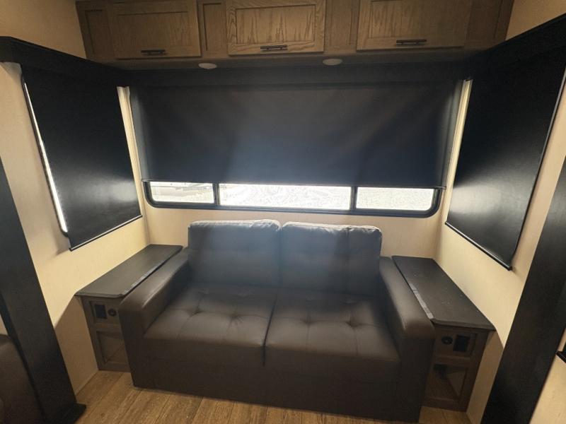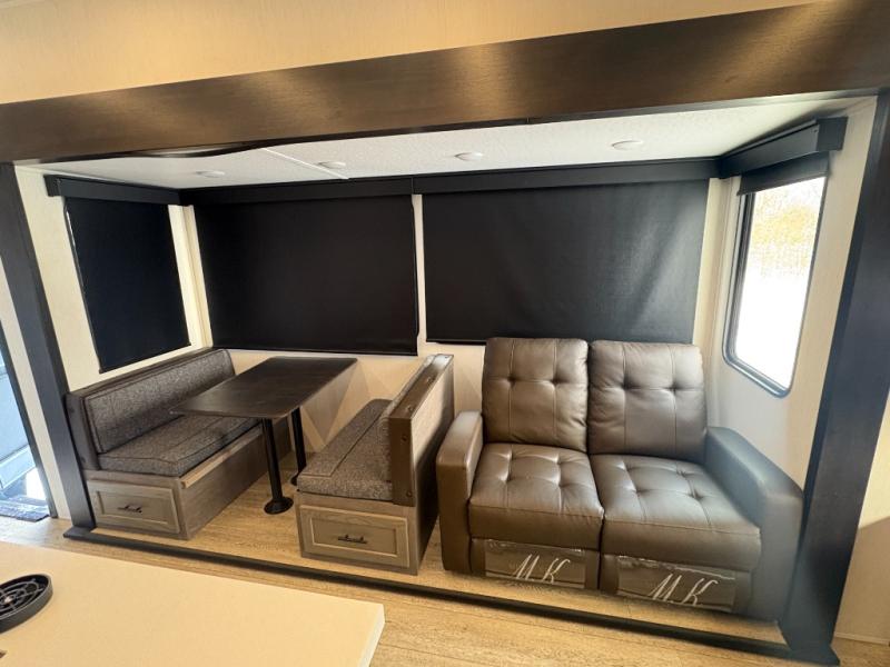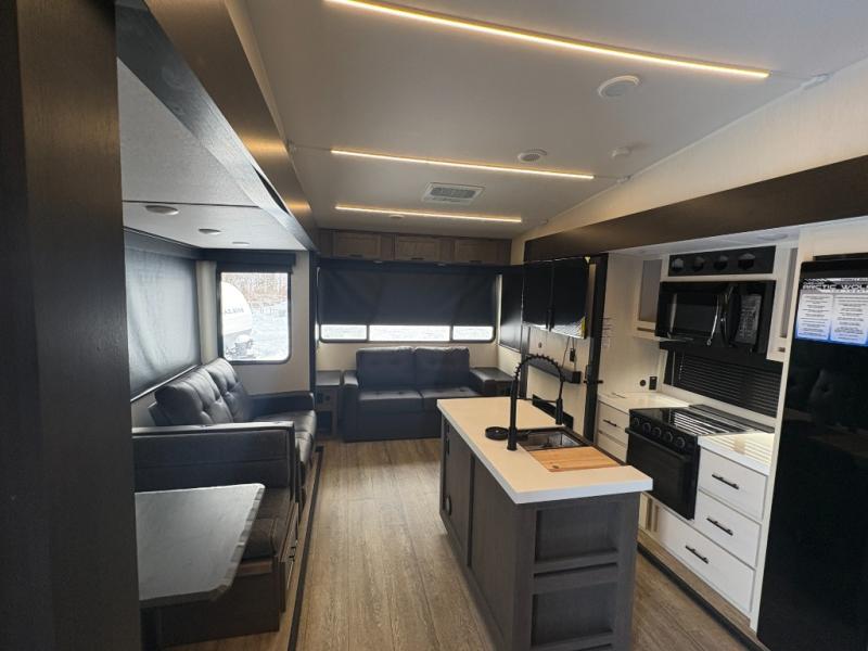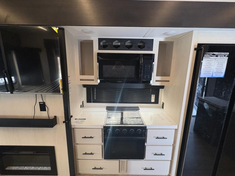 You have excellent sleeping accommodations on this Cherokee Arctic Wolf Suite fifth wheel! There is a private bedroom with a king-size bed at the front for you, and the second bedroom contains two 28" x 72" bunks and a jack knife sofa with trundle for any kids or friends you have traveling with you. A desk provides space to work or study. And it doesn't stop there. There is also a tri-fold sofa in the living area that you can use as a sleeping space. The kitchen is ready for you to make meals on the three-burner range, and you have plenty of work space with a pull-out countertop extension. You can enjoy your meals at the dinette, and after dinner relax on the theater seats across from the fireplace.