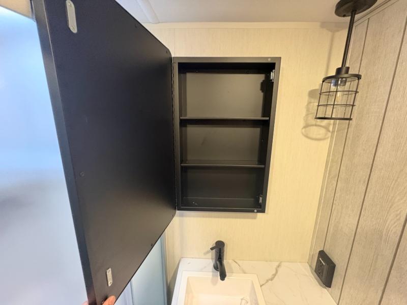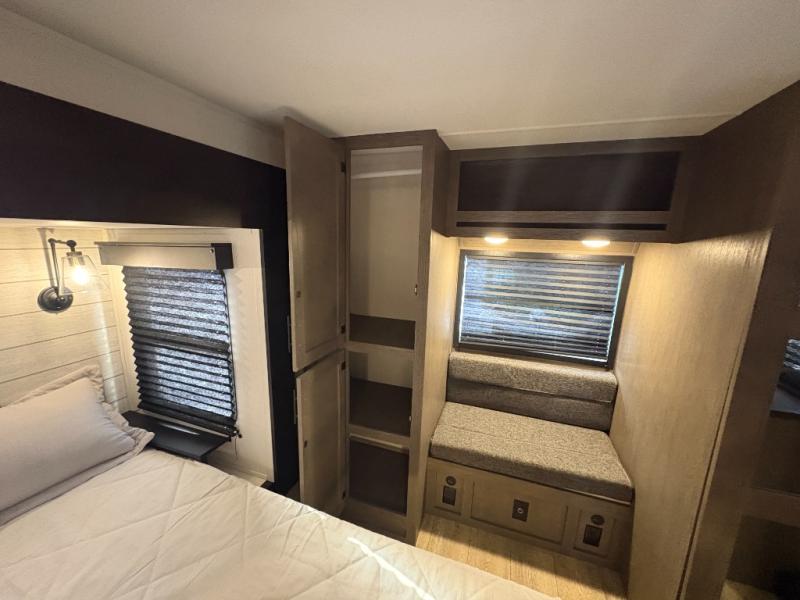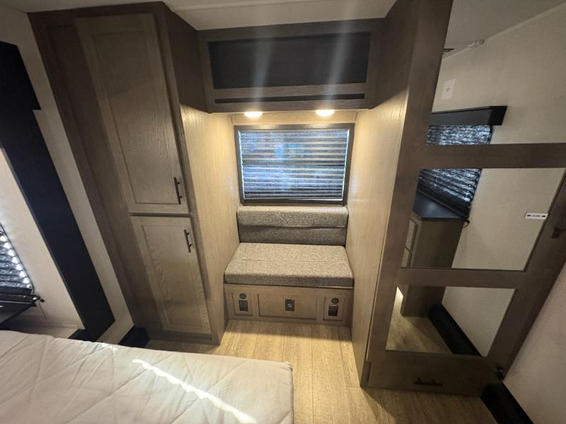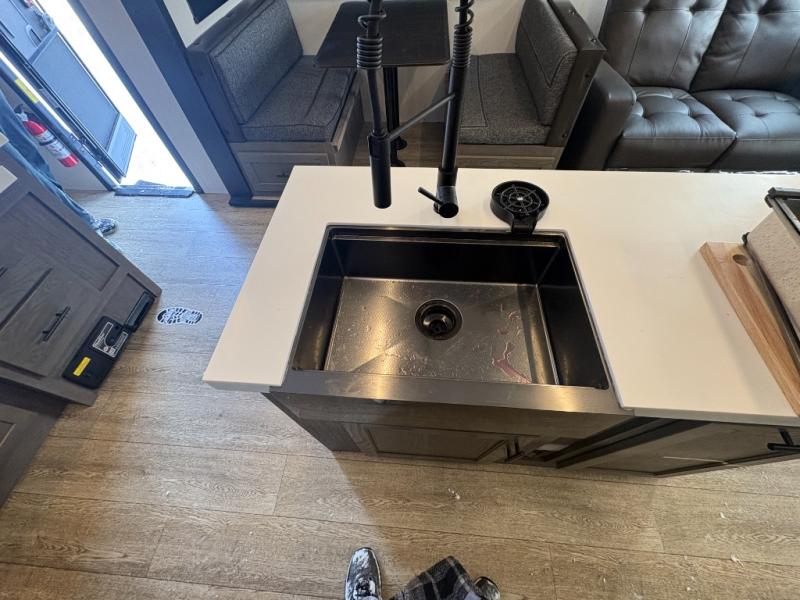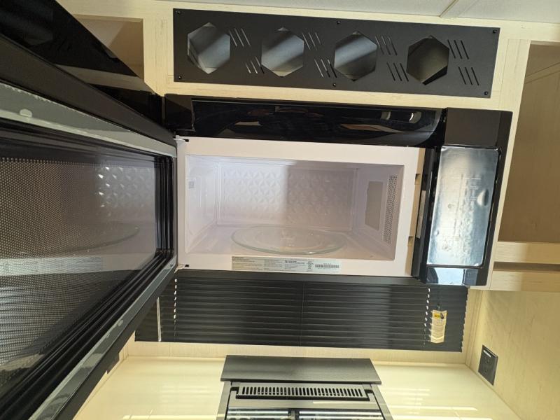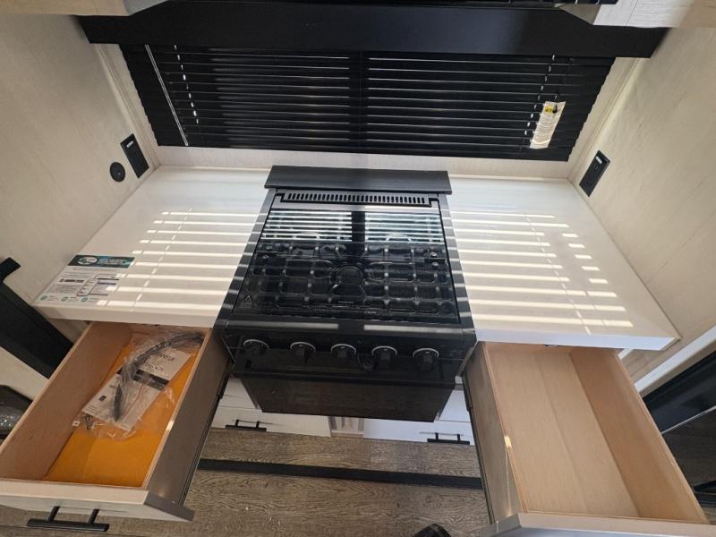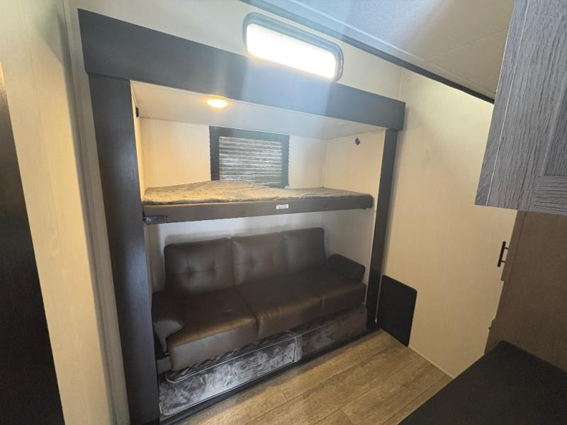 You have excellent sleeping accommodations on this Cherokee Arctic Wolf Suite fifth wheel! There is a private bedroom with a king-size bed at the front for you, and the second bedroom contains two 28" x 72" bunks and a jack knife sofa with trundle for any kids or friends you have traveling with you. A desk provides space to work or study. And it doesn't stop there. There is also a tri-fold sofa in the living area that you can use as a sleeping space. The kitchen is ready for you to make meals on the three-burner range, and you have plenty of work space with a pull-out countertop extension. You can enjoy your meals at the dinette, and after dinner relax on the theater seats across from the fireplace.
