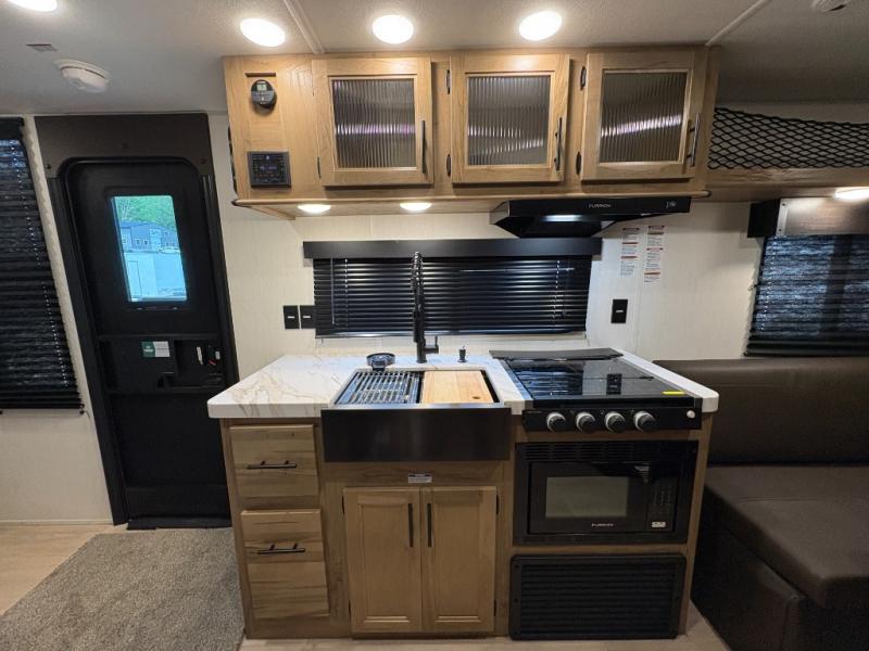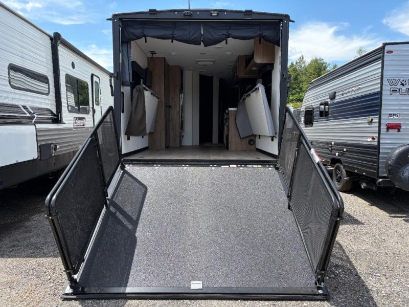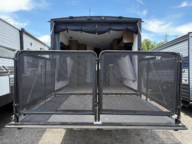 You will love this Cherokee Grey Wolf toy hauler with a rear ramp door for loading and unloading your toys and gear. If you position the fold-down sofas up against the wall, you will have even more room for extra gear when you are moving down the road. Set up camp and easily create a great dining area with the removable table between each fold-down sofa. You can also create your best meals in a breeze with the airy fryer or cooktop. A large pantry allows you to pack all of the snacks and canned goods you need for your adventure. You will appreciate the master suite up front for a great night's rest on the RV king bed along with easy access into the dual-entry bath.