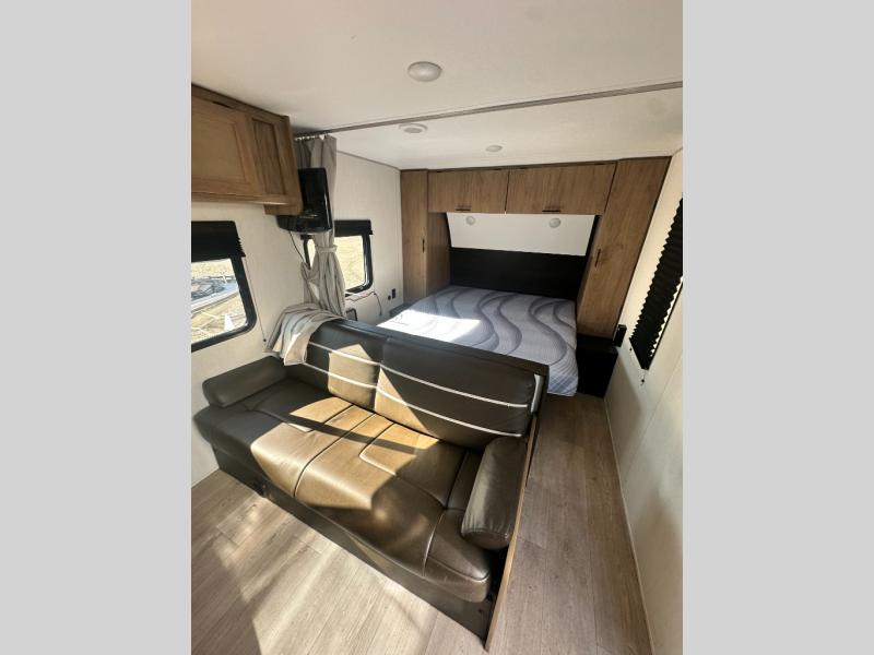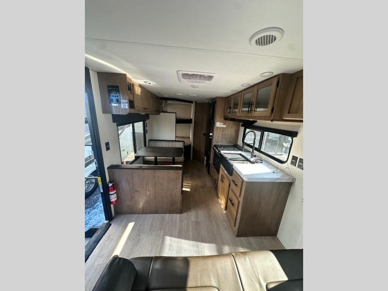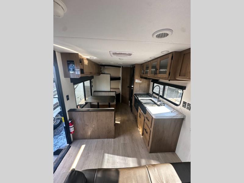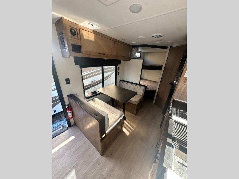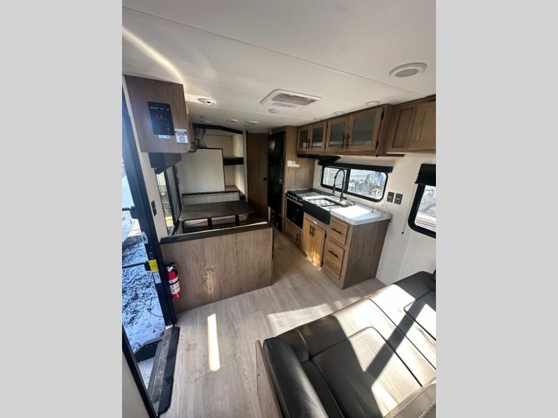 Come on inside this Cherokee Grey Wolf travel trailer and experience the convenience of a smooth flow of traffic in and out with two entry doors. The rear door leads into a full bath which is great for accessibility. Once inside, you will notice the large U-shaped dinette and the sofa which sit on the slide and create a spacious footprint for moving about, as well as great places to play games and socialize with your friends and family. A walk-in pantry provides plenty of storage allowing you to stock up on your favorite snacks and dry goods for your family adventure. At night, there is sleeping space for everyone between the double-size bunks and the RV king bed, plus the furniture.