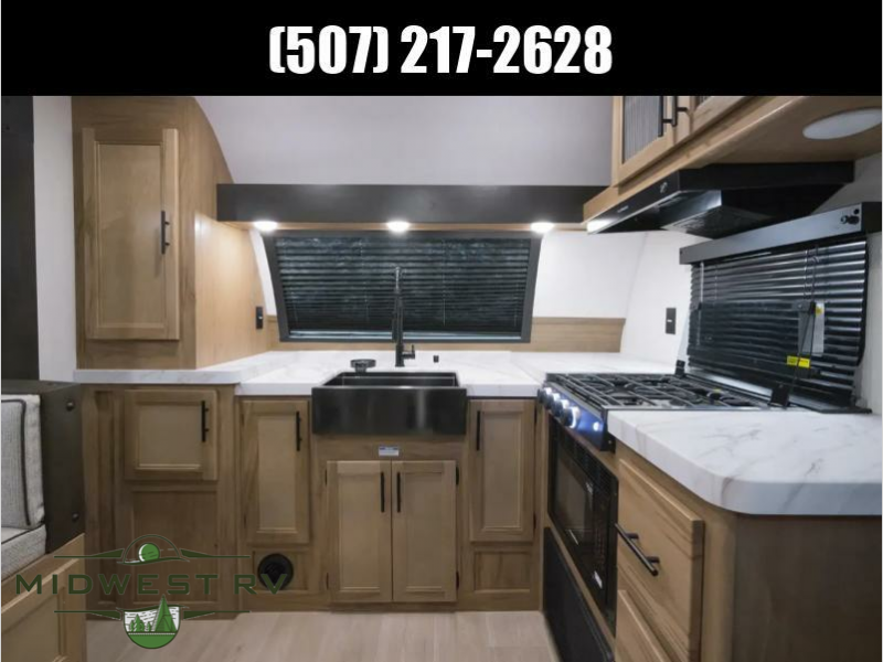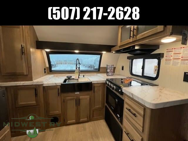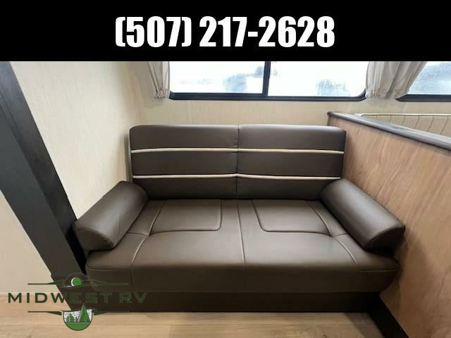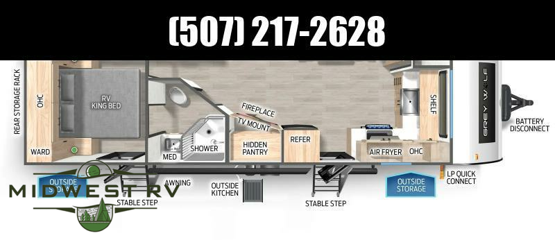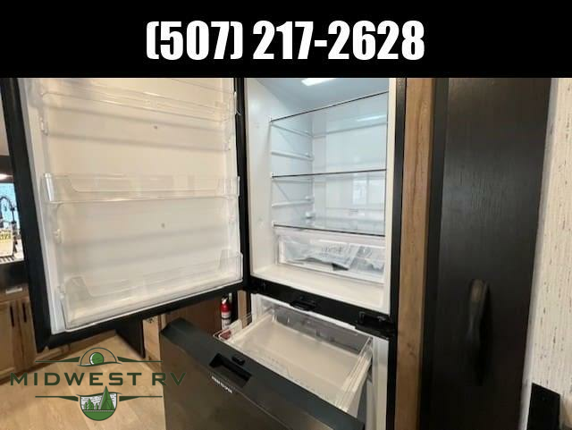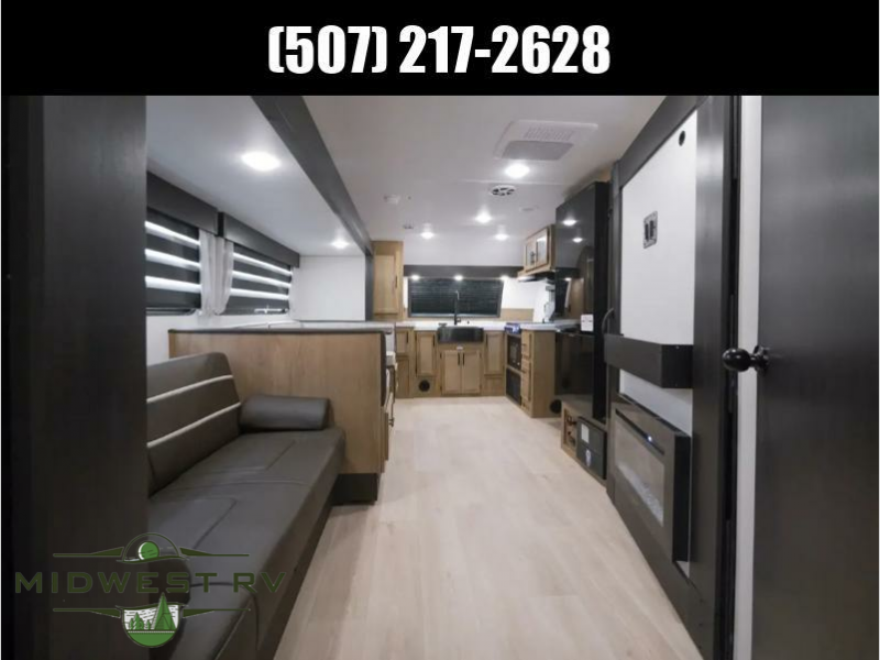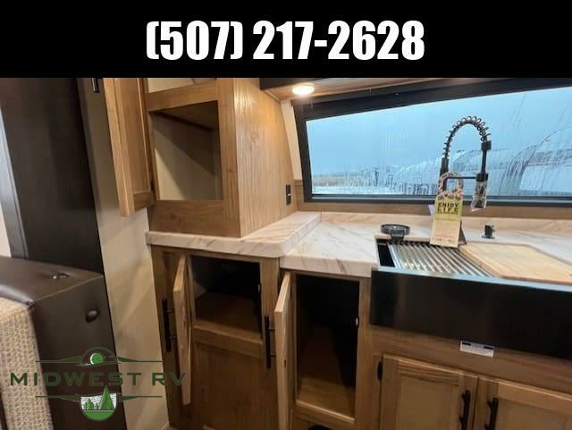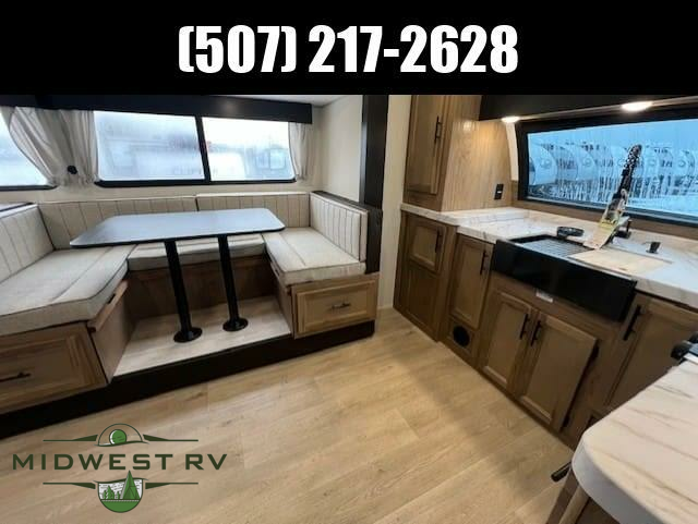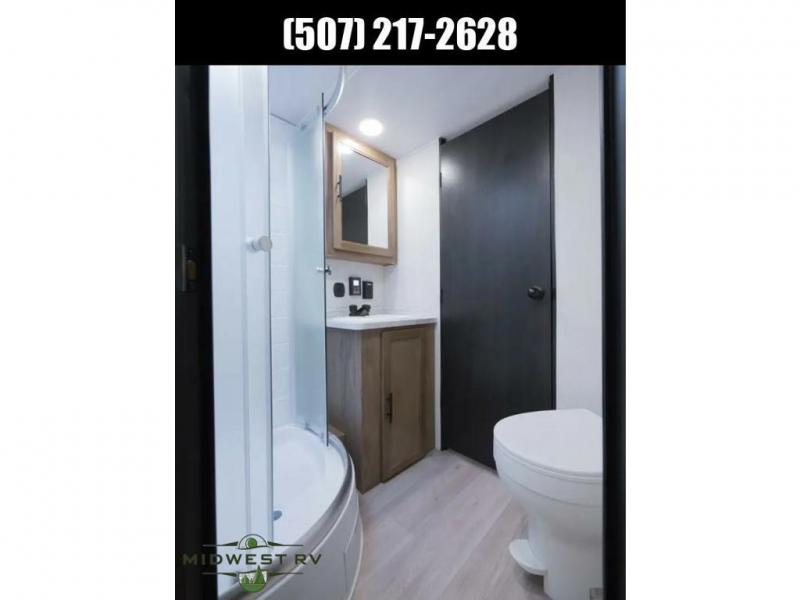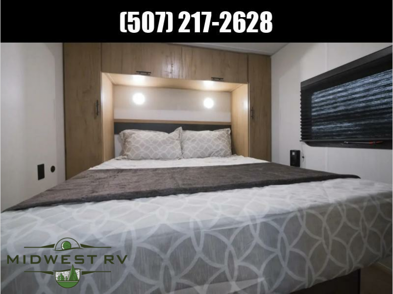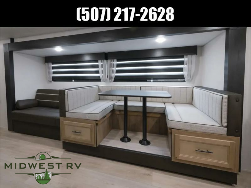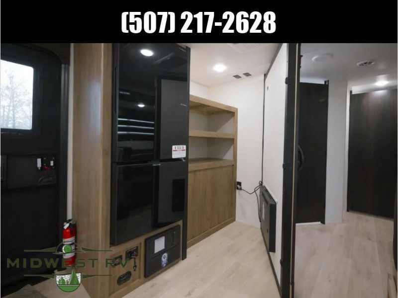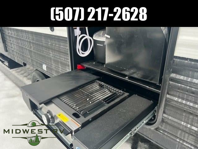 Since this travel trailer features dual entry doors, you can enter in through the rear master bedroom or the front kitchen; how convenient! The kitchen includes ample counter space and all the appliances to prep meals, along with a pantry up front and a hidden pantry behind the fireplace. Your crew can get comfortable on the sofa or play a game at the booth dinette, although you may just find yourselves outdoors since there is an outside kitchen and a power awning with LED lights. The dual entry bath will let you enter in through the main living area, plus it has a private entrance into the bedroom. Here, you'll find an RV king bed, dual wardrobes for your things, and USB ports to keep your electronics charged!