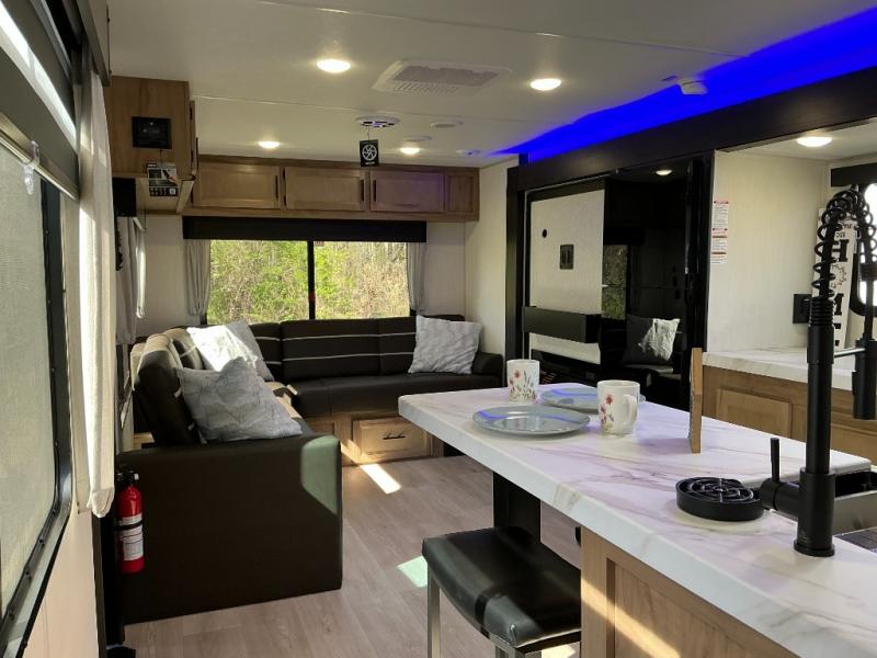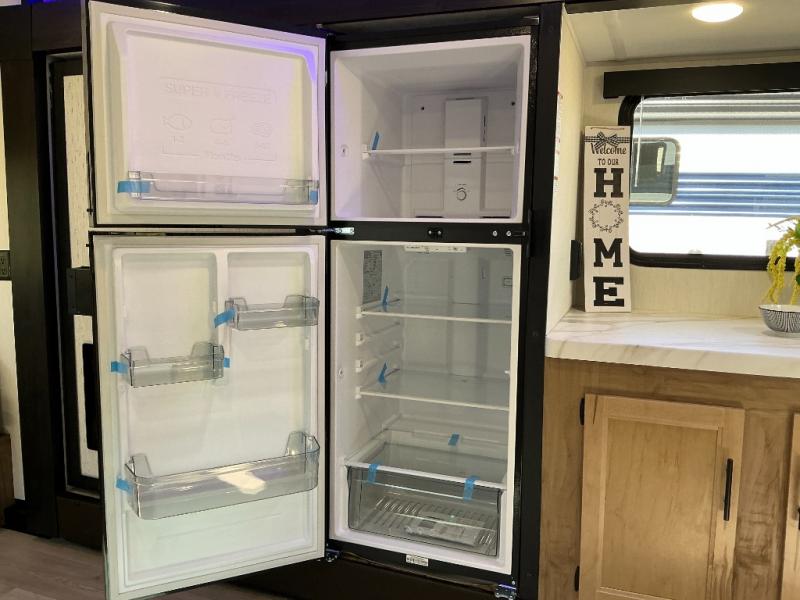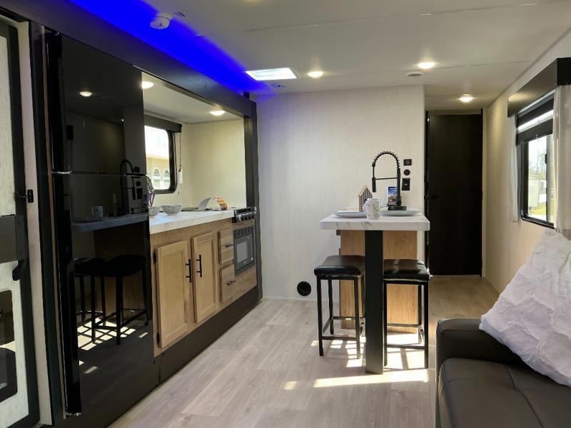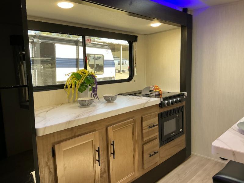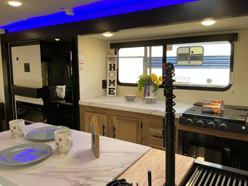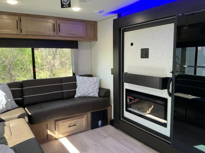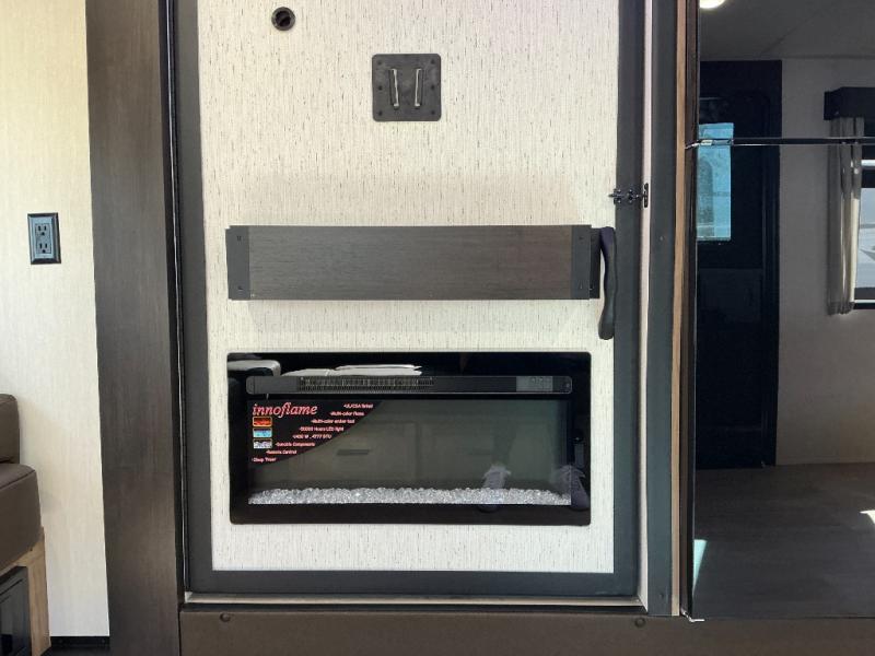 This travel trailer will feel just like home with its RV king bed in the front bedroom plus the full bath with a tub/shower, and there is a spacious living area thanks to the large slide out. Here, you'll find the air fryer and counter space, 12V refrigerator, and the fireplace with a hidden pantry behind it. Your crew can relax on the L-shaped sofa, or visit with the chef while they prep meals at the island peninsula. There are even two bar stools here for added convenience. Head outdoors to enjoy the power awning with LED lights in the evening!