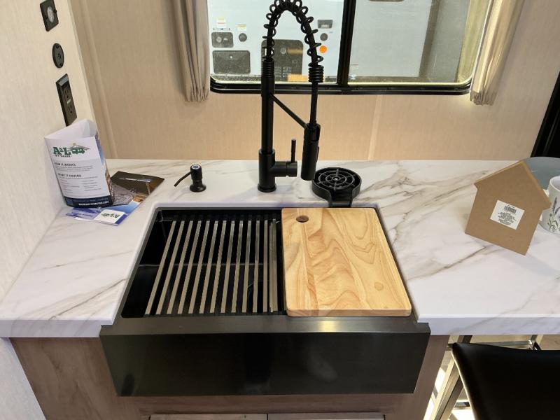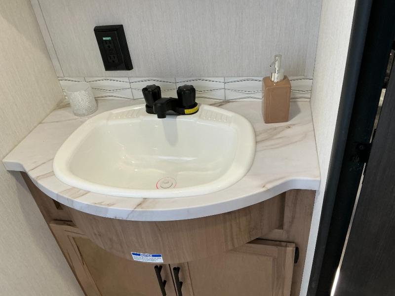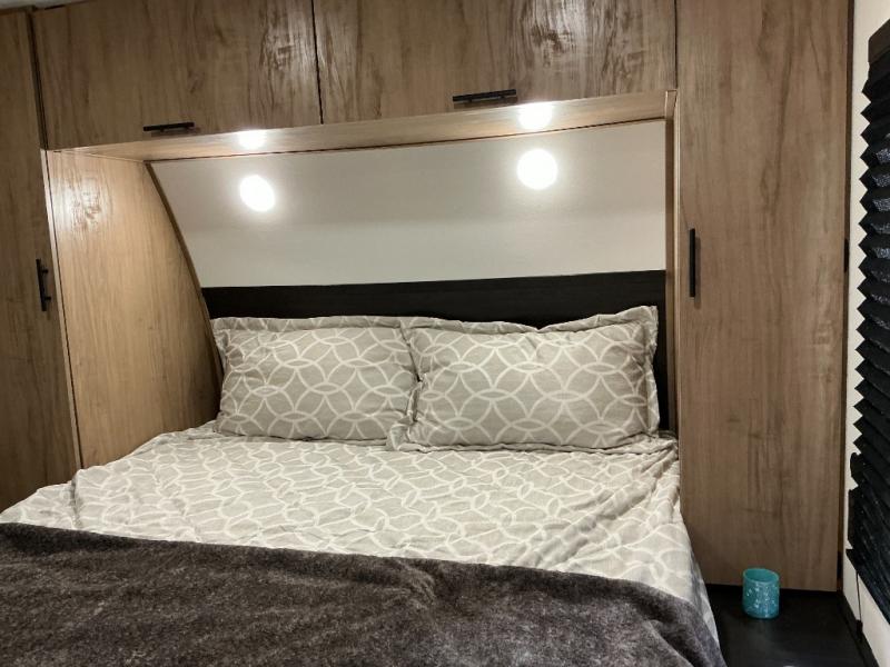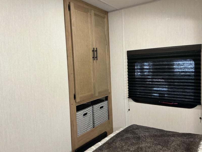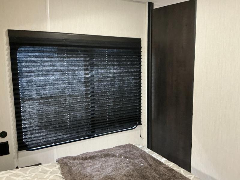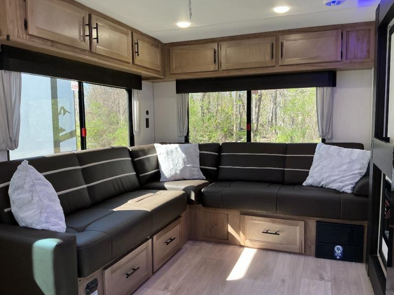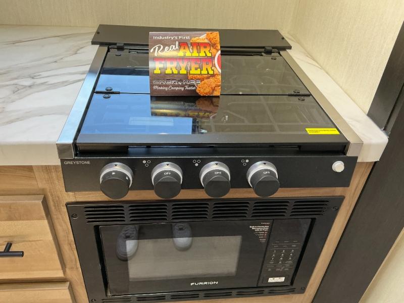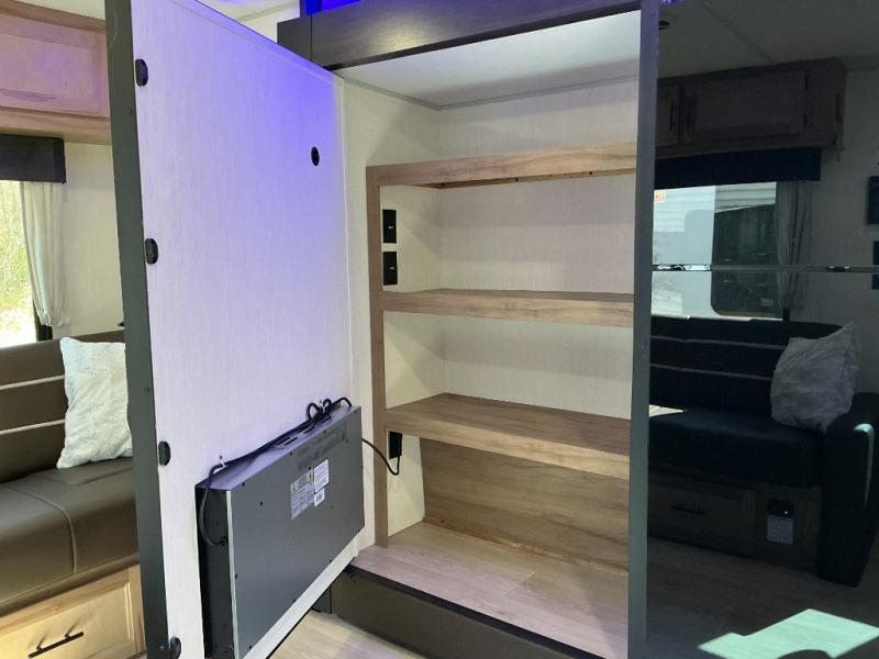 This travel trailer will feel just like home with its RV king bed in the front bedroom plus the full bath with a tub/shower, and there is a spacious living area thanks to the large slide out. Here, you'll find the air fryer and counter space, 12V refrigerator, and the fireplace with a hidden pantry behind it. Your crew can relax on the L-shaped sofa, or visit with the chef while they prep meals at the island peninsula. There are even two bar stools here for added convenience. Head outdoors to enjoy the power awning with LED lights in the evening!