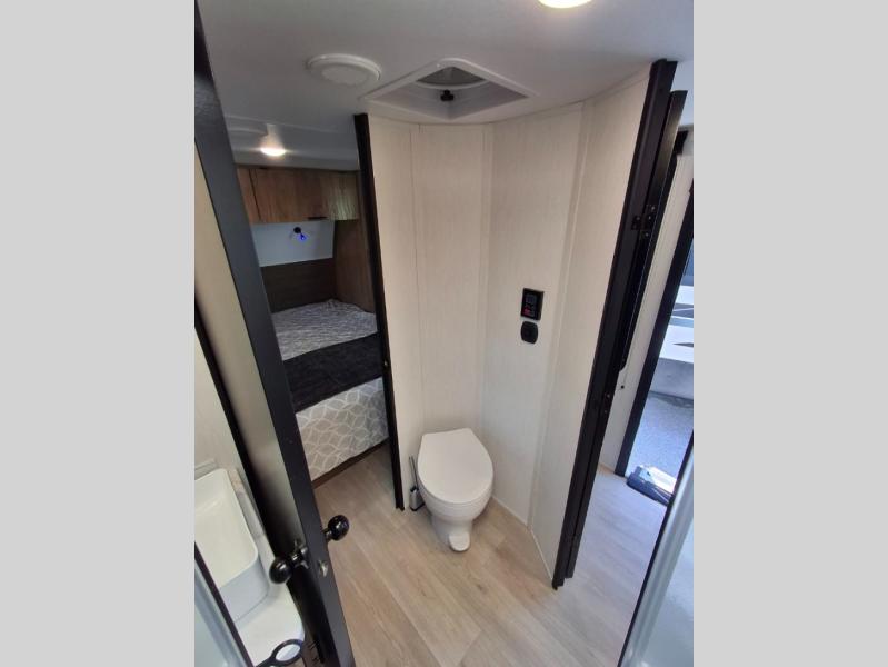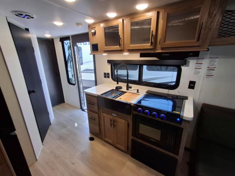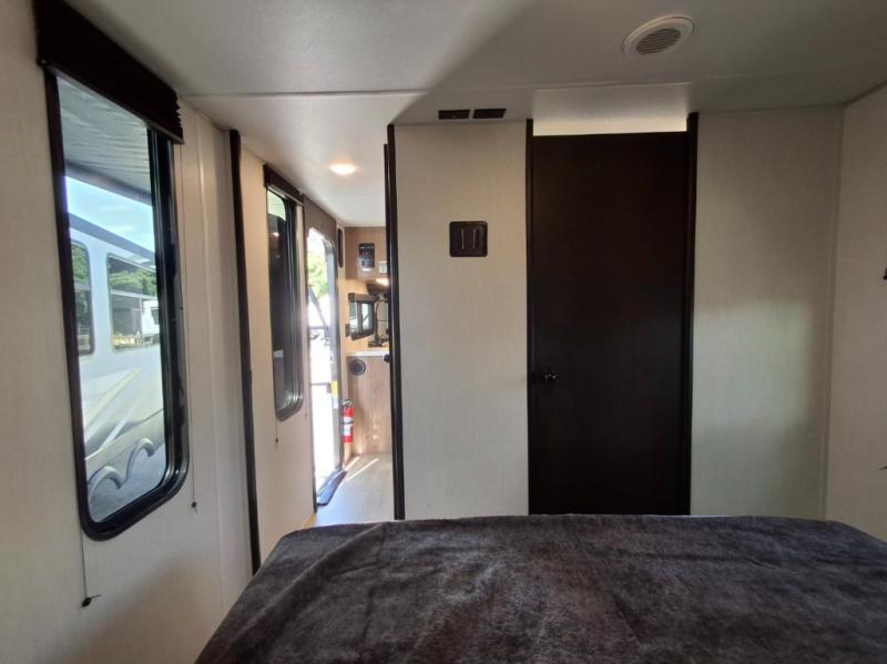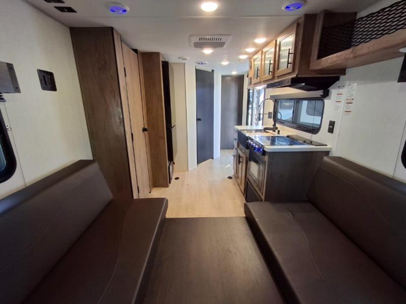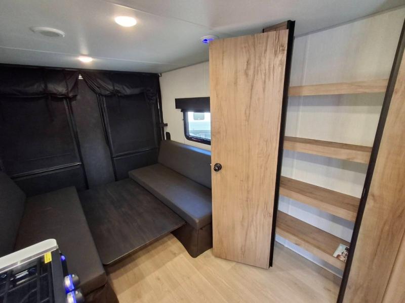You will love this Cherokee Grey Wolf Black Label toy hauler with a rear ramp door for loading and unloading your toys and gear. If you position the fold-down sofas up against the wall, you will have even more room for extra gear when you are moving down the road. Set up camp and easily create a great dining area with the table between each fold-down sofa. You can also create your best meals in a breeze with the air fryer, and a large pantry allows you to pack all of the snacks and canned goods you need for your adventure. You will appreciate the master suite up front for a great night's rest on the RV king bed along with easy access into the dual-entry bath.