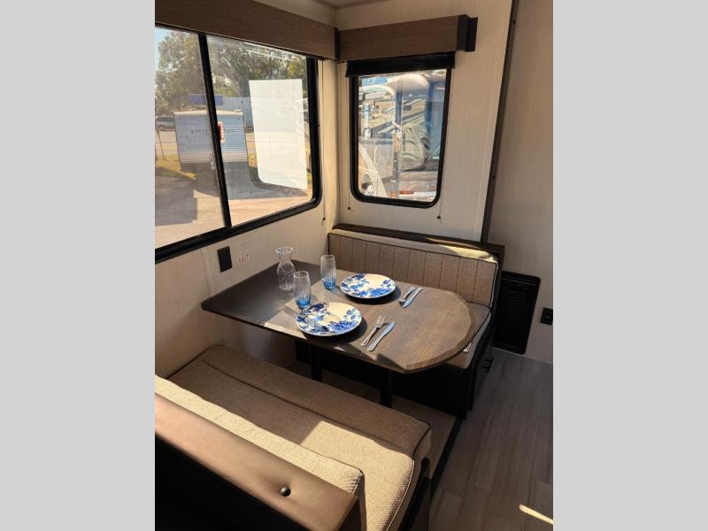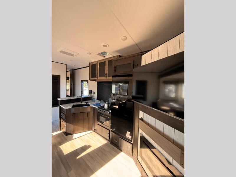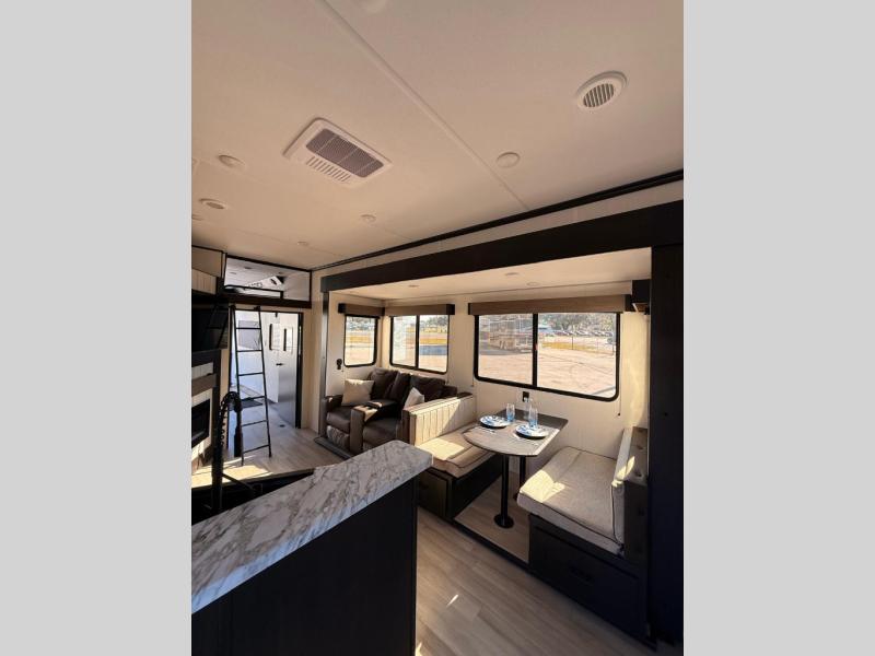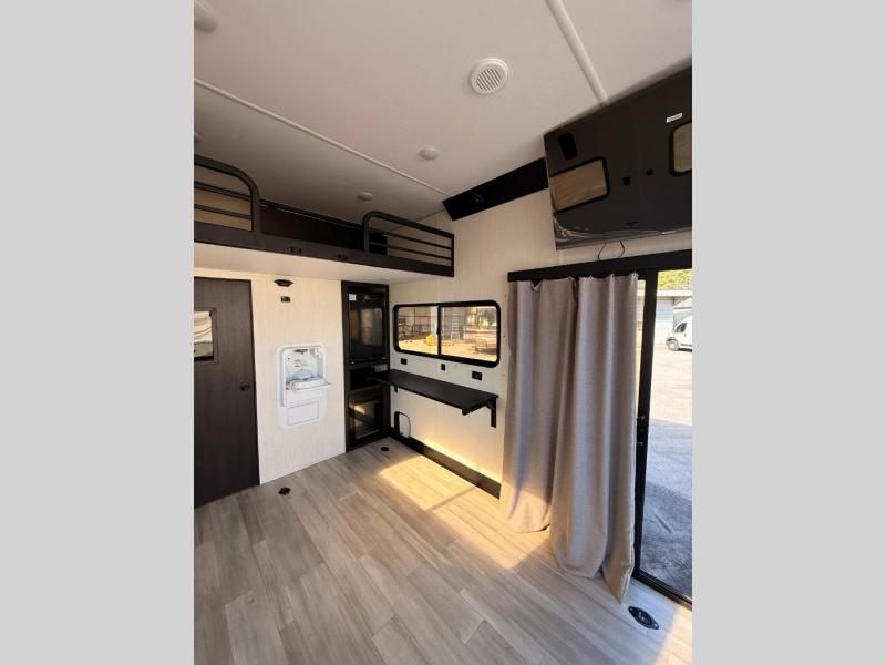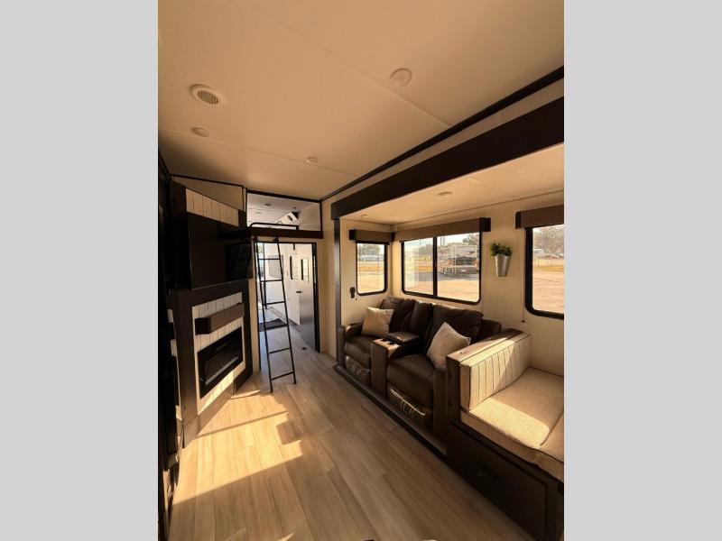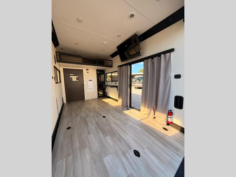 Fun at the campground begins with this dual entry toy hauler in tow! There is a 15' separate garage with glass patio doors, a loft above for guests, plus a patio deck to entertain guests. Your crew can get comfy on the theater seating or booth dinette, and there is an entertainment center with a fireplace and a hidden pantry for snacks. The chef of your group will love the full interior kitchen, along with an outdoor kitchen when the weather is nice. A full bath lets you freshen up after a trail ride, and the front private bedroom gives you your own space at night. This unit also features washer and dryer prep in the bedroom so you can add those appliances if you wish!
